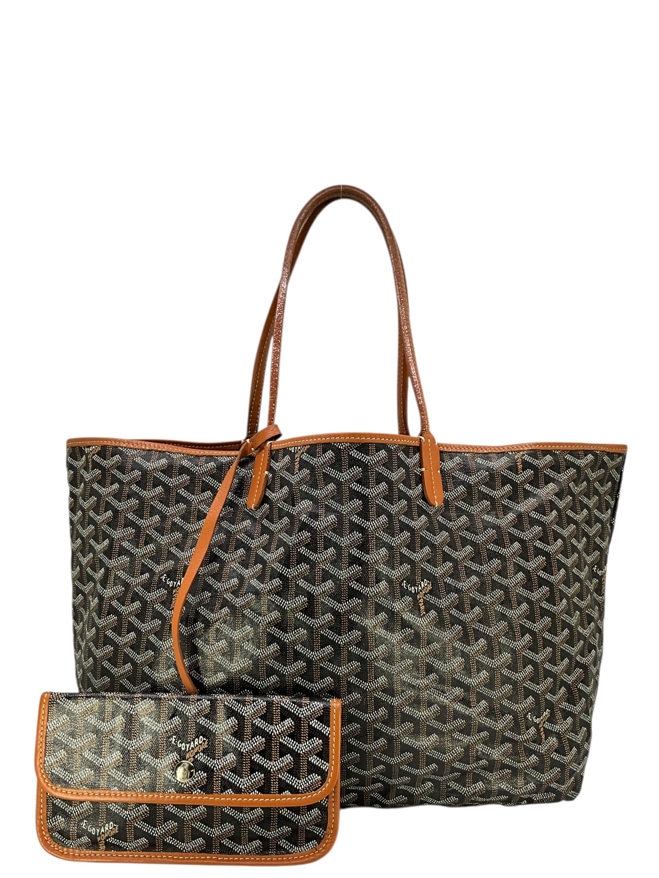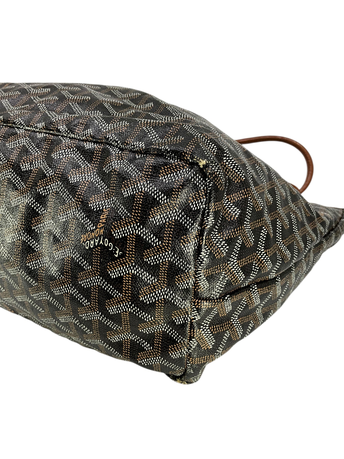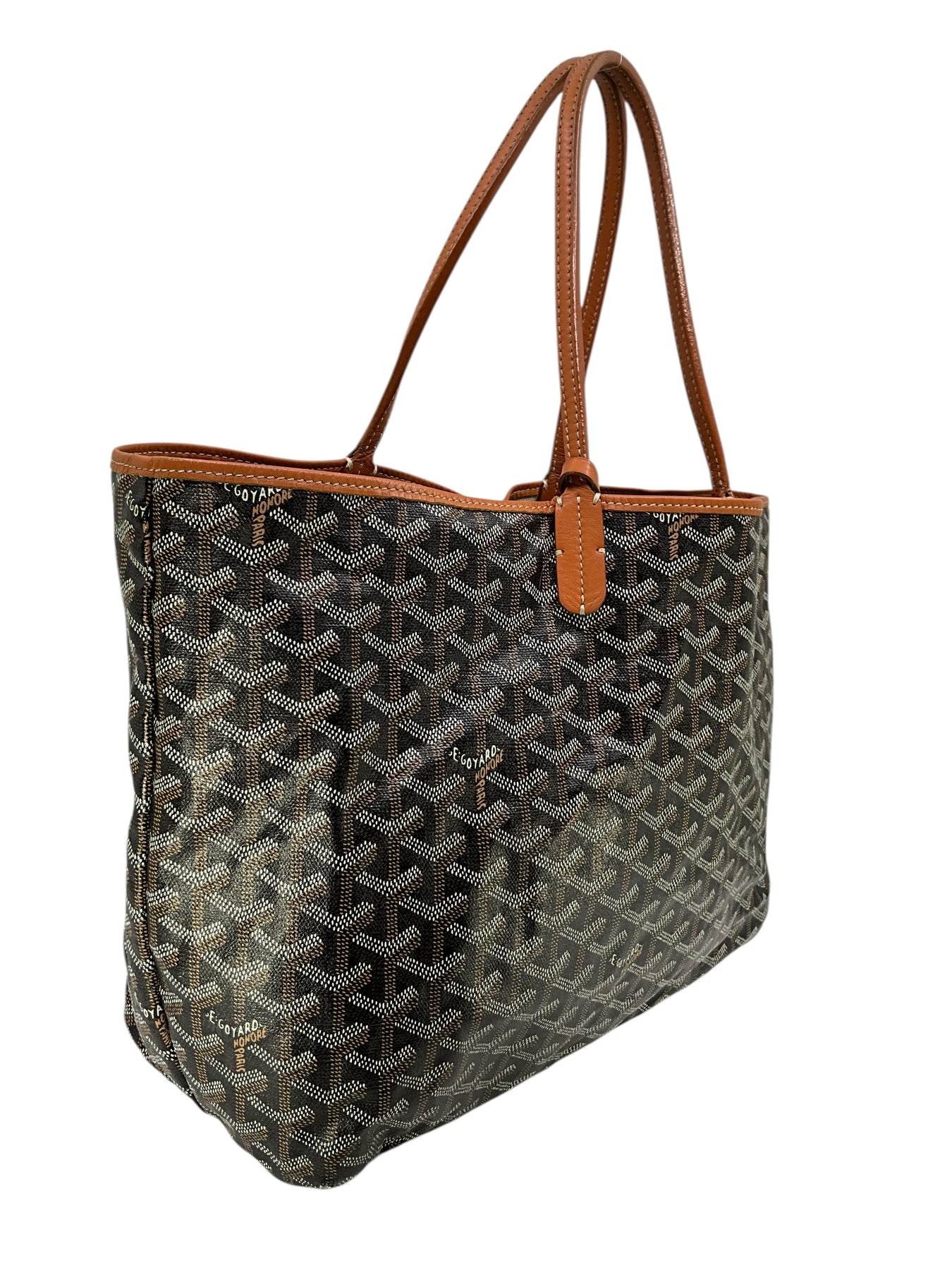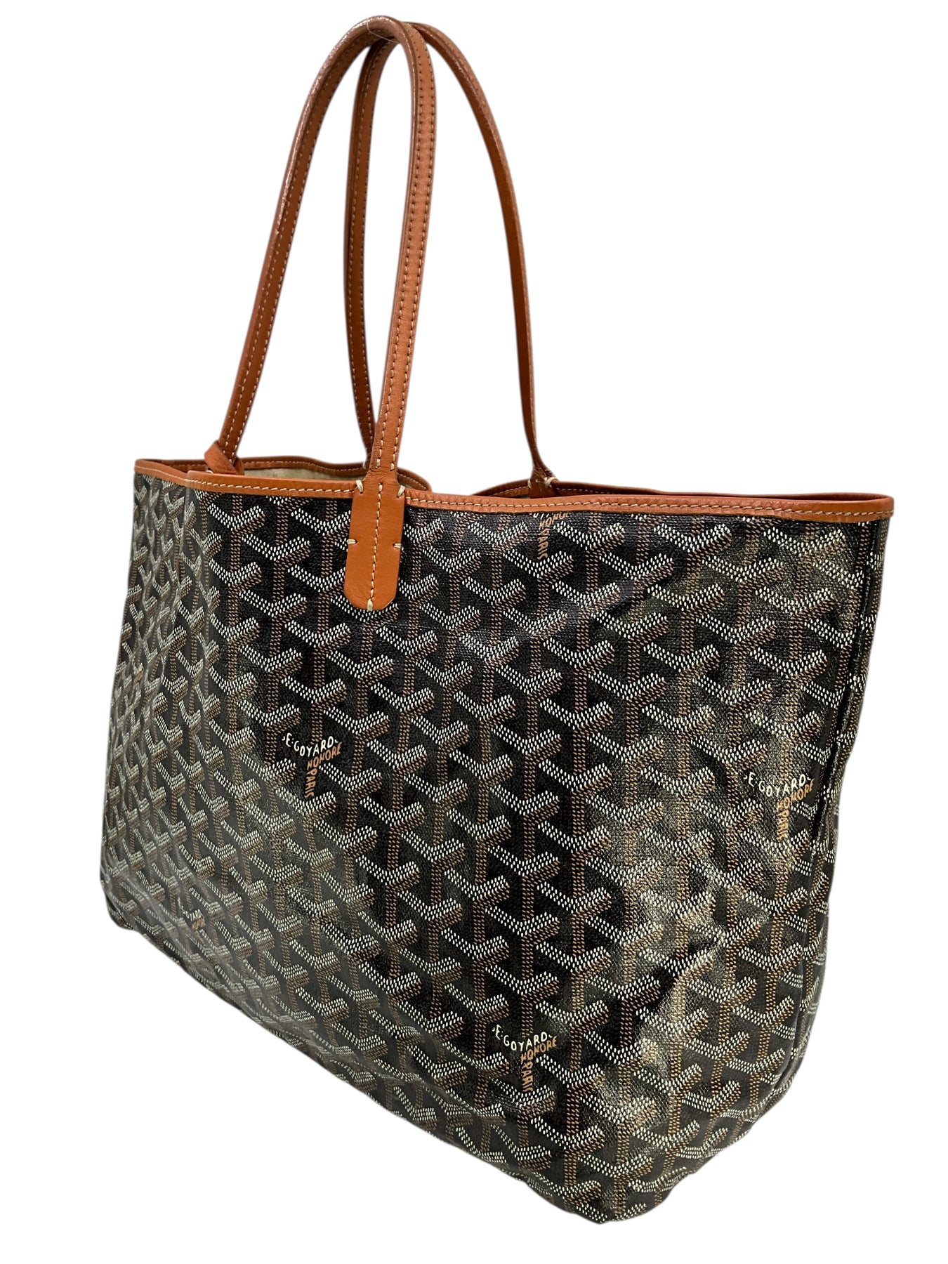 We guarantee the authenticity of this gorgeous GOYARD Goyardine St. Louis PM Tote Bag crafted from Goyard's classic black and white 'Y' printed chevron monogram coated canvas with a brown leather trim. This stylish bag features dual flat leather shoulder straps and an ultra-spacious interior, roomy enough for all essentials with a hanging pochette.