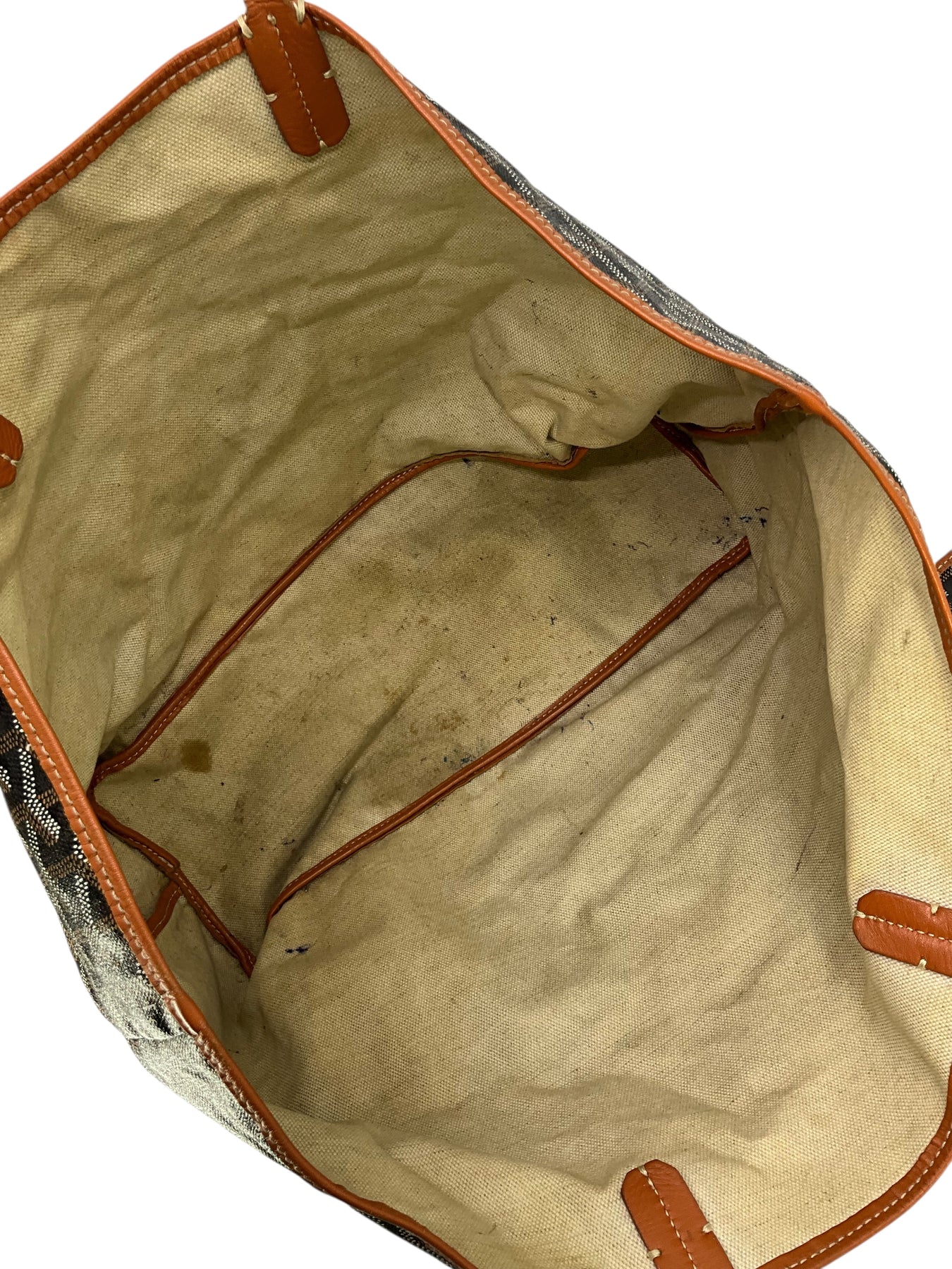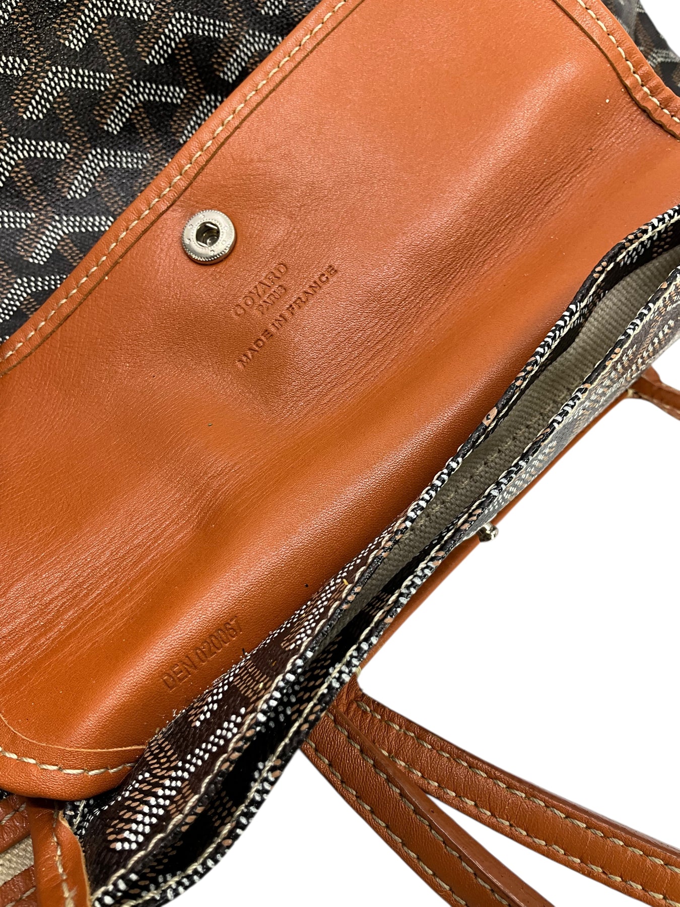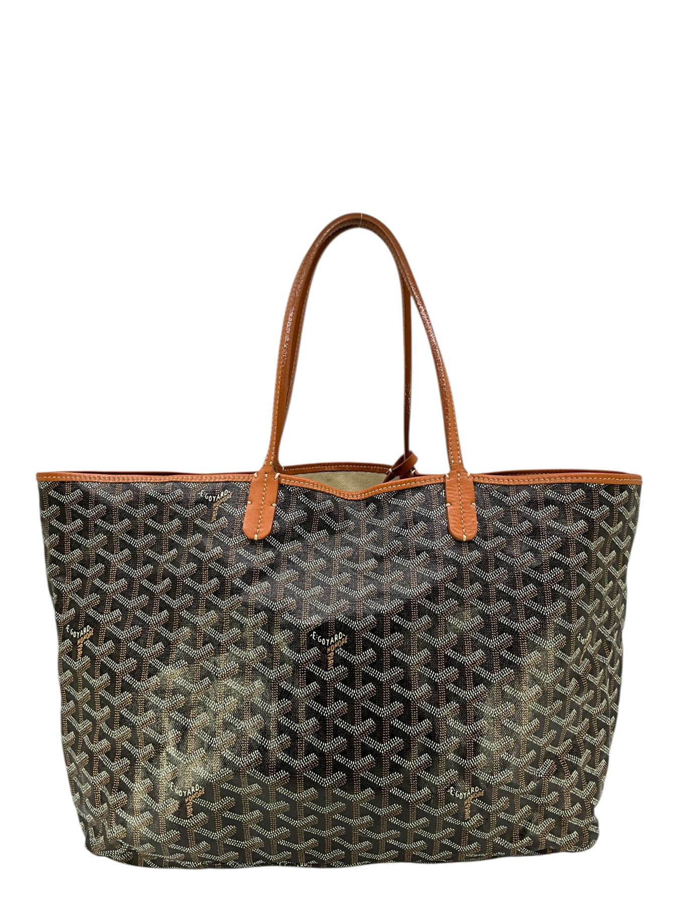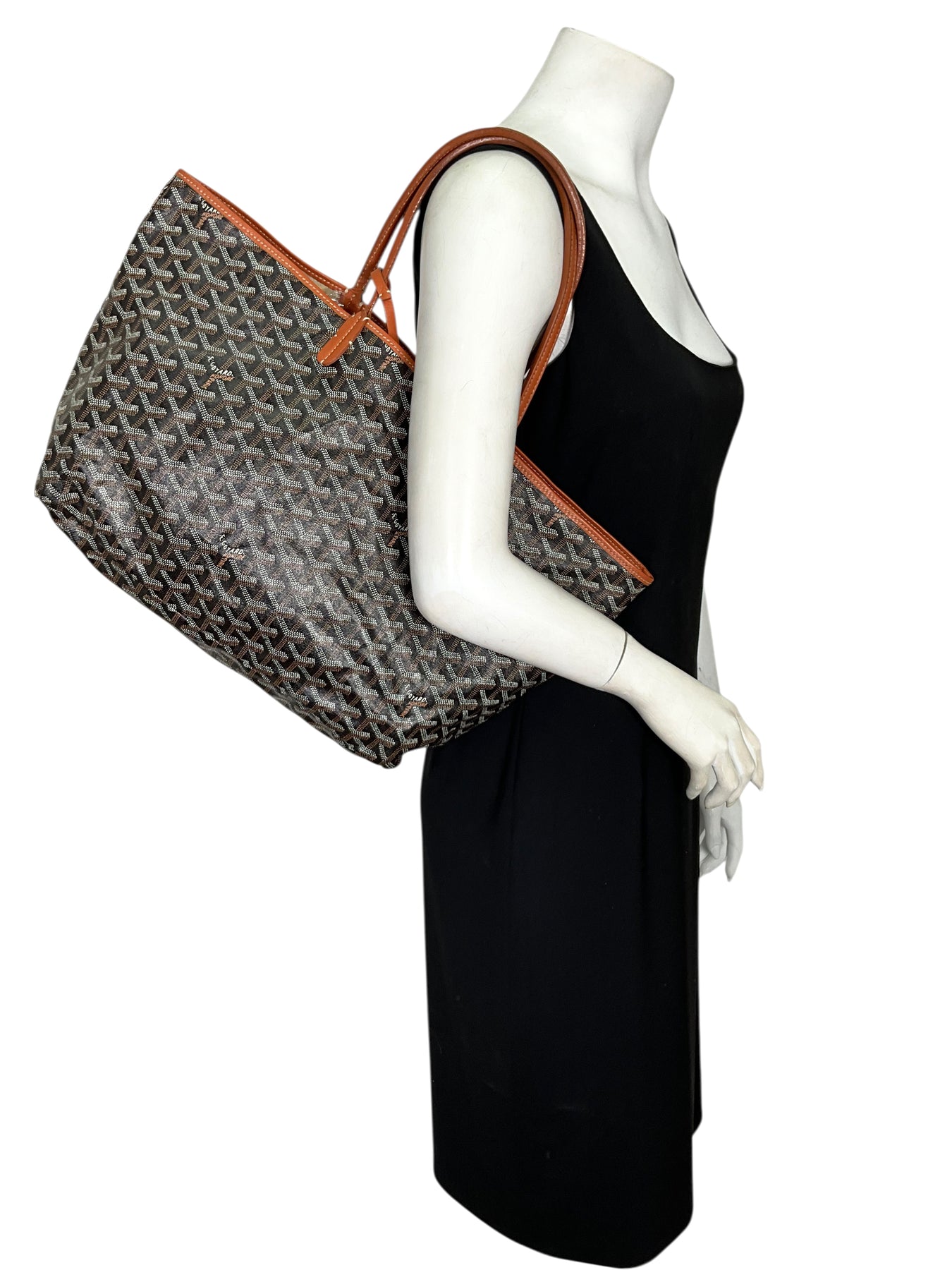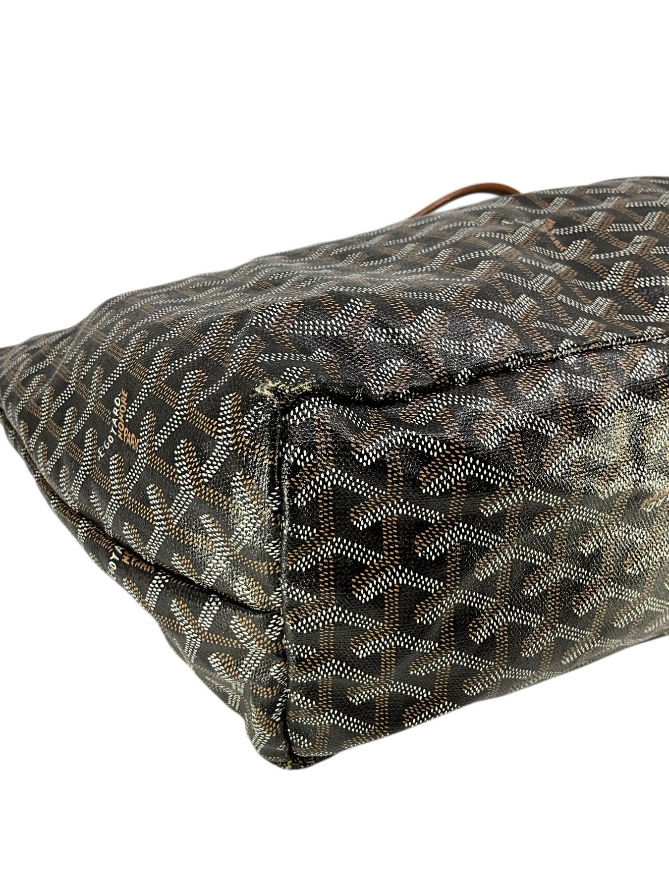 We guarantee the authenticity of this gorgeous GOYARD Goyardine St. Louis PM Tote Bag crafted from Goyard's classic black and white 'Y' printed chevron monogram coated canvas with a brown leather trim. This stylish bag features dual flat leather shoulder straps and an ultra-spacious interior, roomy enough for all essentials with a hanging pochette.