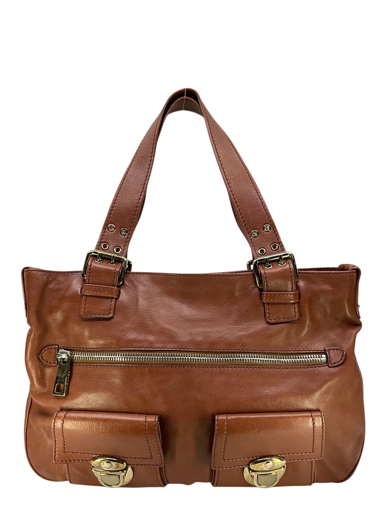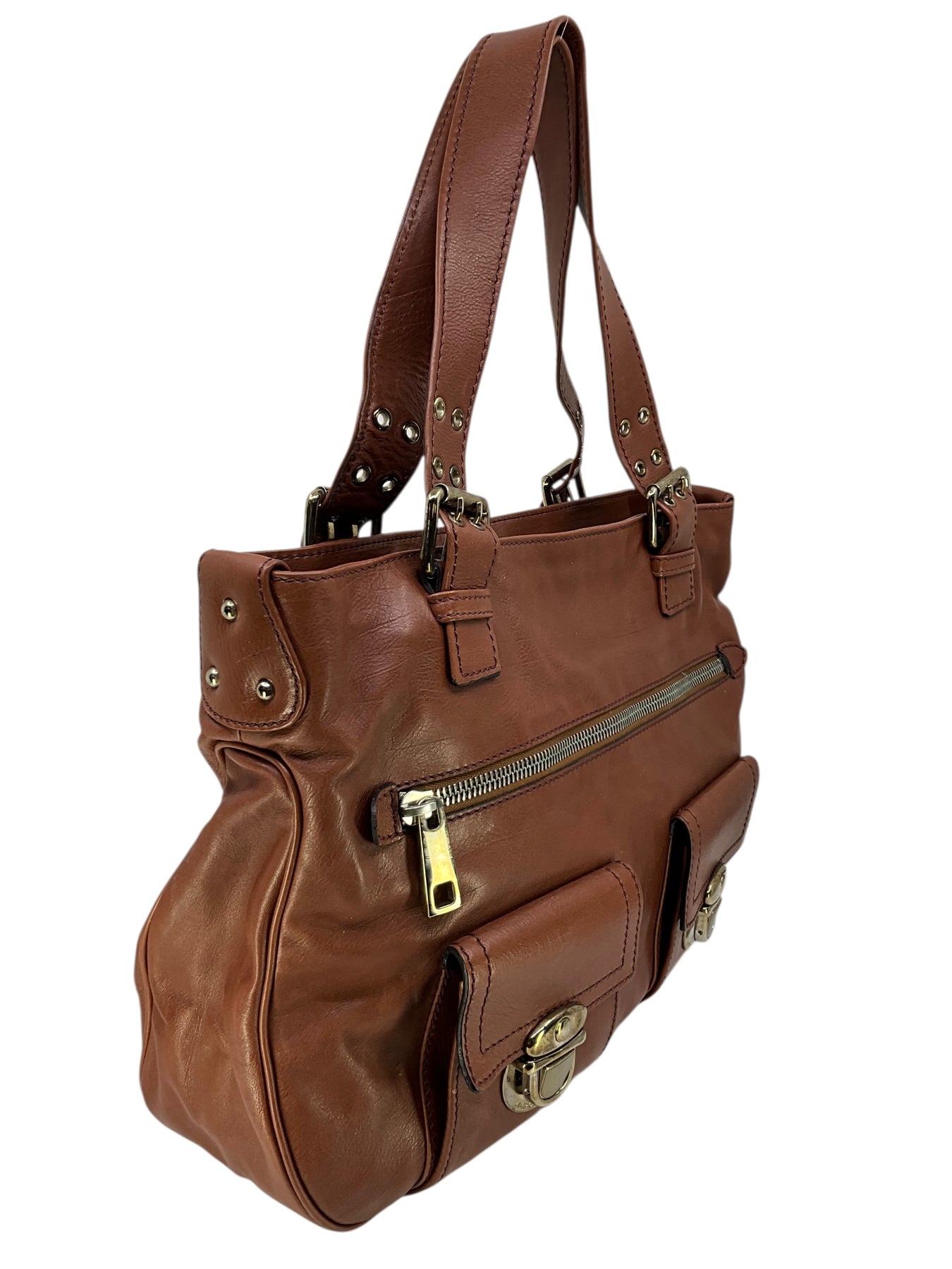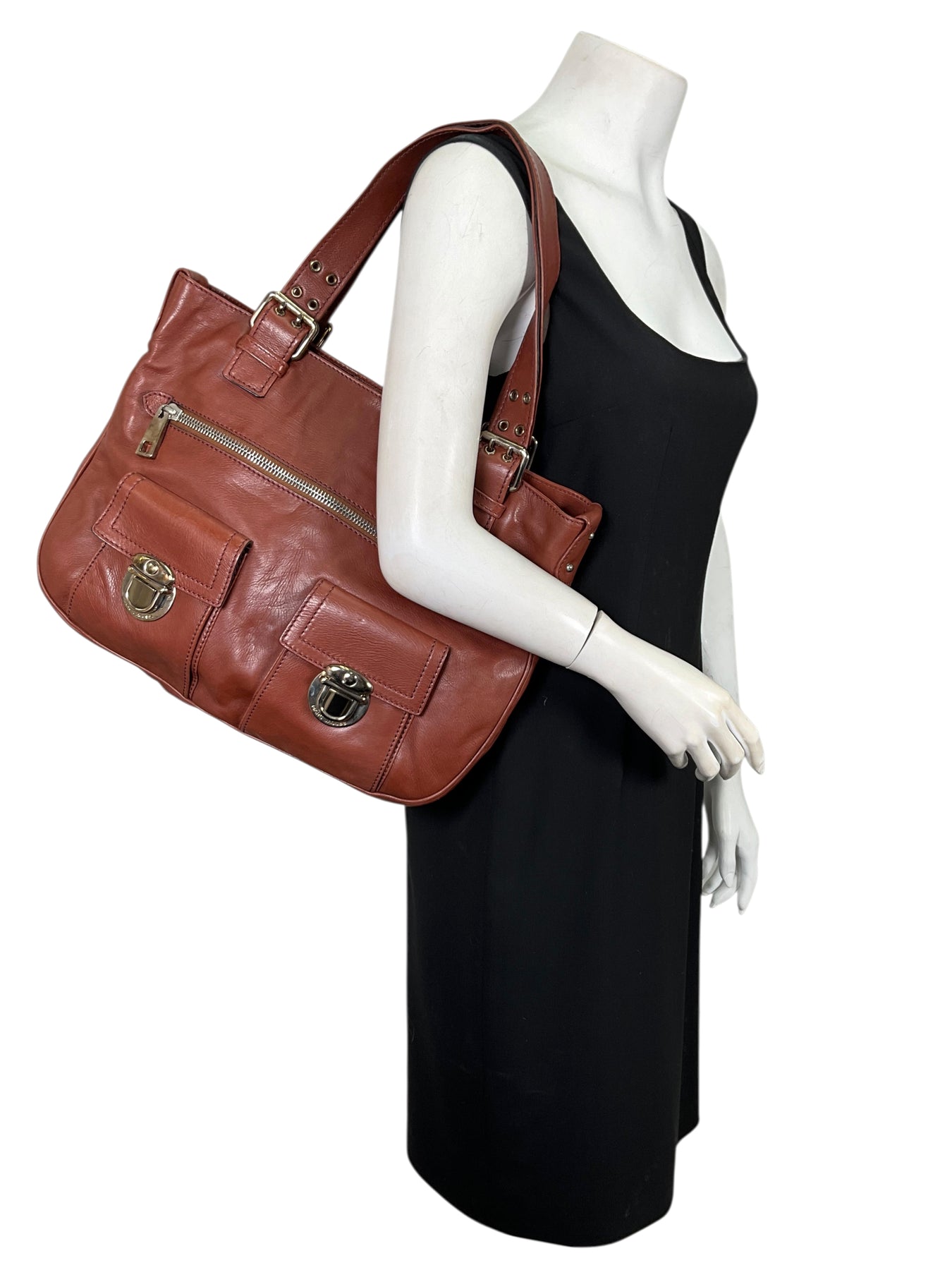 This guaranteed authentic Marc Jacobs Calfskin Large New Stella Bag makes for the perfect everyday carry-all. Expertly crafted in Italy from stunning brown leather and silver-tone hardware. It features double adjustable flat leather shoulder straps, a functional exterior zip compartment and dual logo-engraved push-lock pockets.