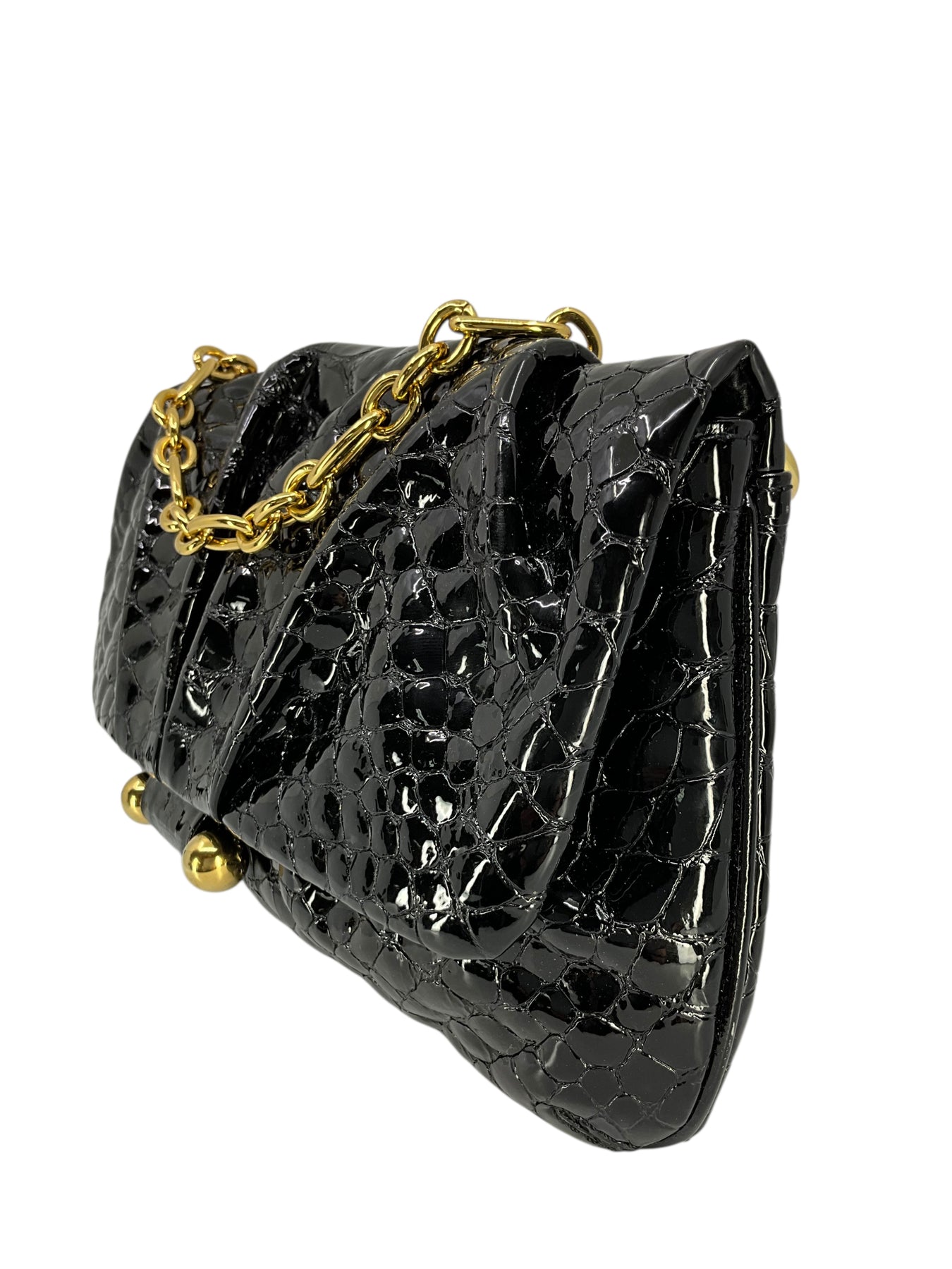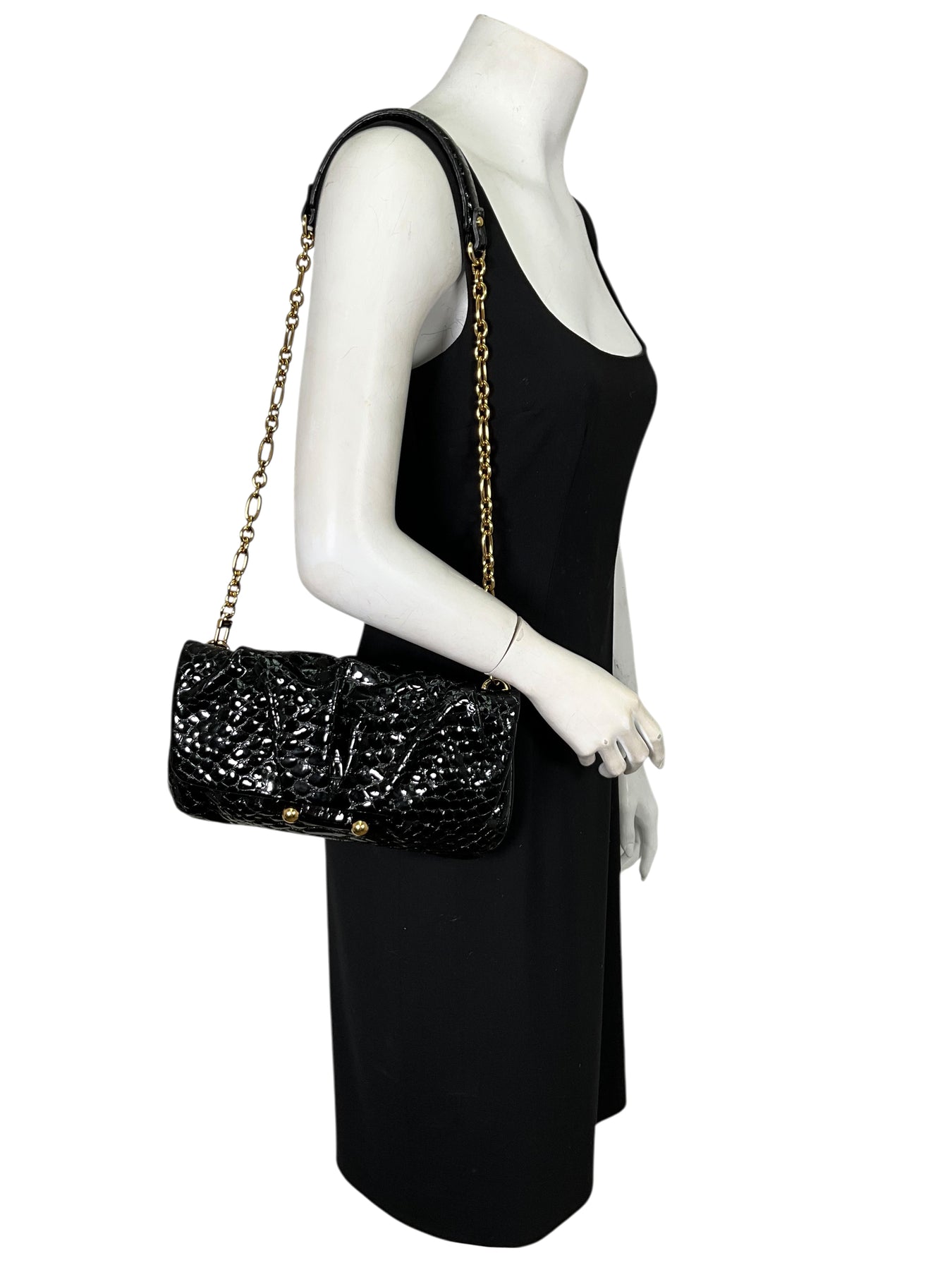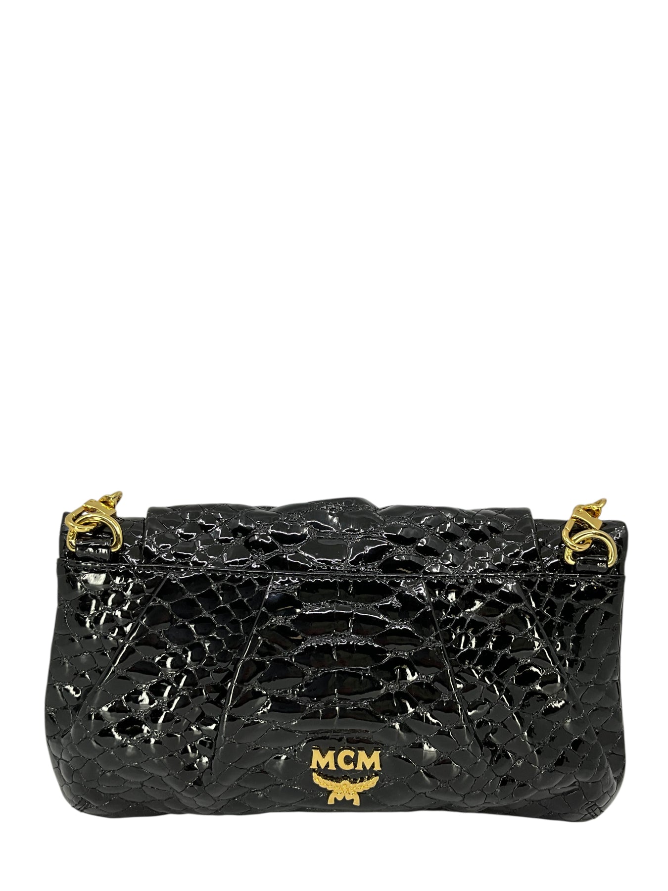 Add to your collection this authentic MCM Embossed Crocodile Flap Shoulder Bag crafted from glossy black embossed patent leather and gold-tone hardware. Featuring a chain link shoulder strap that can be removed, allowing you to carry it as a clutch. Shop authentic designer handbags by MCM at Consigned Designs.