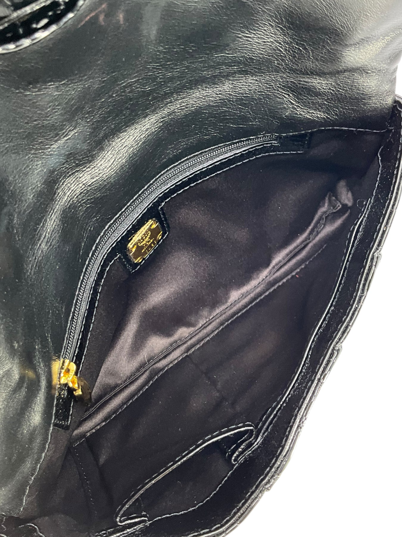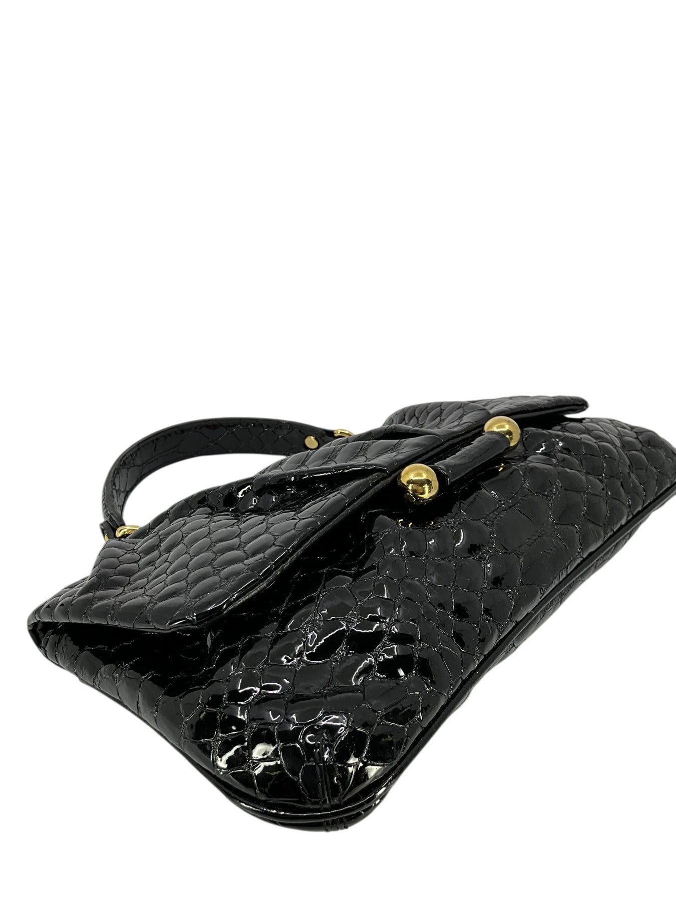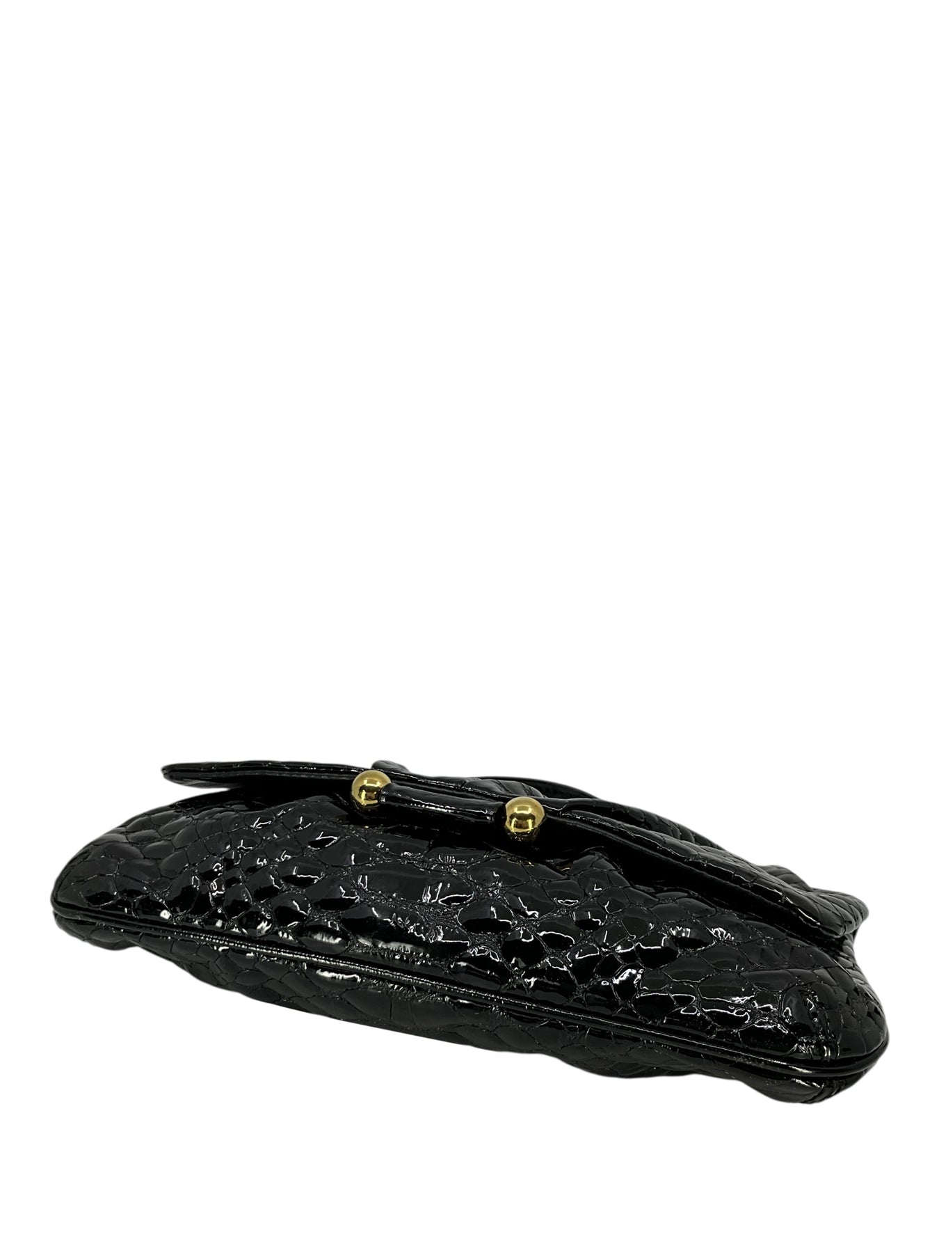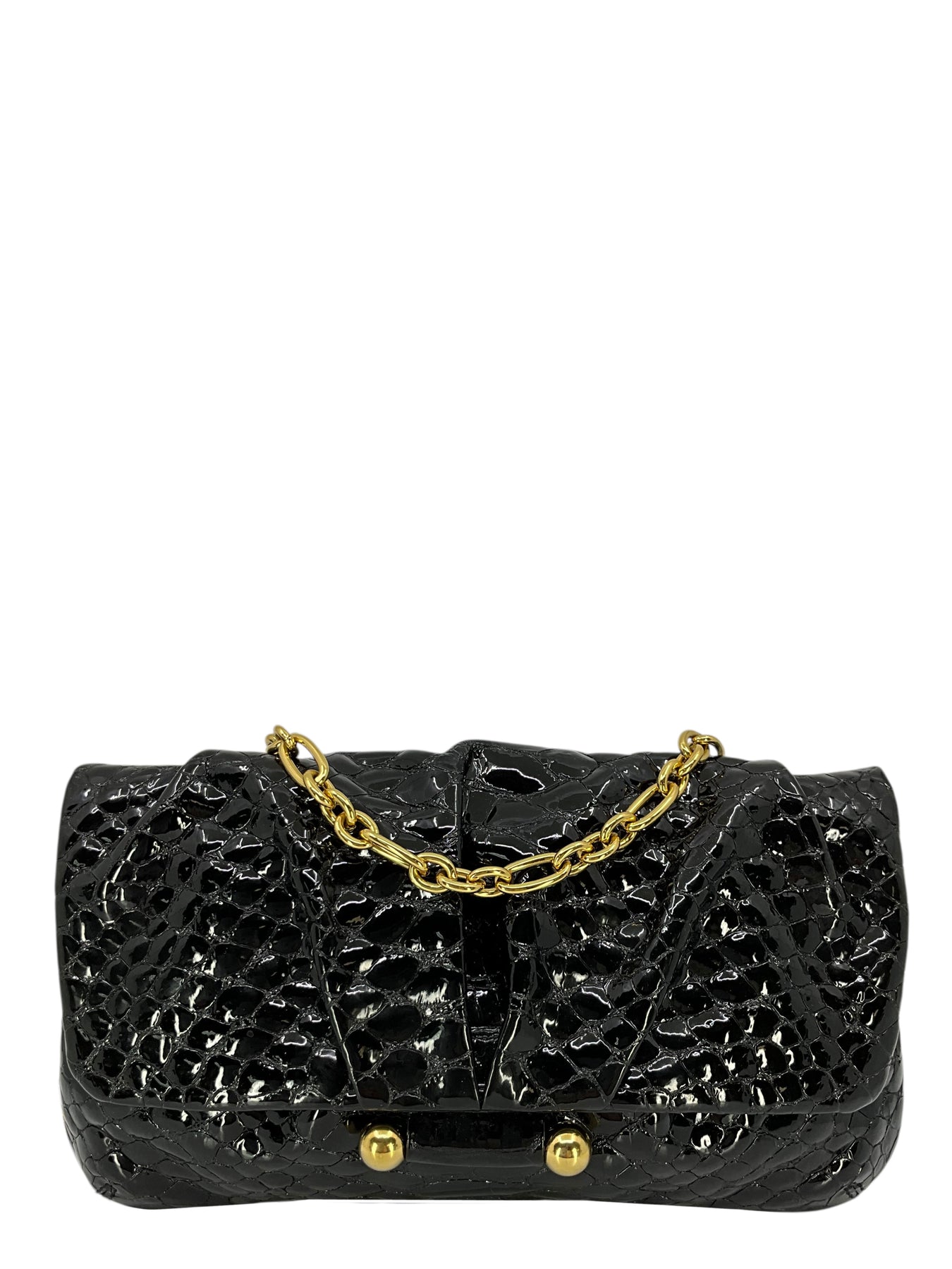 Add to your collection this authentic MCM Embossed Crocodile Flap Shoulder Bag crafted from glossy black embossed patent leather and gold-tone hardware. Featuring a chain link shoulder strap that can be removed, allowing you to carry it as a clutch. Shop authentic designer handbags by MCM at Consigned Designs.