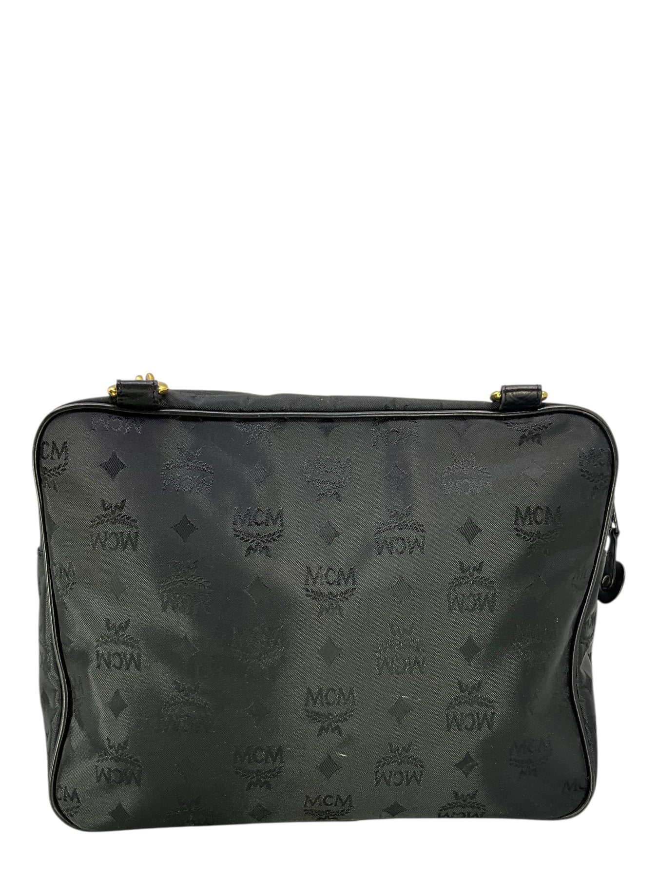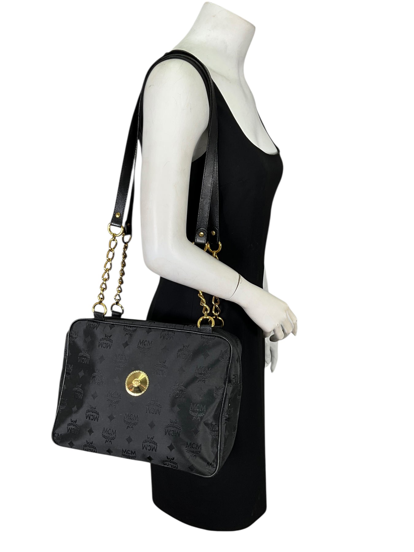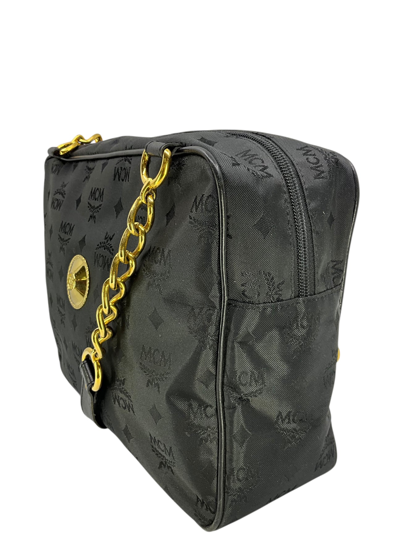 Add to your collection this authentic MCM Vicetos Monogram Chain Shoulder Bag crafted from black monogram embossed nylon and gold-tone hardware. Featuring tall chain link and leather shoulder straps and signature logo-engraved metal detailing at center. Shop authentic designer handbags by MCM at Consigned Designs.