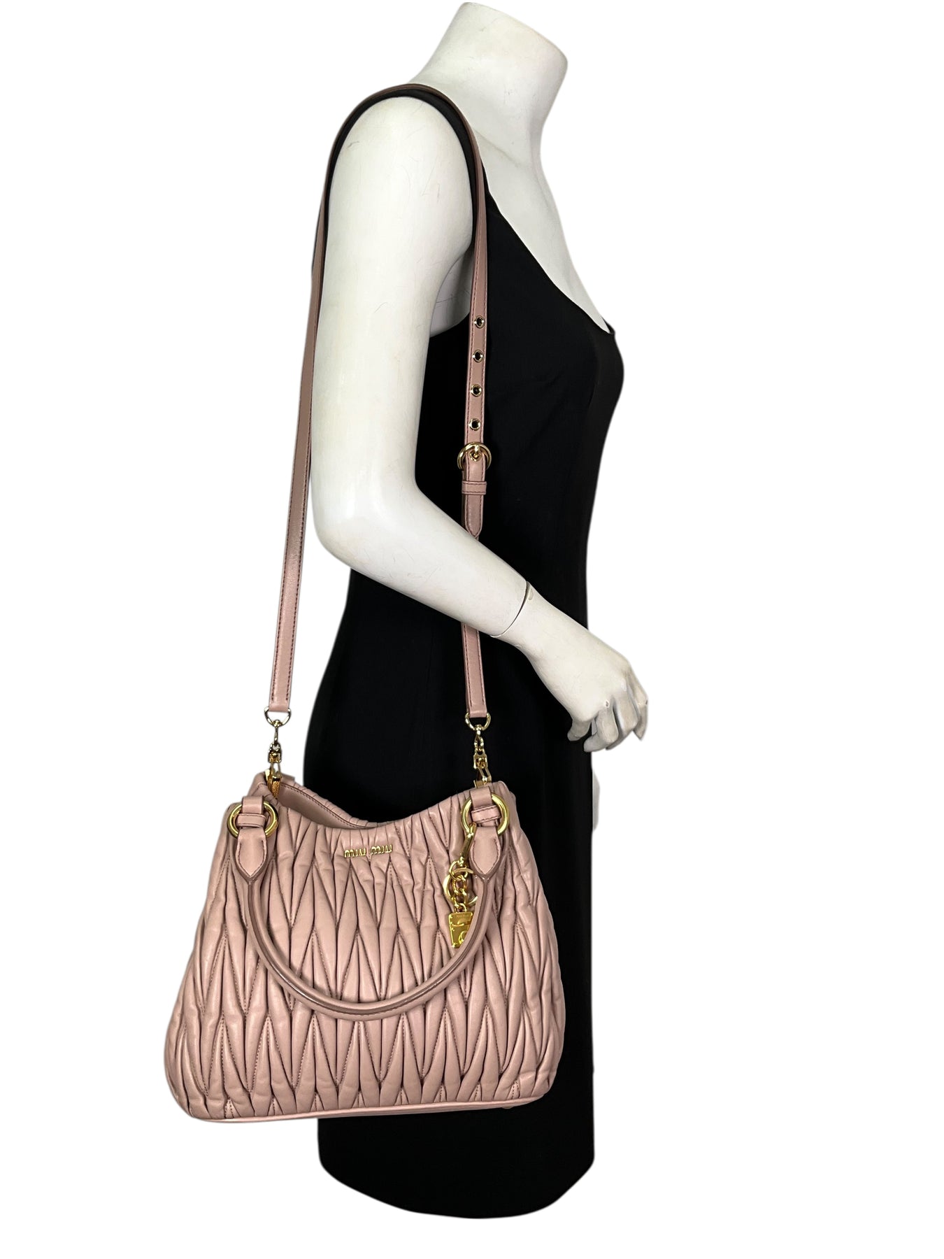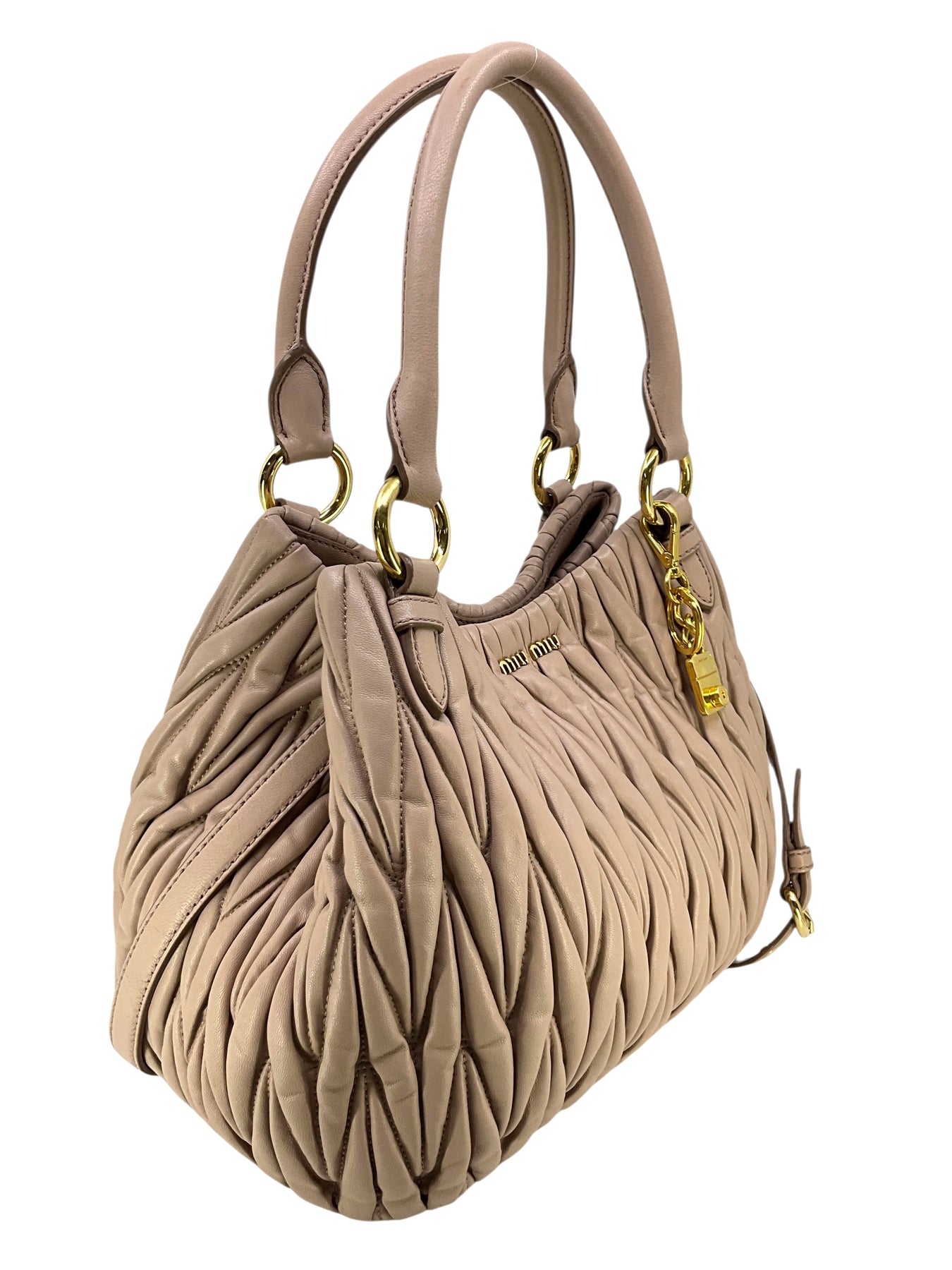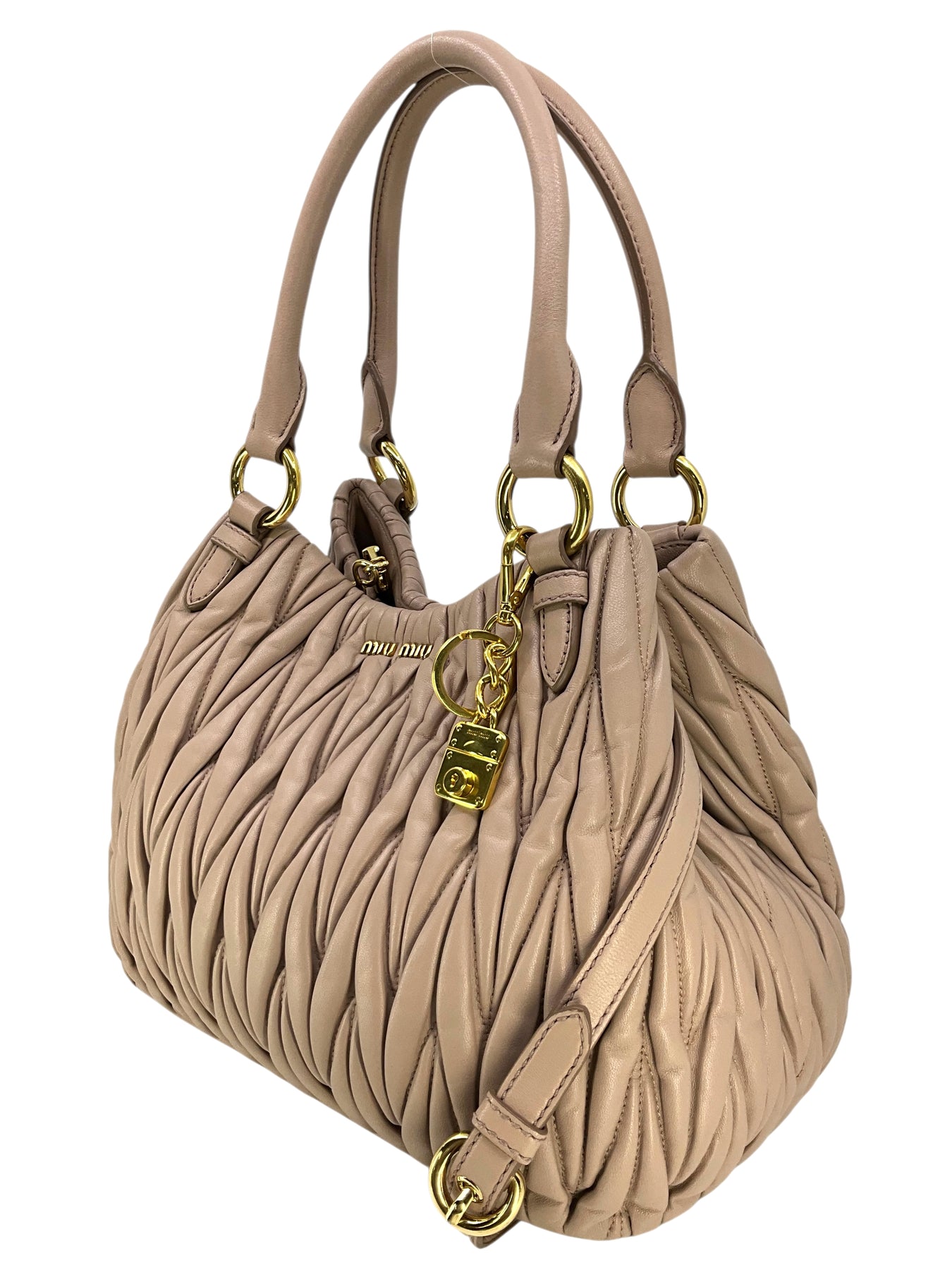 We guarantee the authenticity of this current Miu Miu Matelasse Leather Convertible 2WAY Bag crafted in taupe calfskin and gold-tone hardware. This bag features rolled leather top handles, including a removable, adjustable shoulder strap and a front logo accent. A perfect bag for day or night, only from MIU MIU!