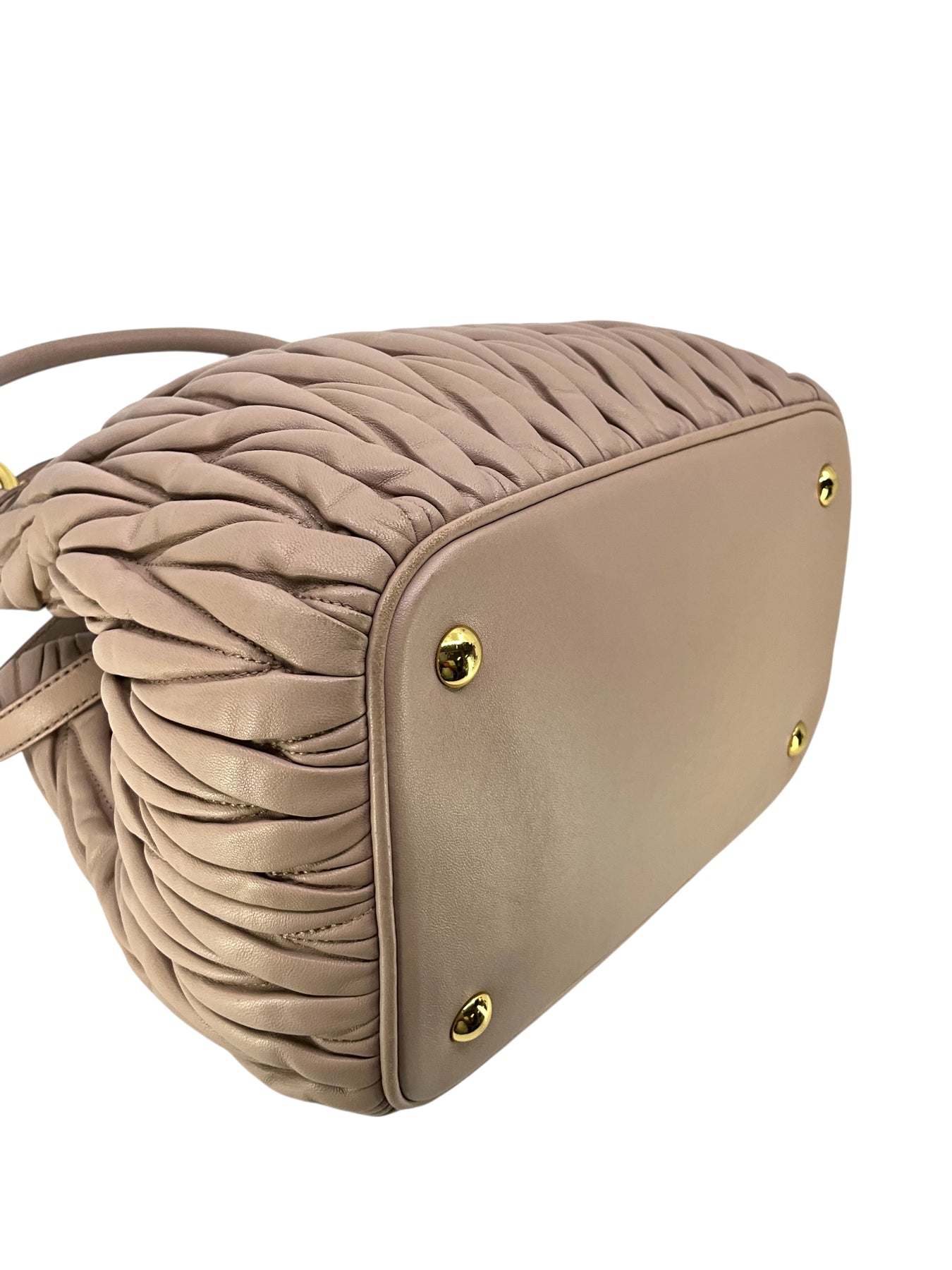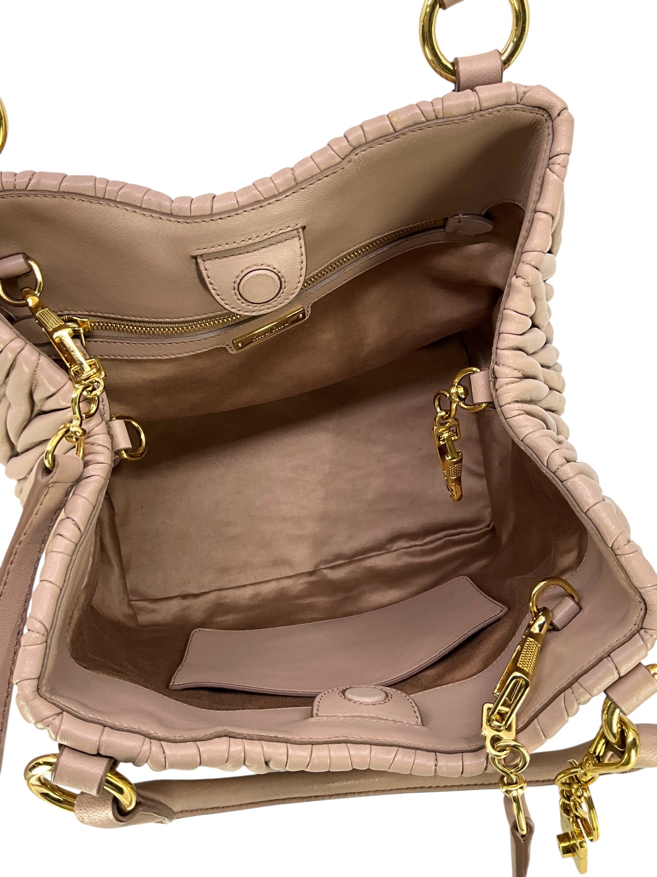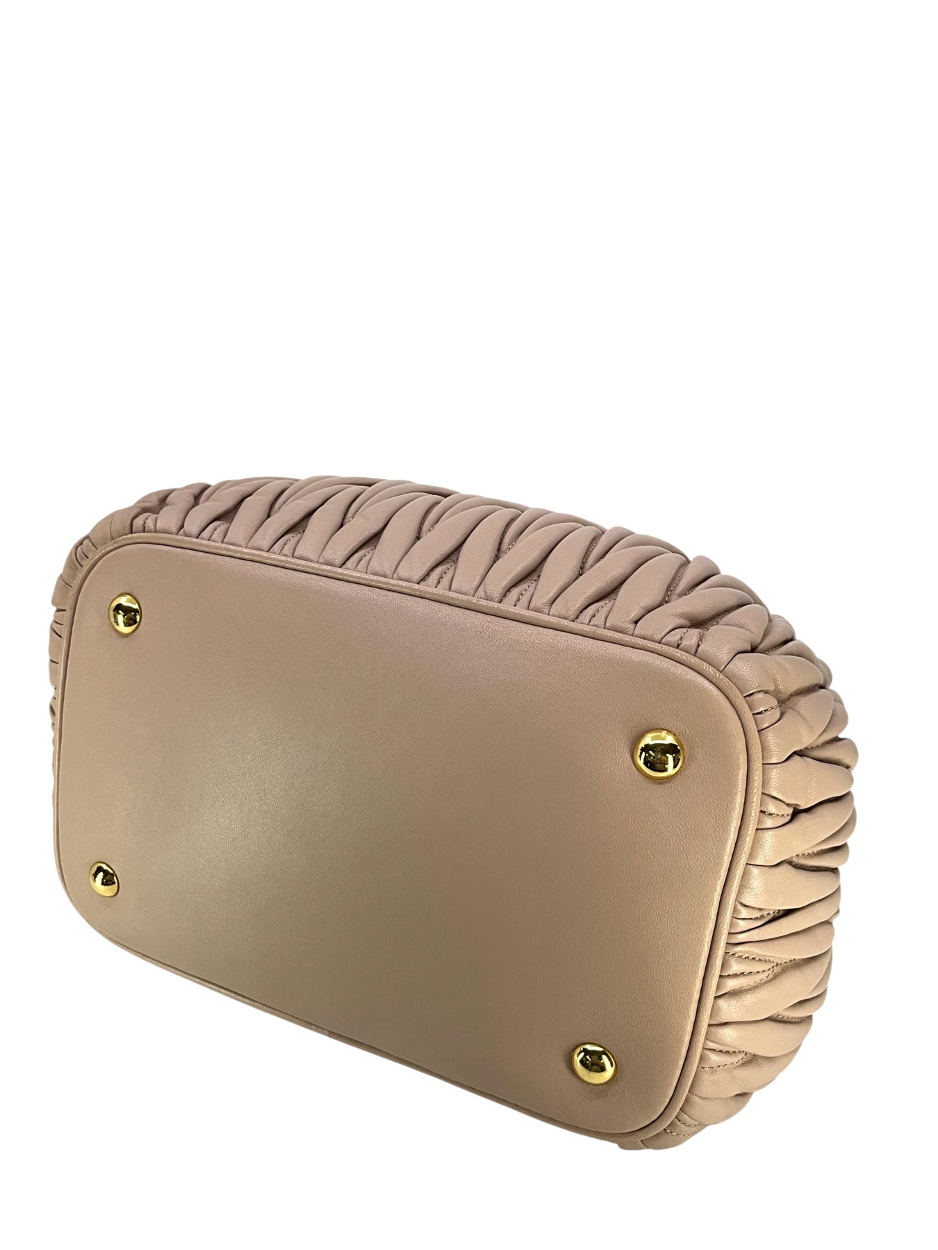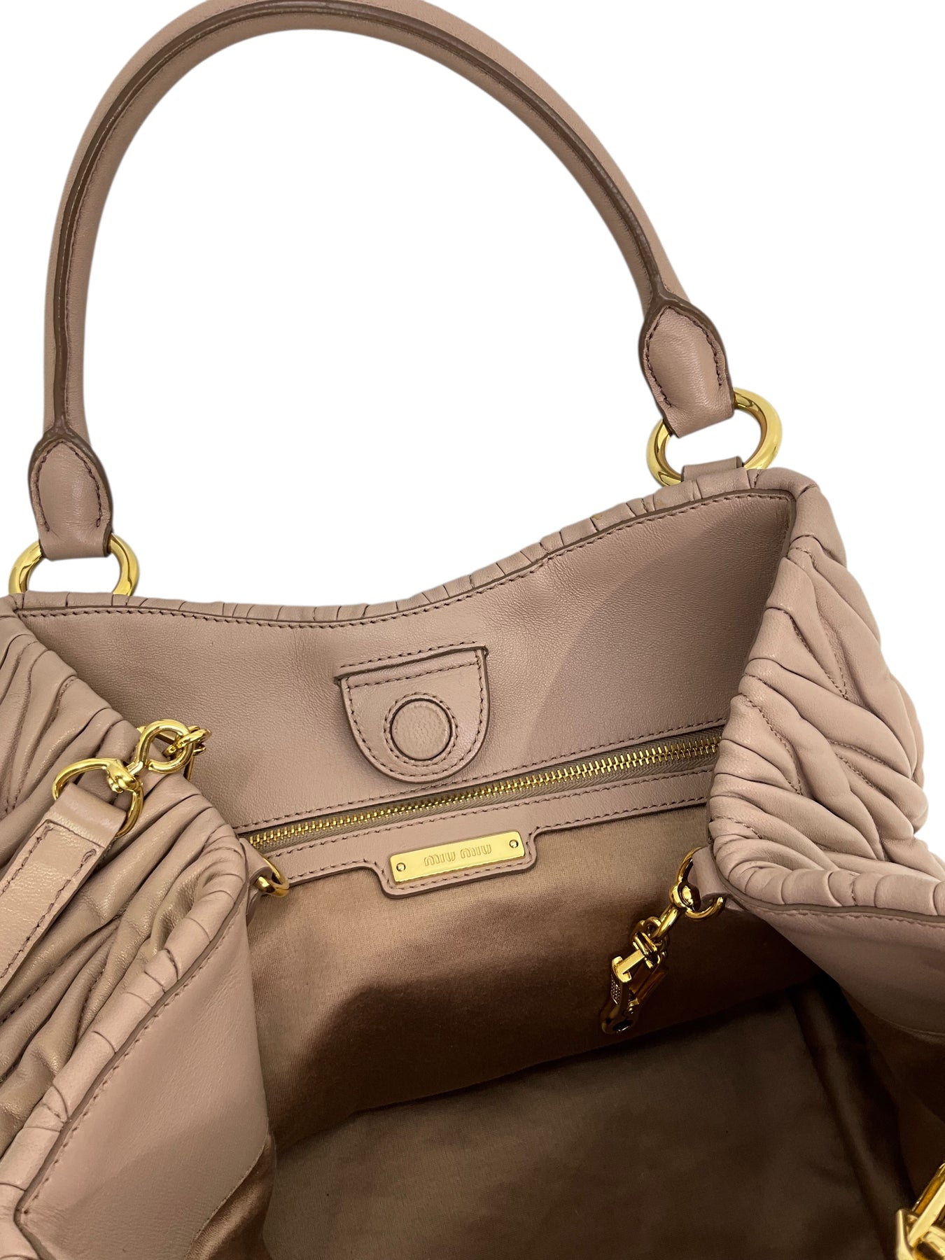 We guarantee the authenticity of this current Miu Miu Matelasse Leather Convertible 2WAY Bag crafted in taupe calfskin and gold-tone hardware. This bag features rolled leather top handles, including a removable, adjustable shoulder strap and a front logo accent. A perfect bag for day or night, only from MIU MIU!