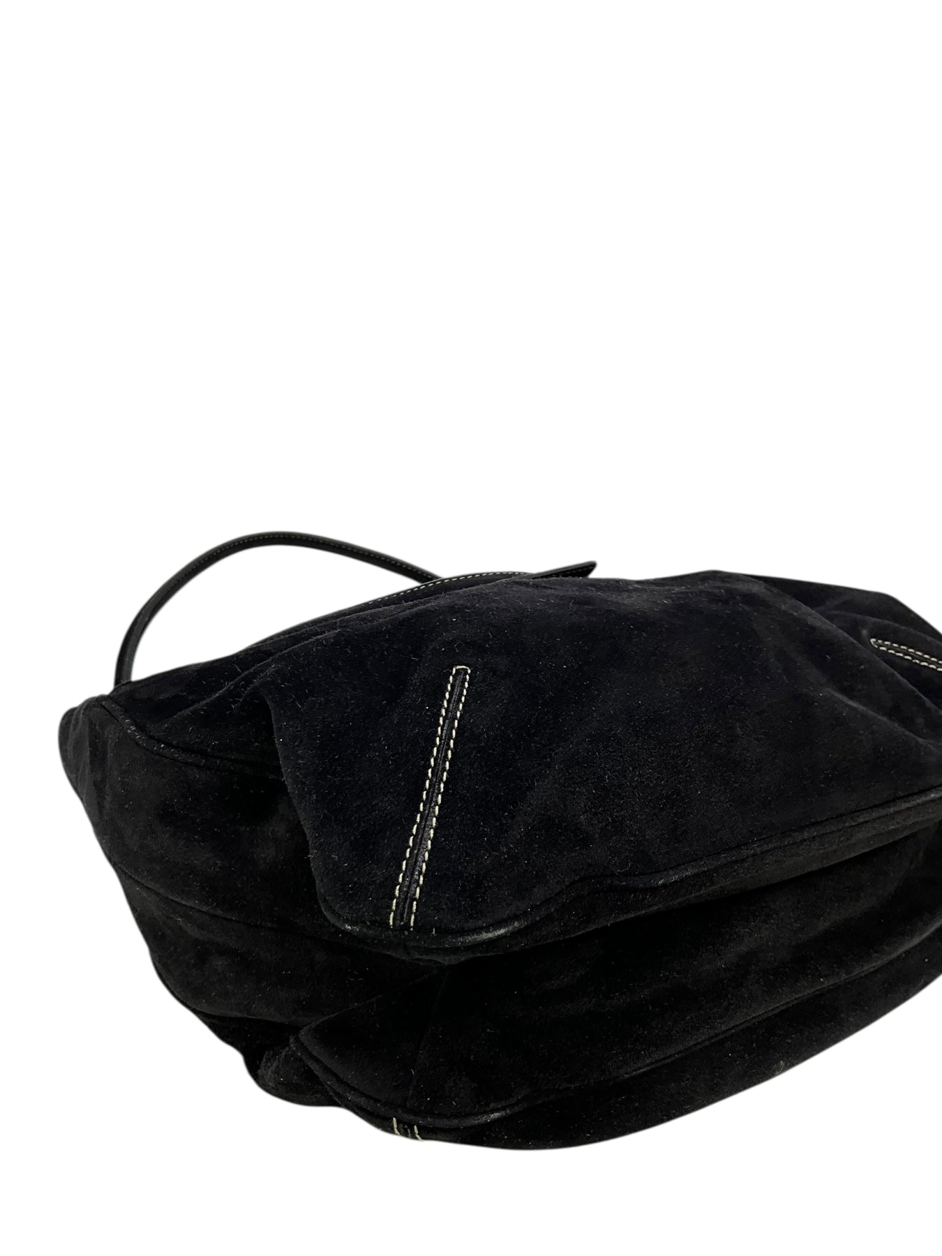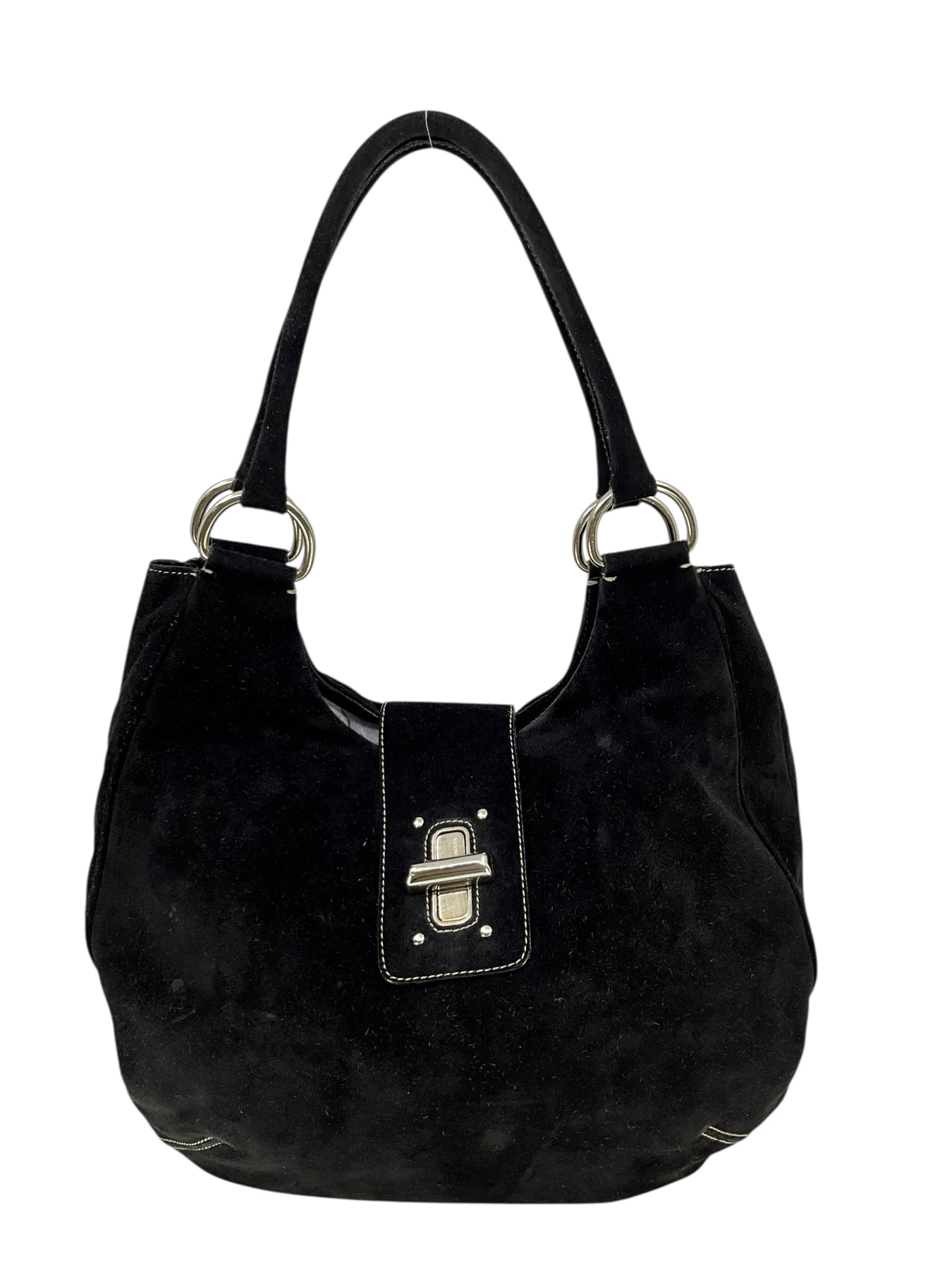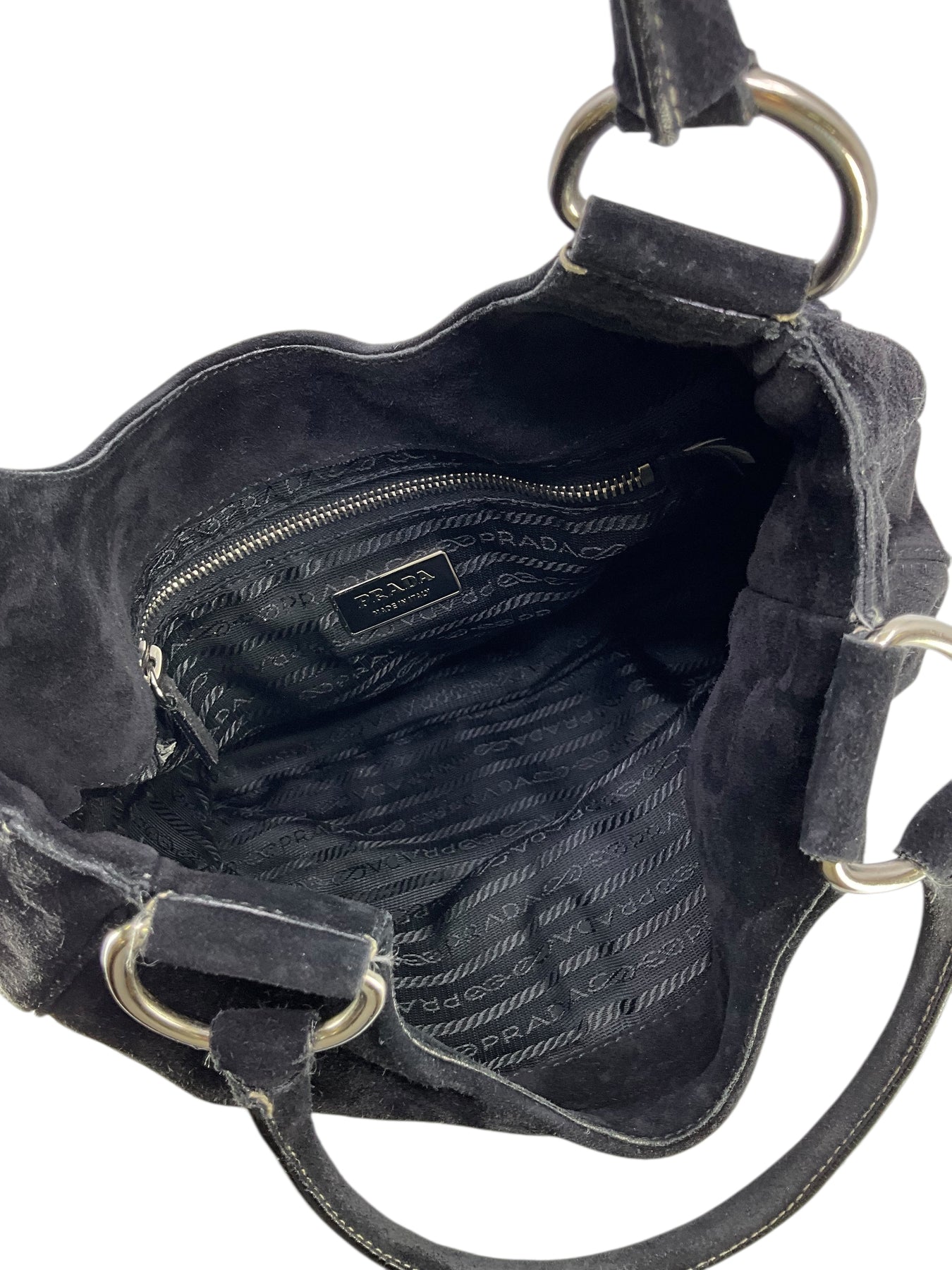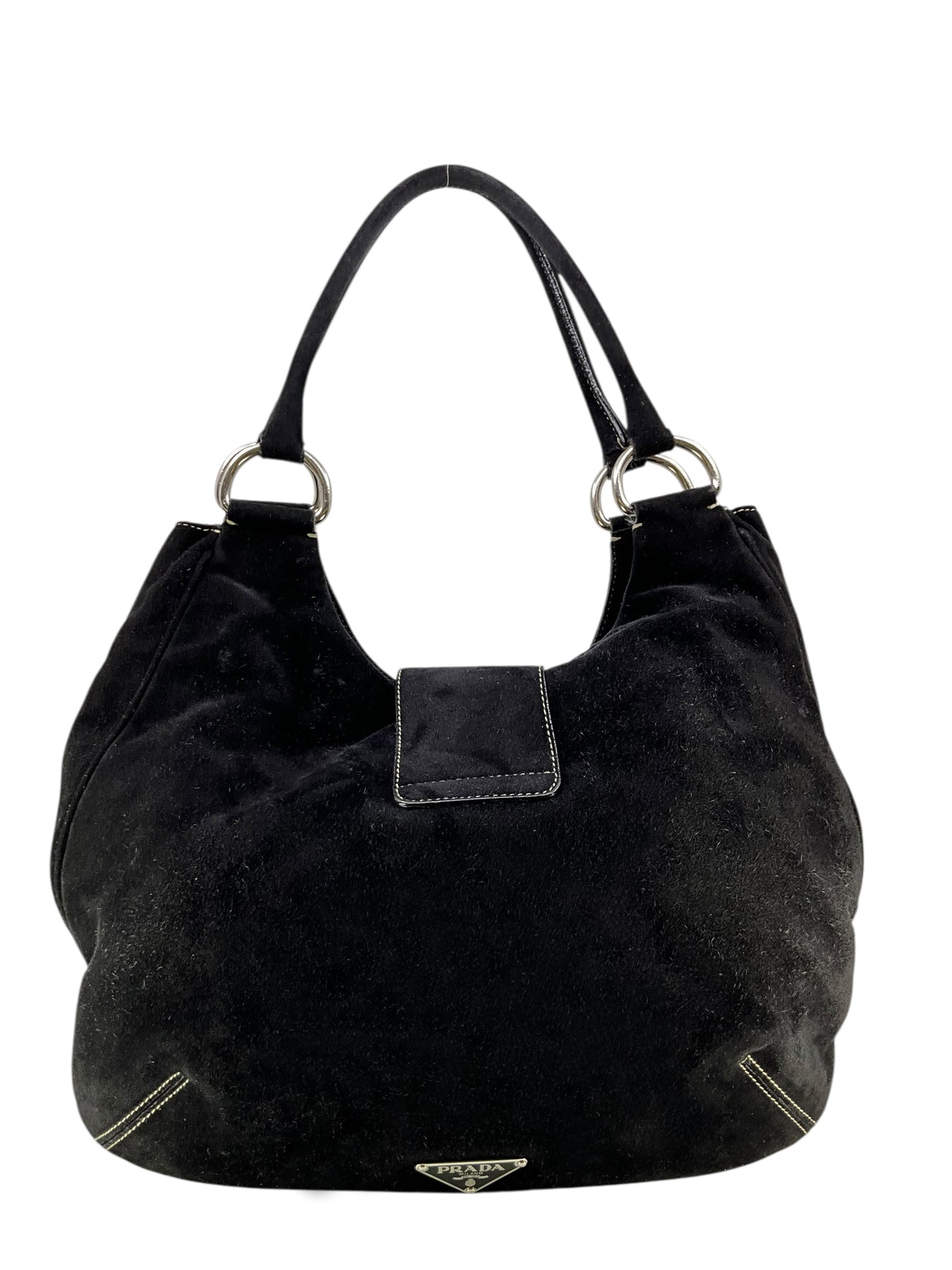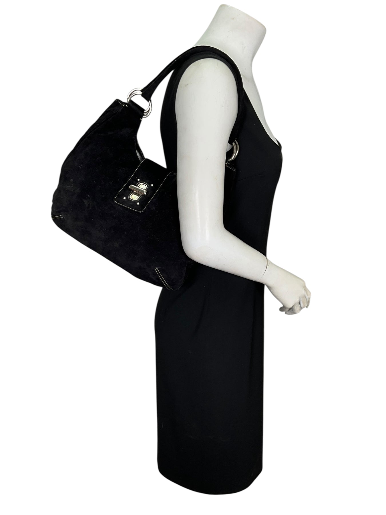 We guarantee the authenticity of this Prada Suede Turn-Lock Hobo Bag crafted from black suede and silver-tone hardware. Featuring rolled leather top handles, a signature triangle logo plaque at back and a suede flap tab with a turn-lock closure.