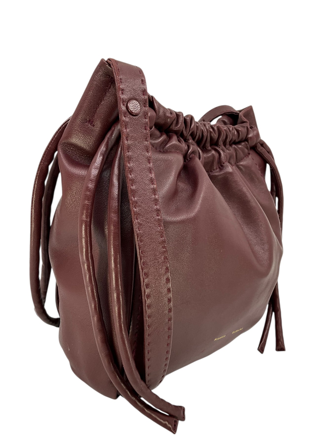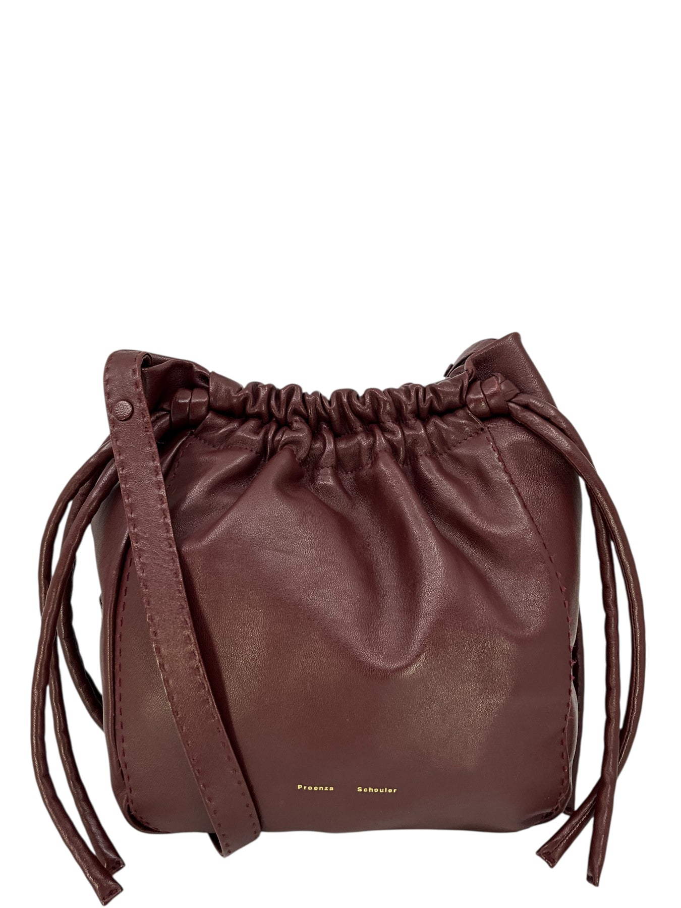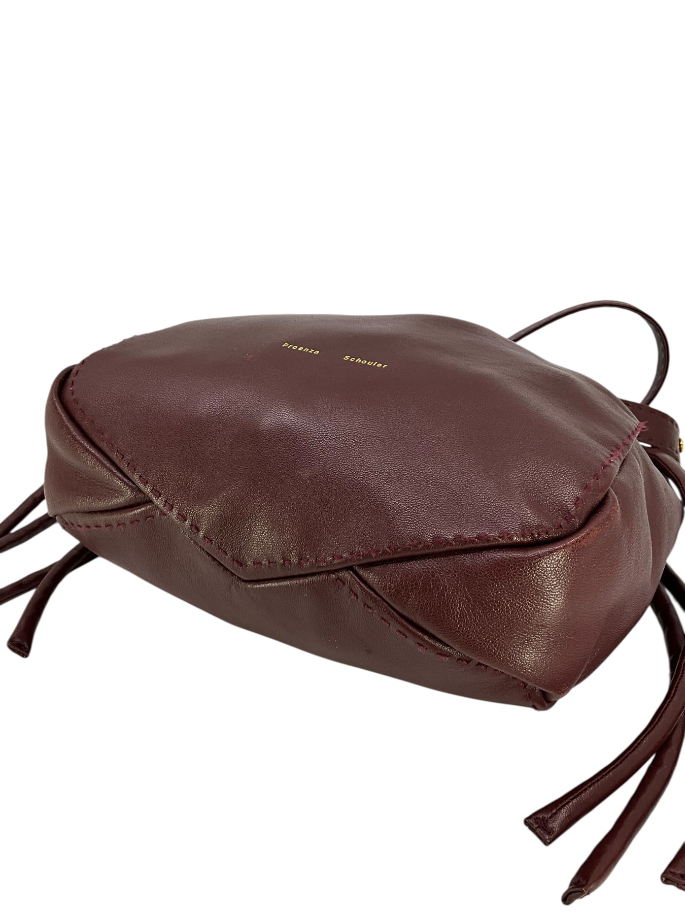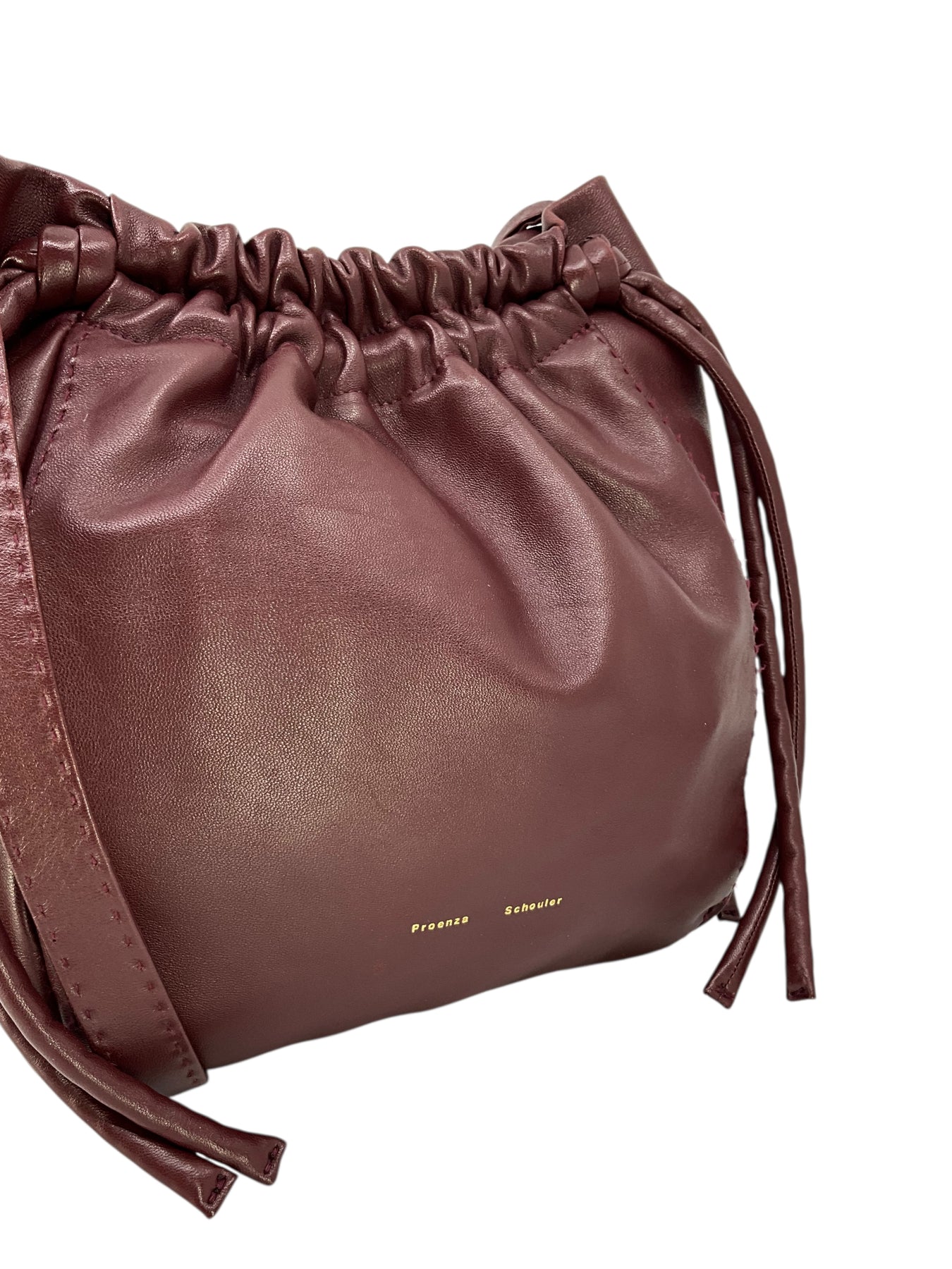 We guarantee the authenticity of this must-have Proenza Schouler Drawstring Shoulder Bag made from buttery-soft burgundy leather. This stunning bag features a single leather shoulder strap and knotted leather tie accents that drape down the sides of the bag.