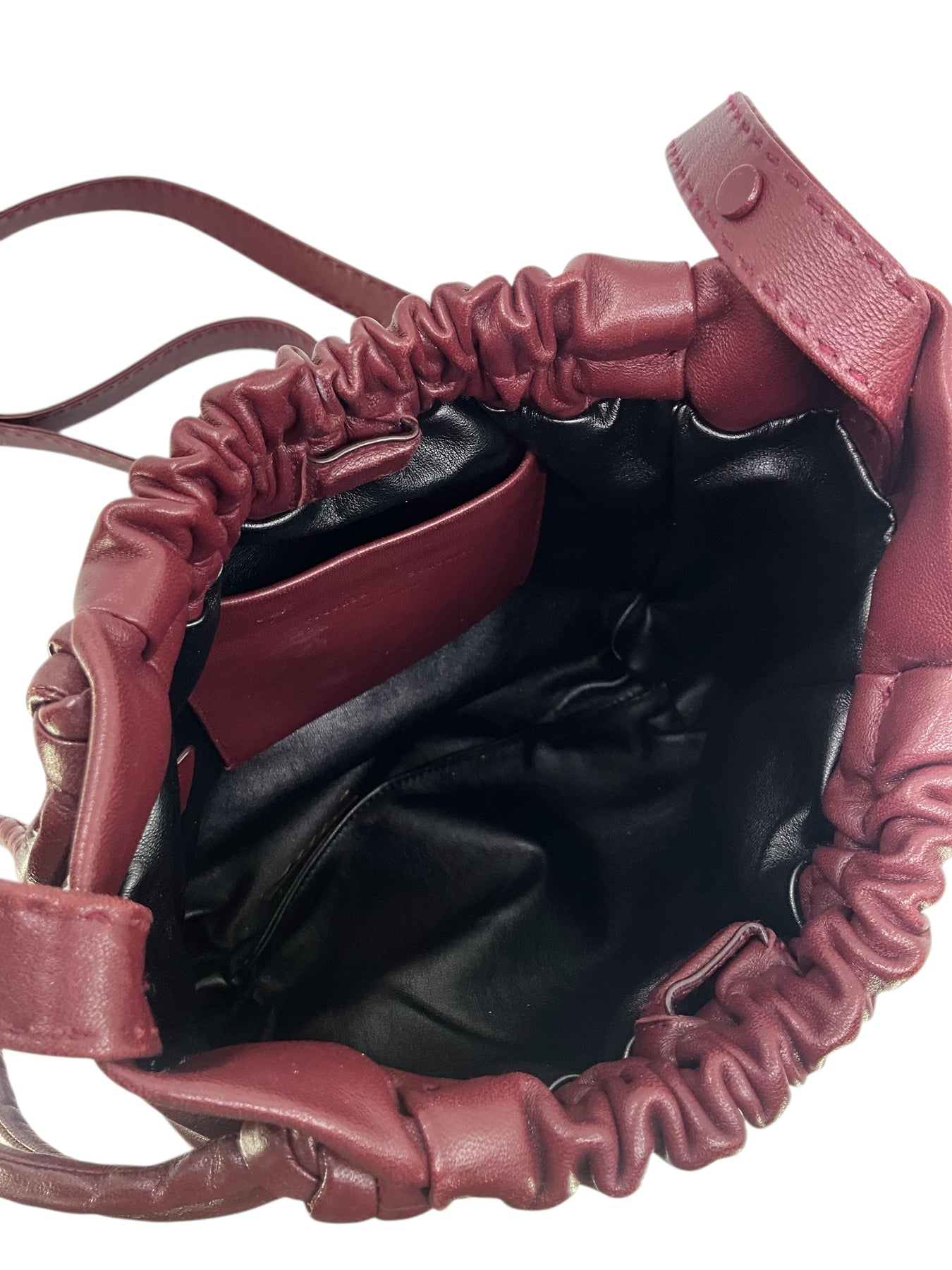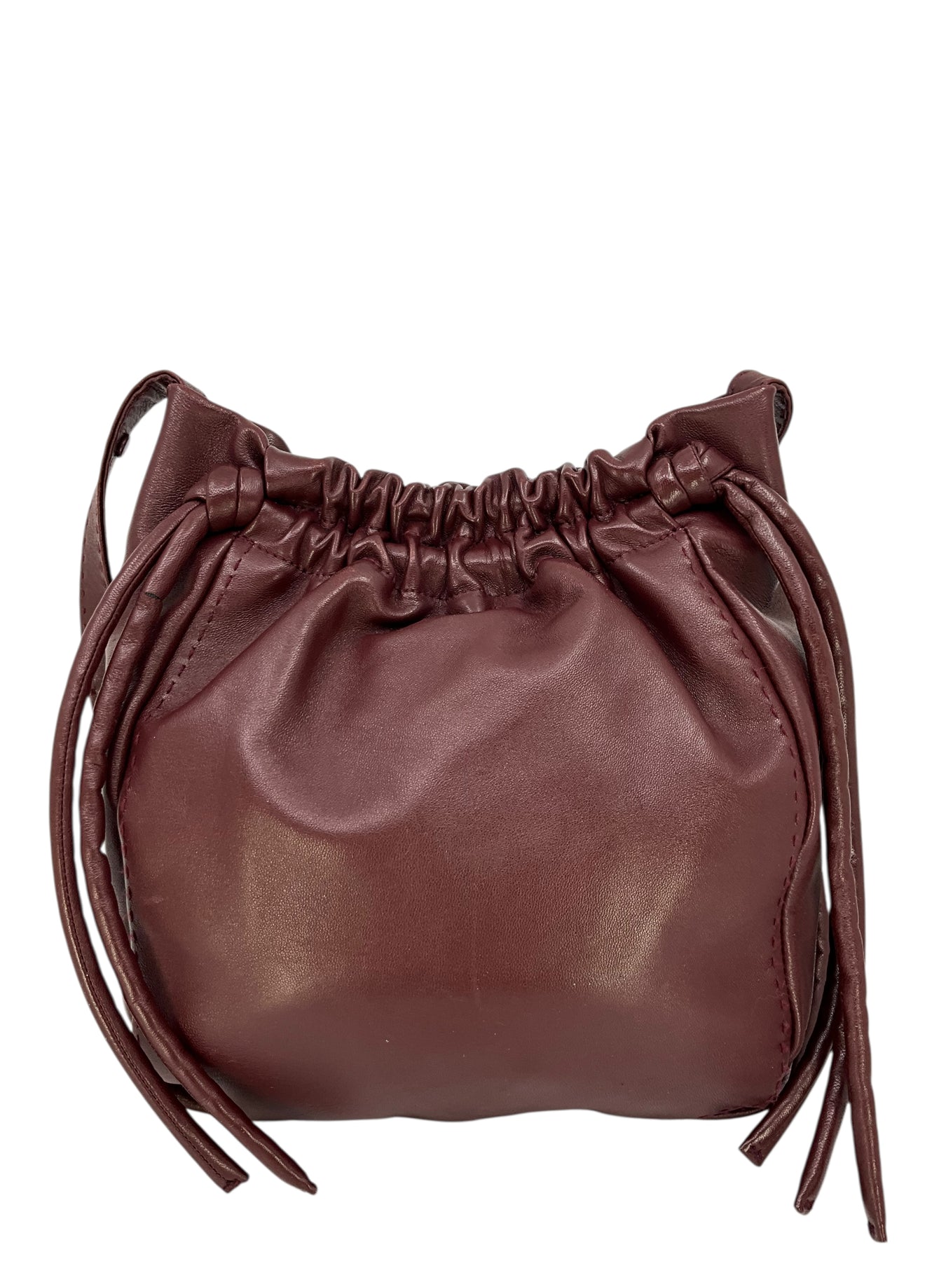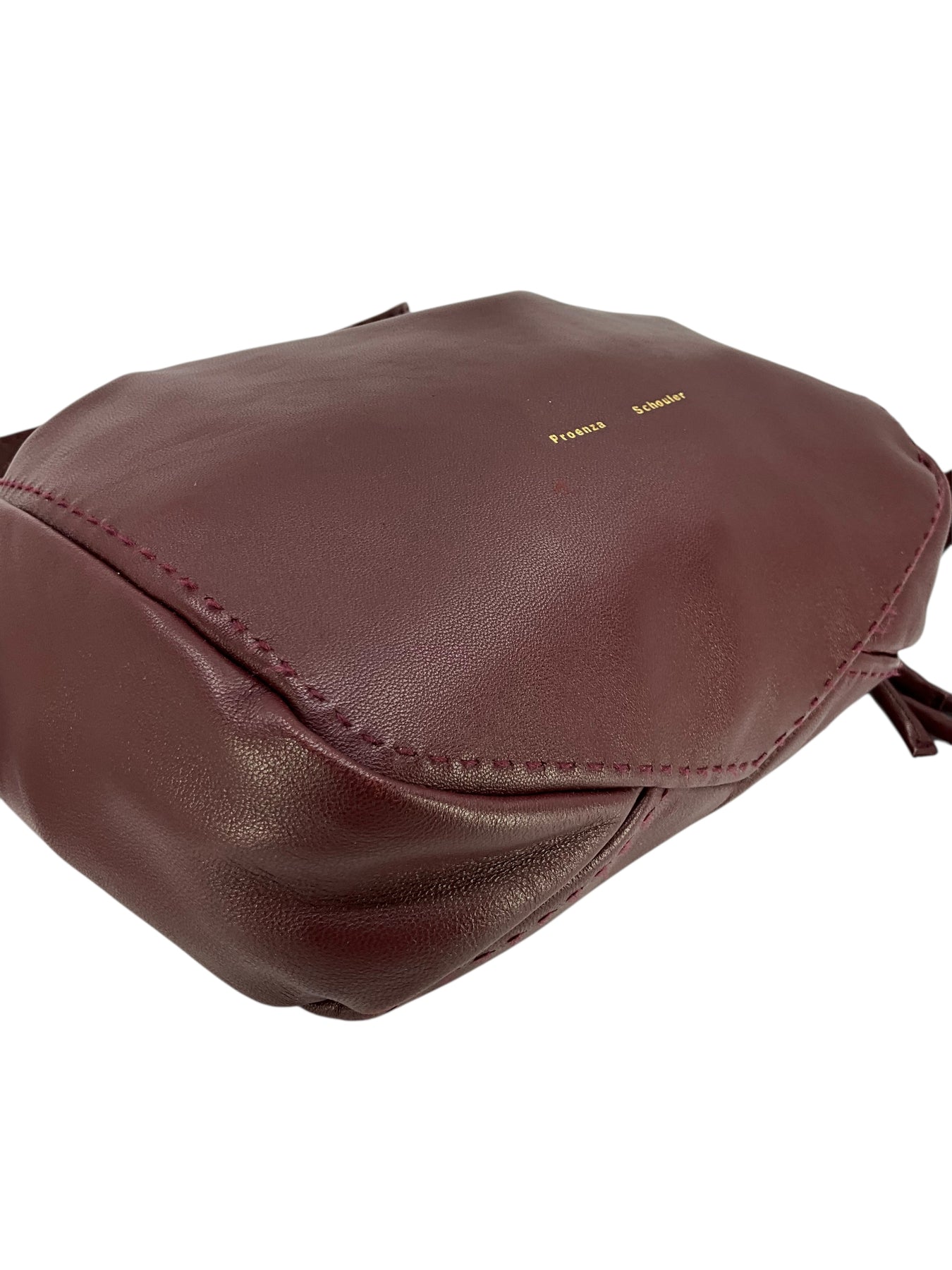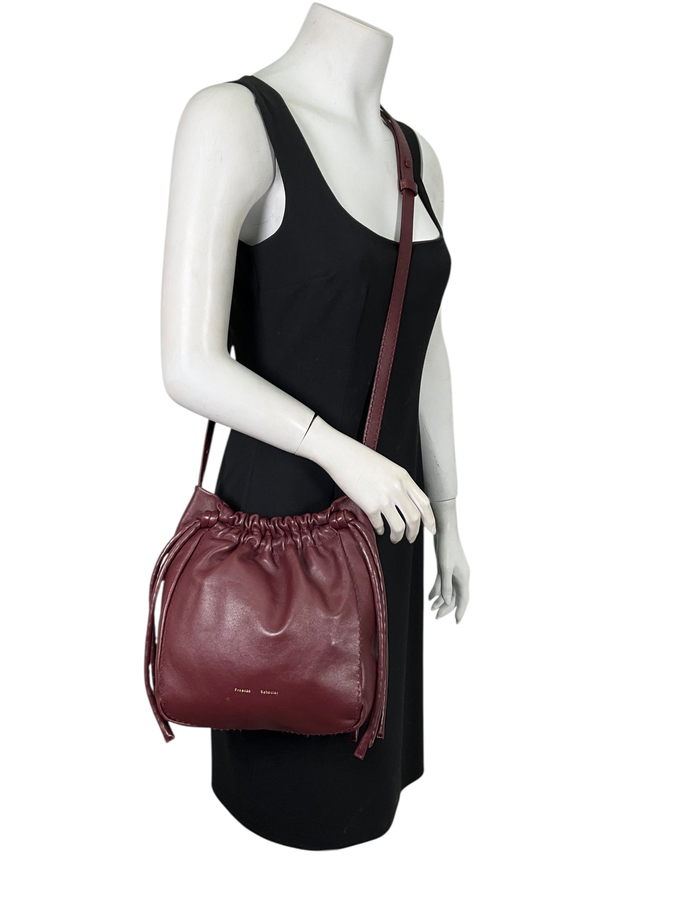 We guarantee the authenticity of this must-have Proenza Schouler Drawstring Shoulder Bag made from buttery-soft burgundy leather. This stunning bag features a single leather shoulder strap and knotted leather tie accents that drape down the sides of the bag.