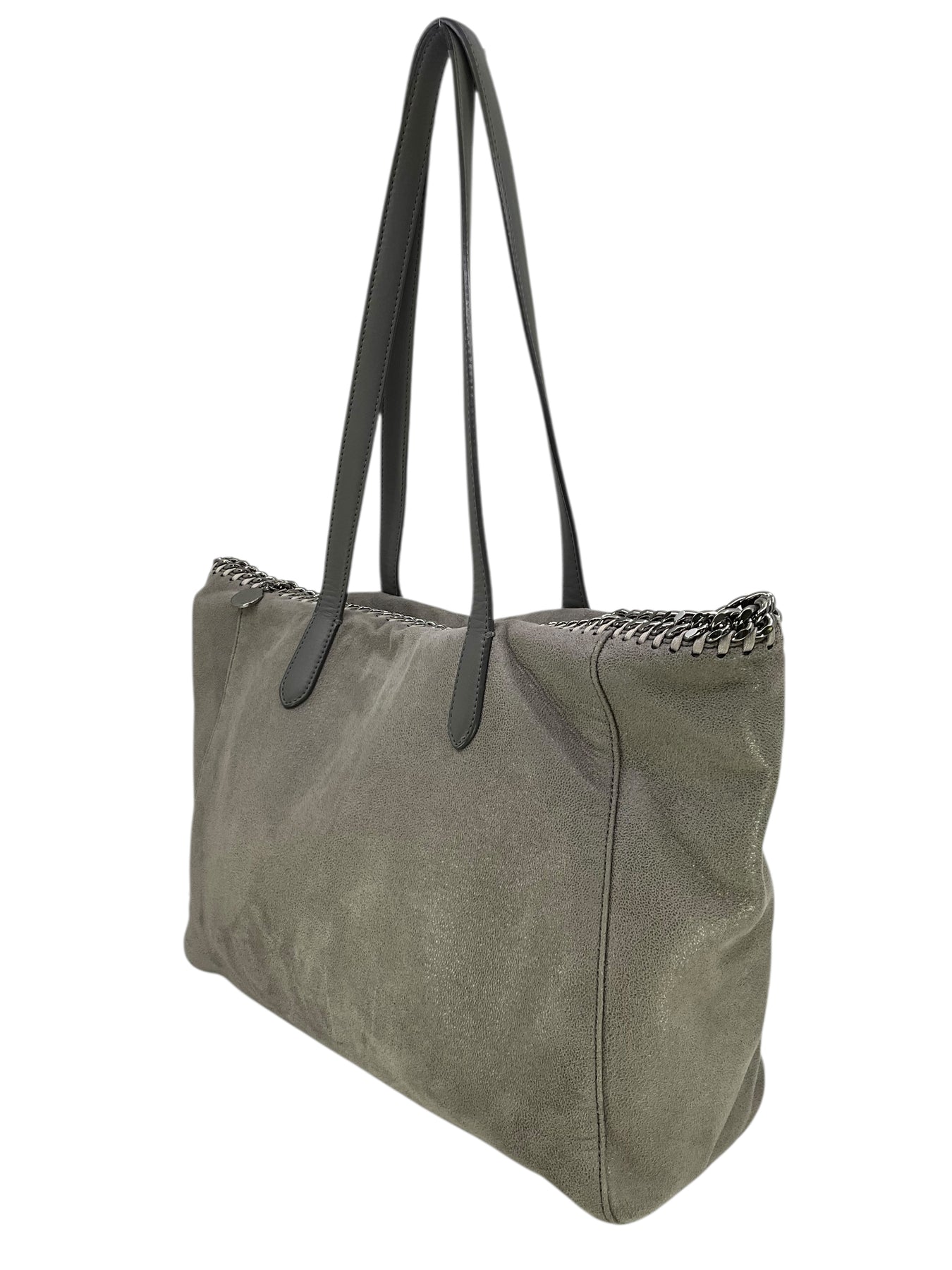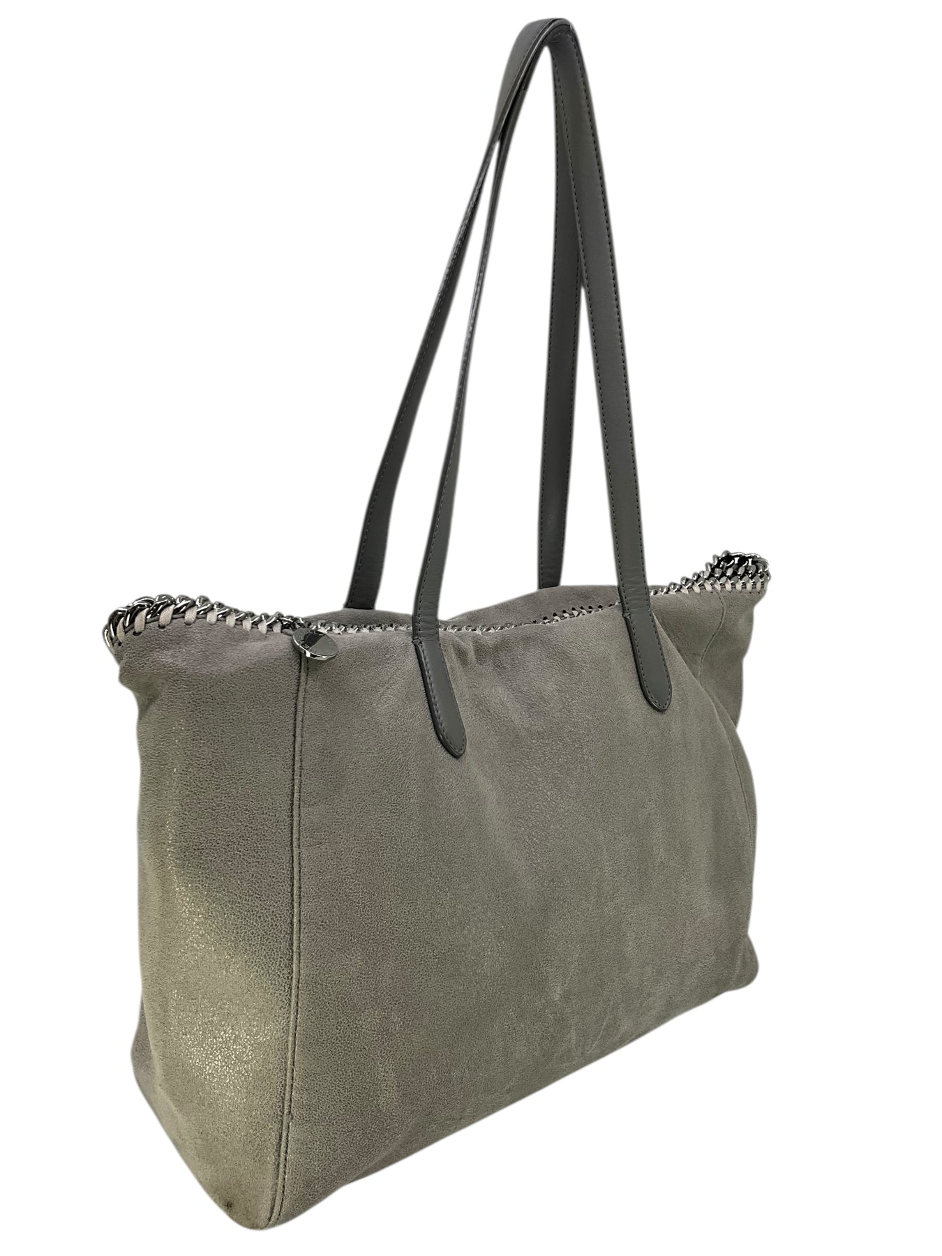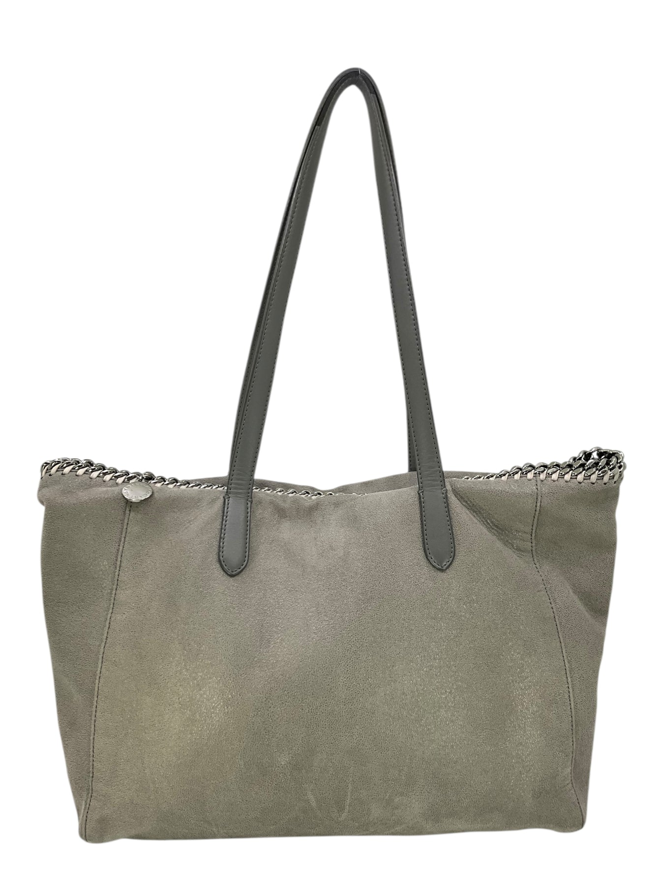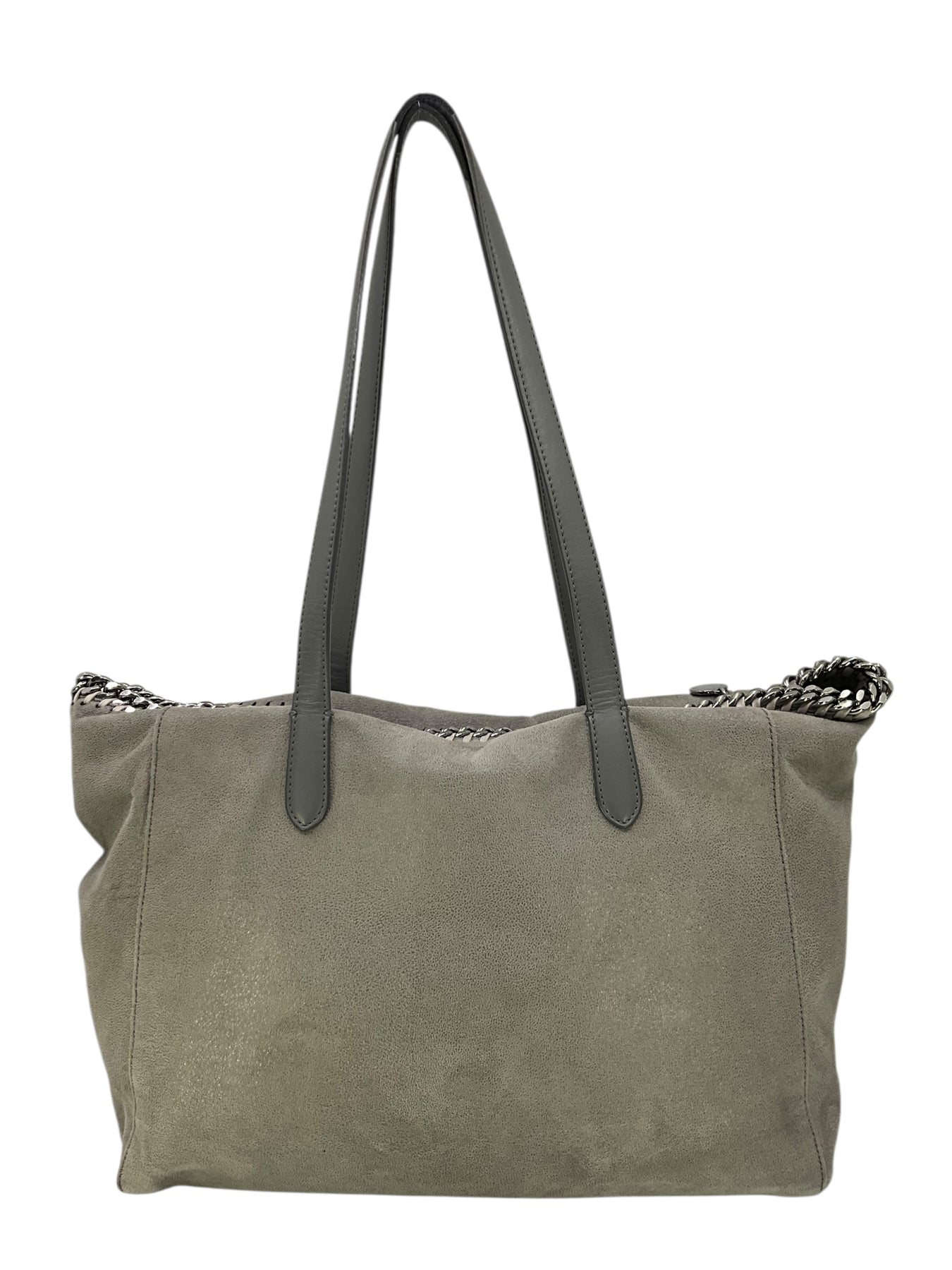 Add to your collection this authentic Stella McCartney Vegan Suede Chain Link Tote in gray. Featuring tonal whipstitch and chain link detail, flat leather shoulder straps and a signature miniature dangling logo plaque.
