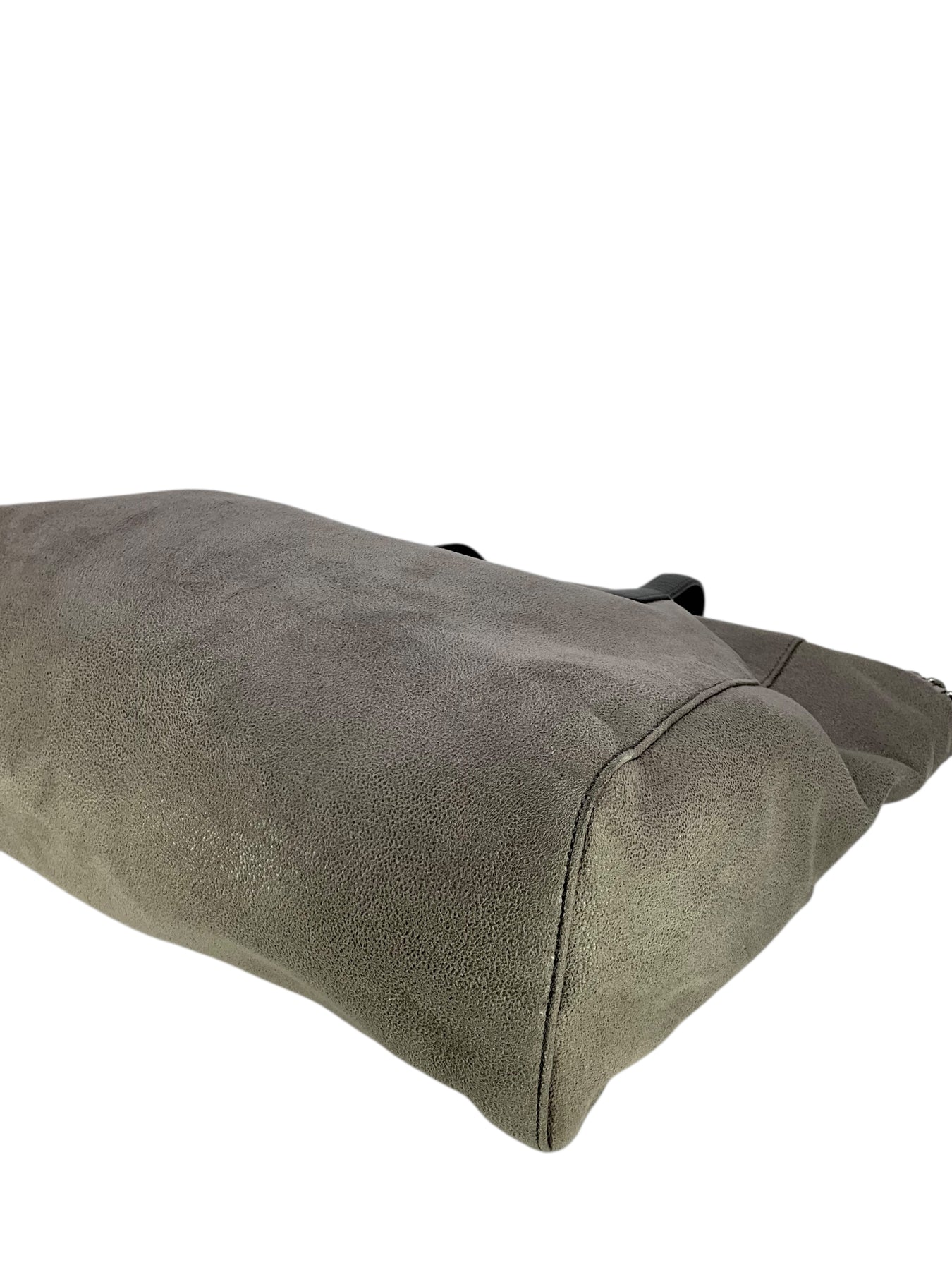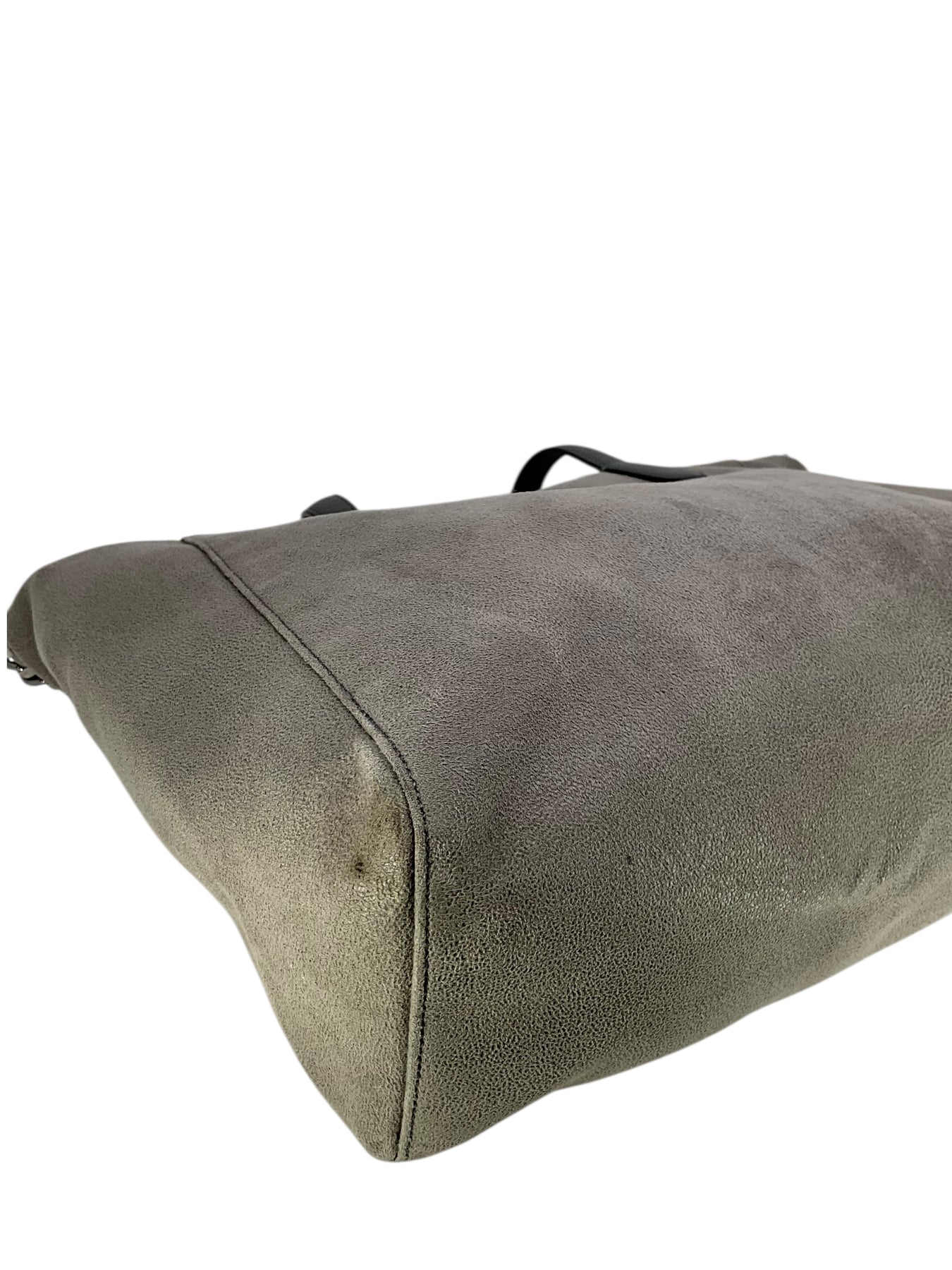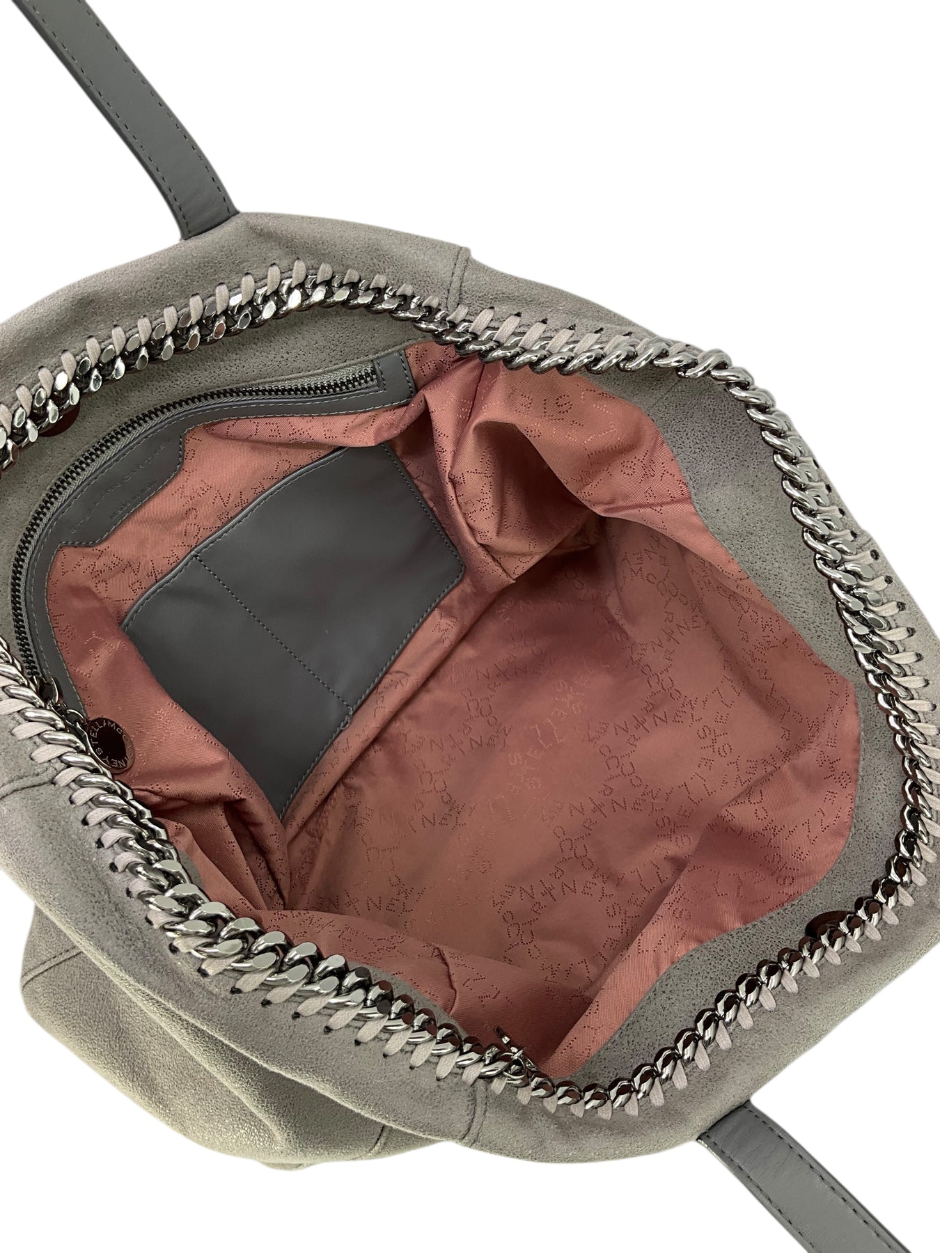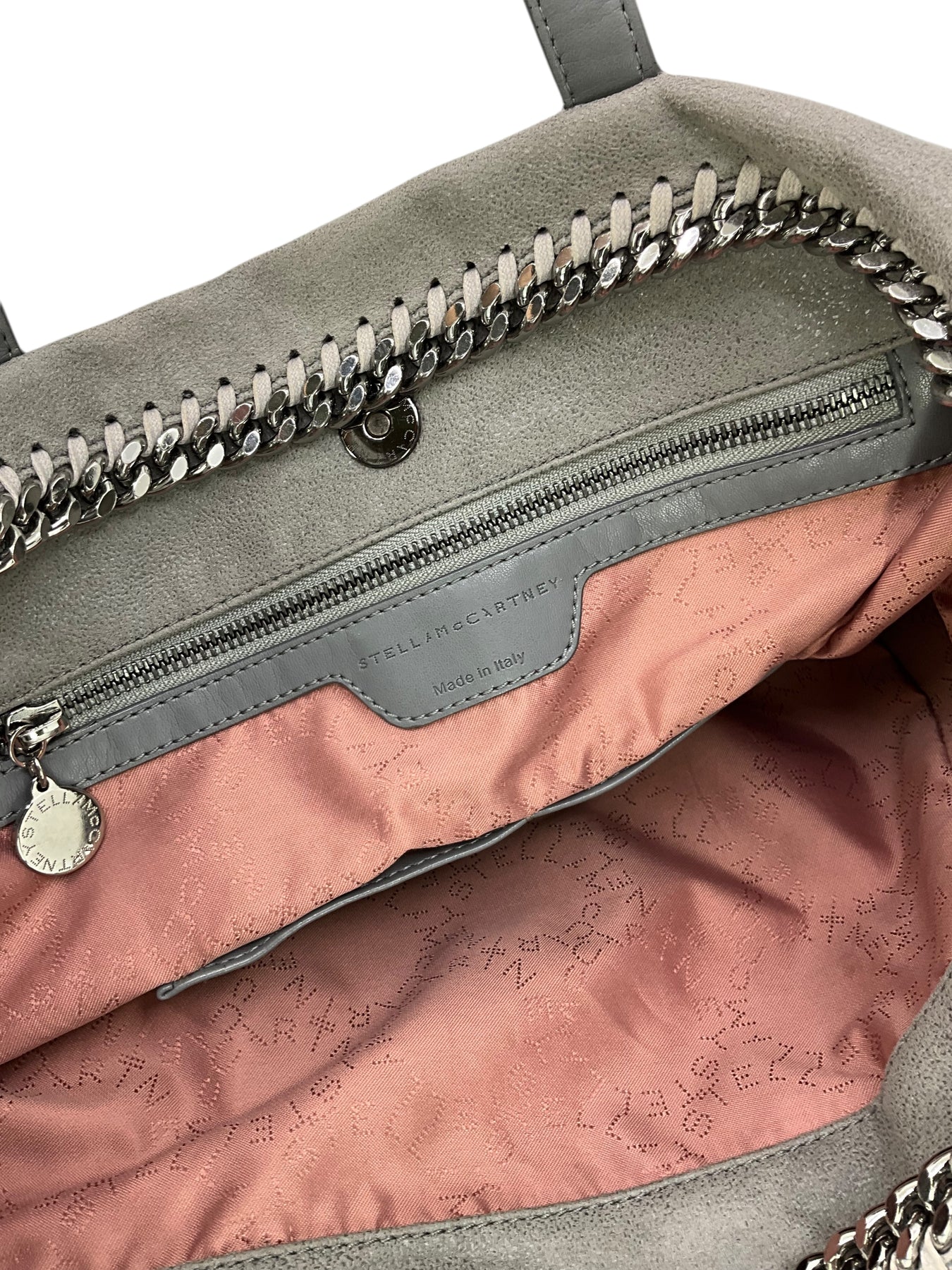 Add to your collection this authentic Stella McCartney Vegan Suede Chain Link Tote in gray. Featuring tonal whipstitch and chain link detail, flat leather shoulder straps and a signature miniature dangling logo plaque.