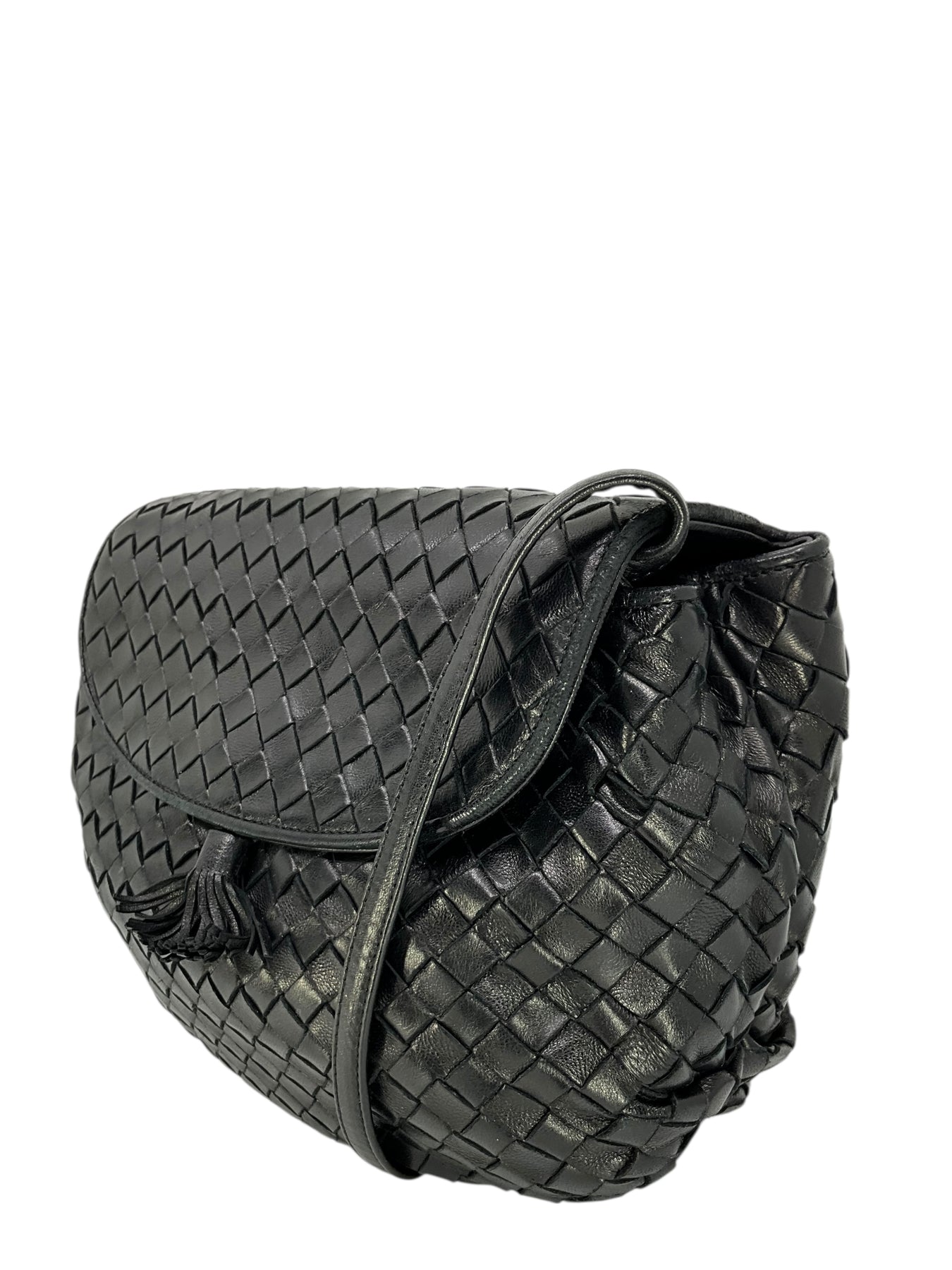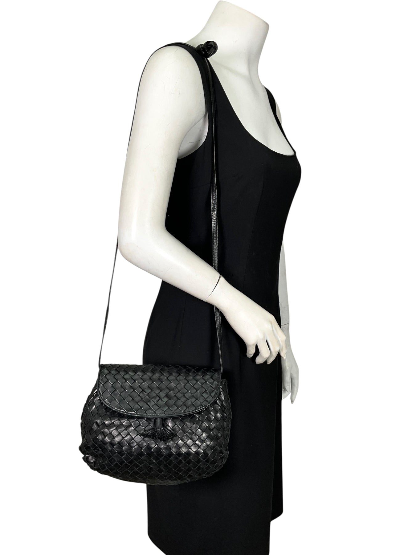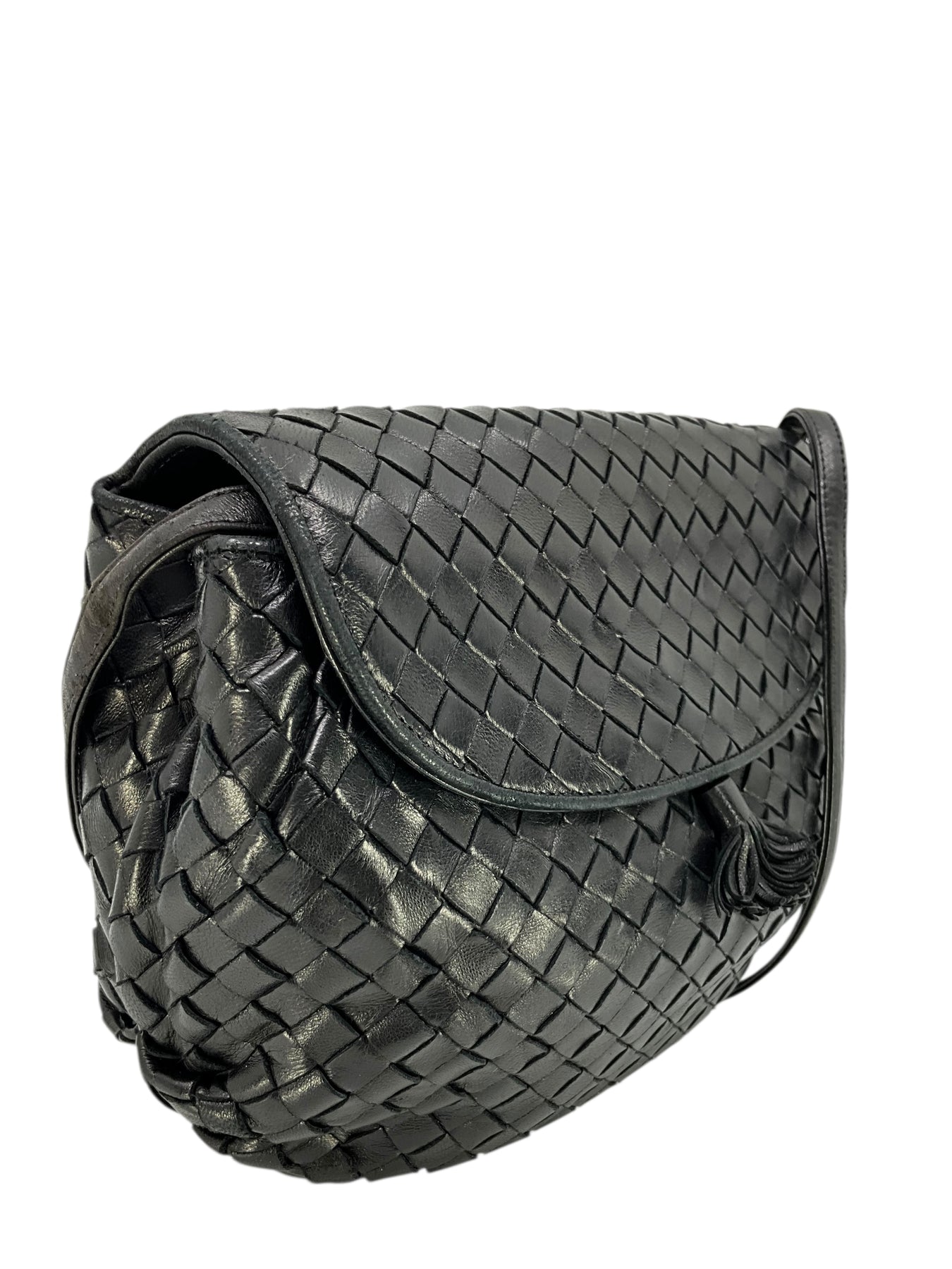 This authentic Bottega Veneta Vintage Intrecciato Leather Crossbody Bag is crafted from iconic black woven leather. It features an adjustable long thin shoulder strap that can be tucked away neatly inside the bag and carried as a clutch.