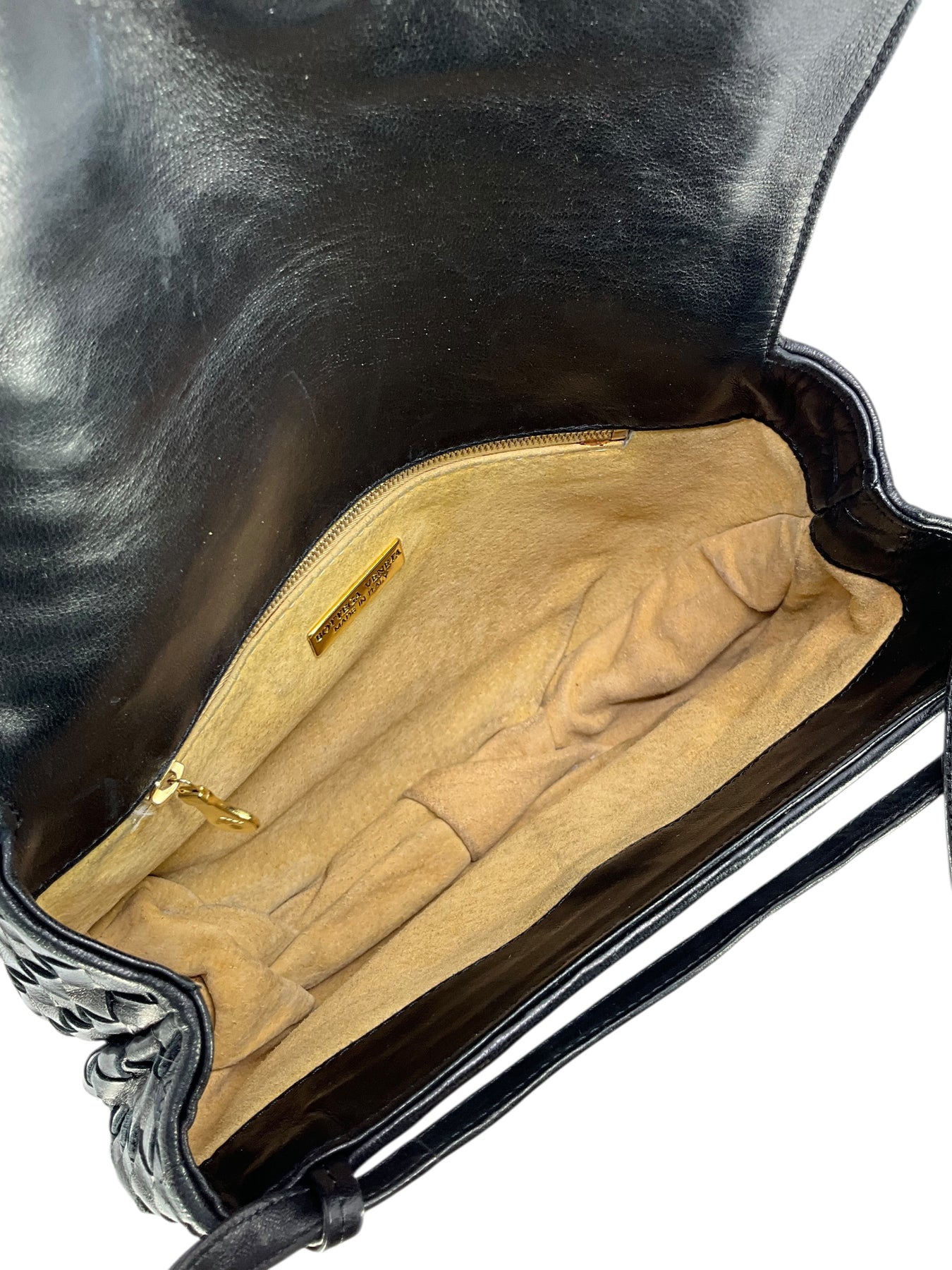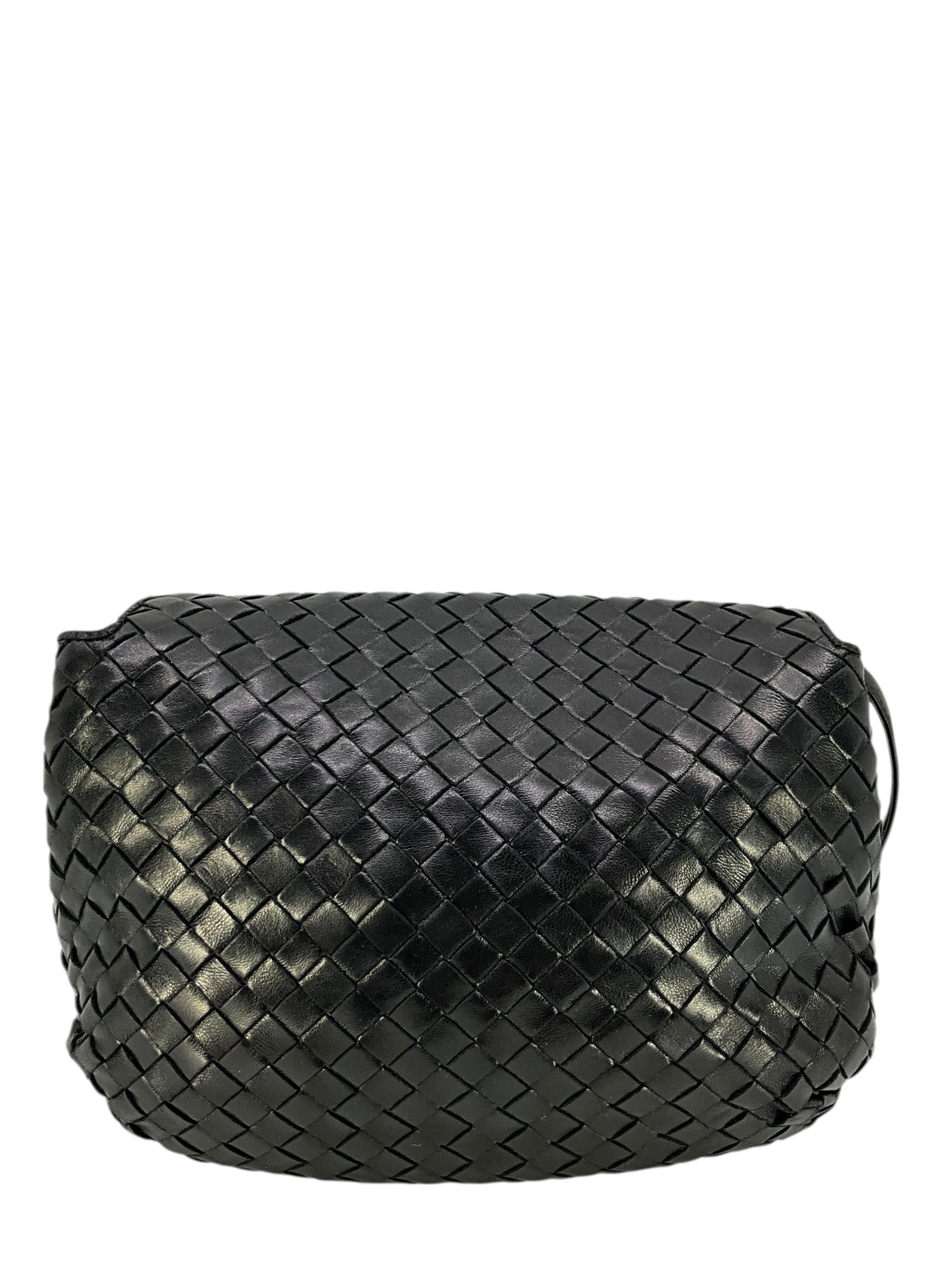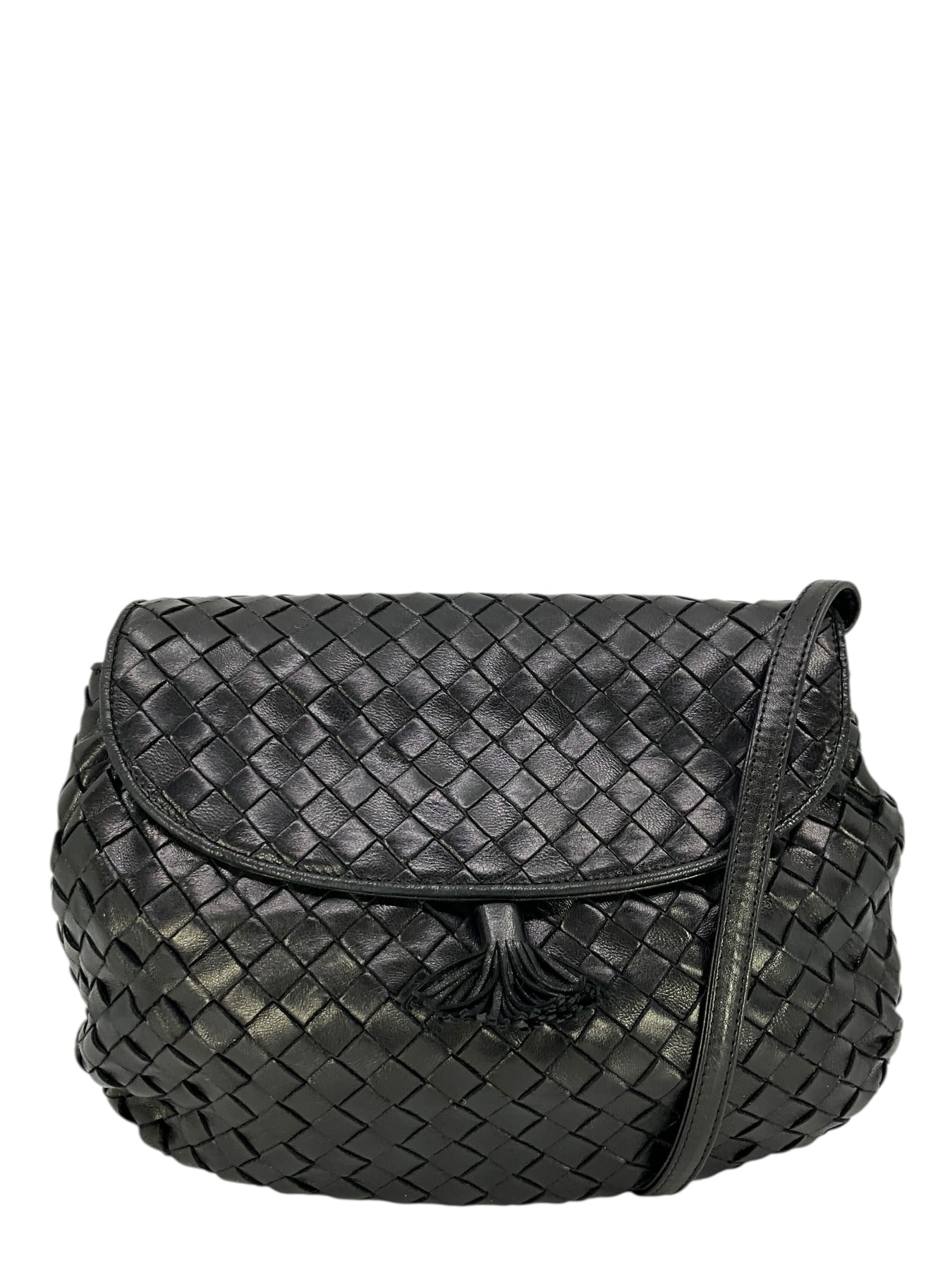 This authentic Bottega Veneta Vintage Intrecciato Leather Crossbody Bag is crafted from iconic black woven leather. It features an adjustable long thin shoulder strap that can be tucked away neatly inside the bag and carried as a clutch.