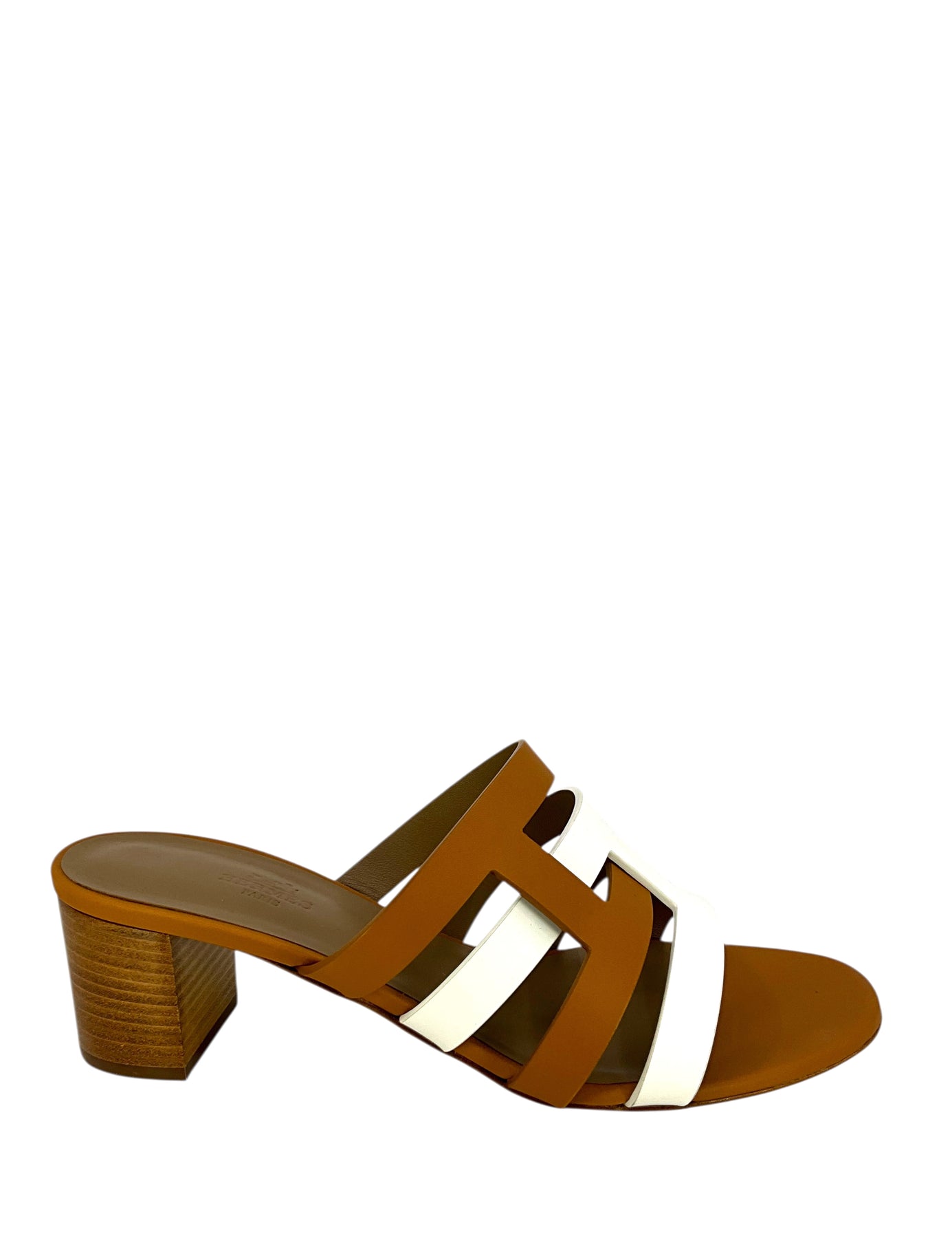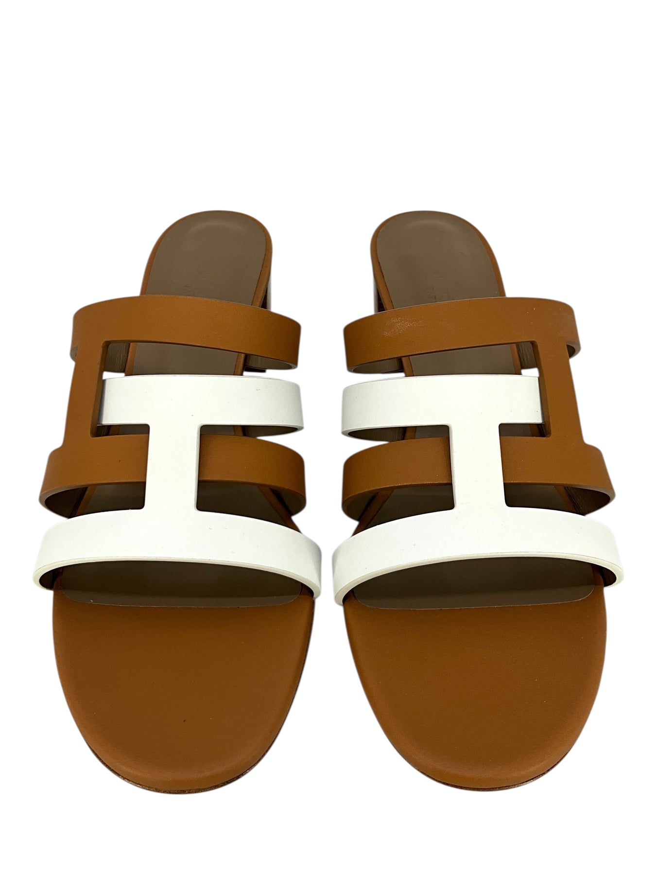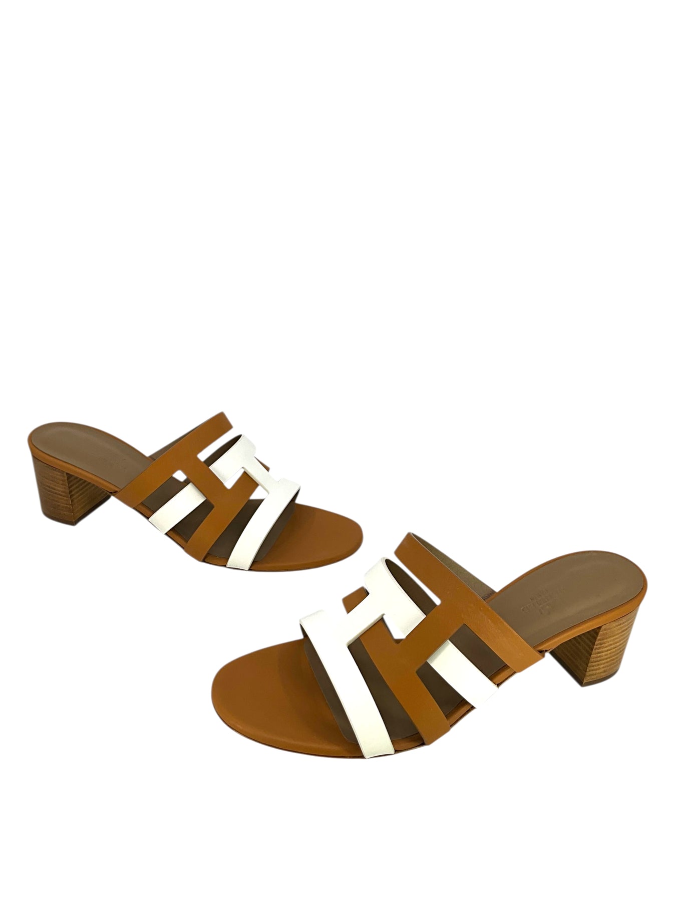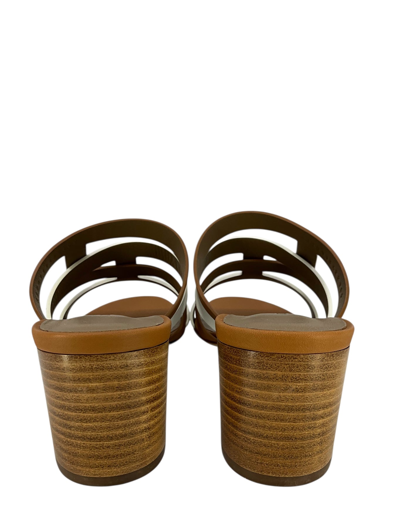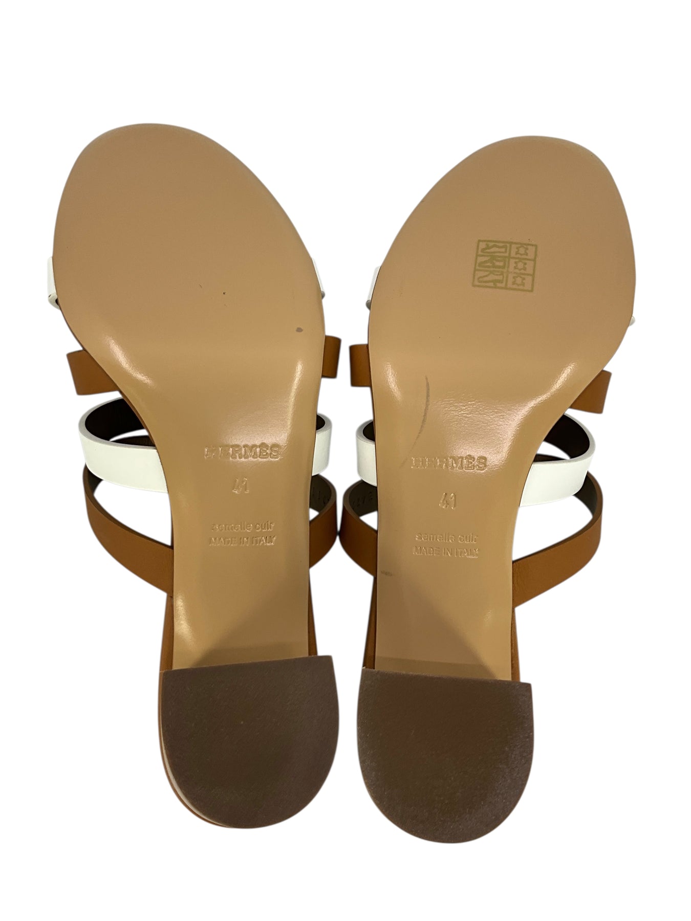 This authentic pair of never before used HERMES Amica Sandals Size 11 NEW (IT 41) define simple elegance. Expertly crafted in Italy from supple camel and white leather with a chunky wooden block heel.