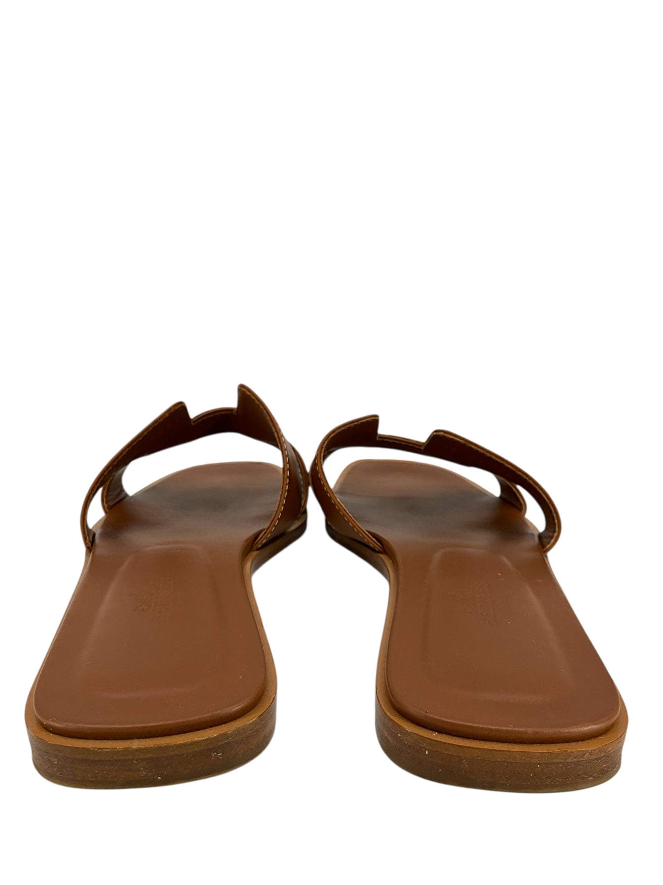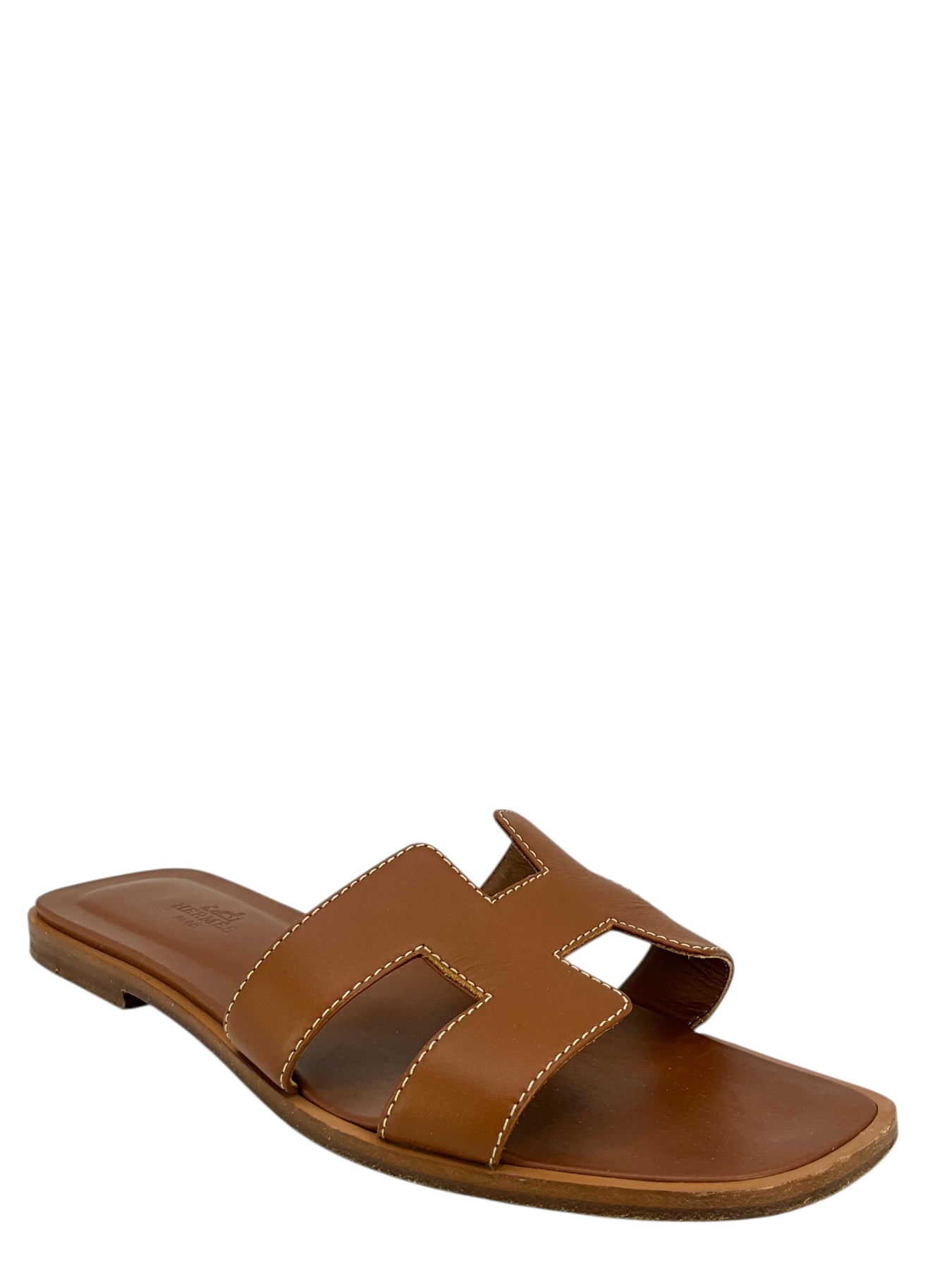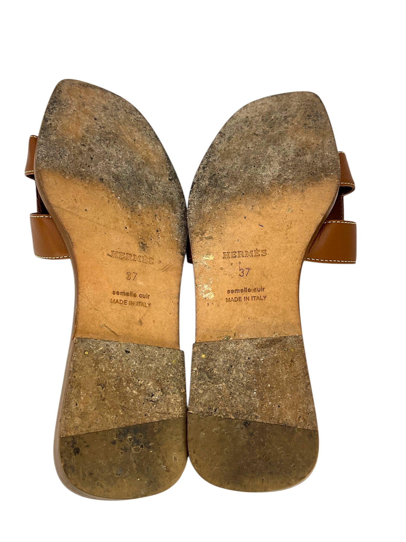 This authentic pair of HERMES Calfskin Leather Oran Sandals Size 7 define simple elegance. Expertly crafted in Italy from supple brown leather with the iconic signature H cutout.