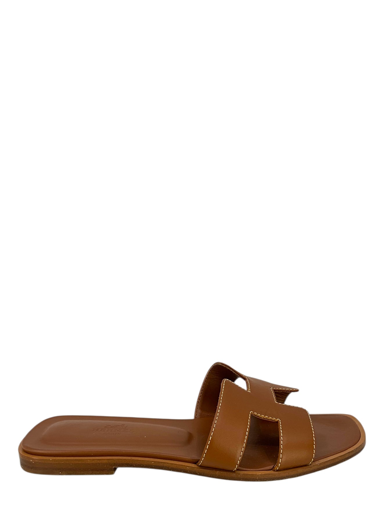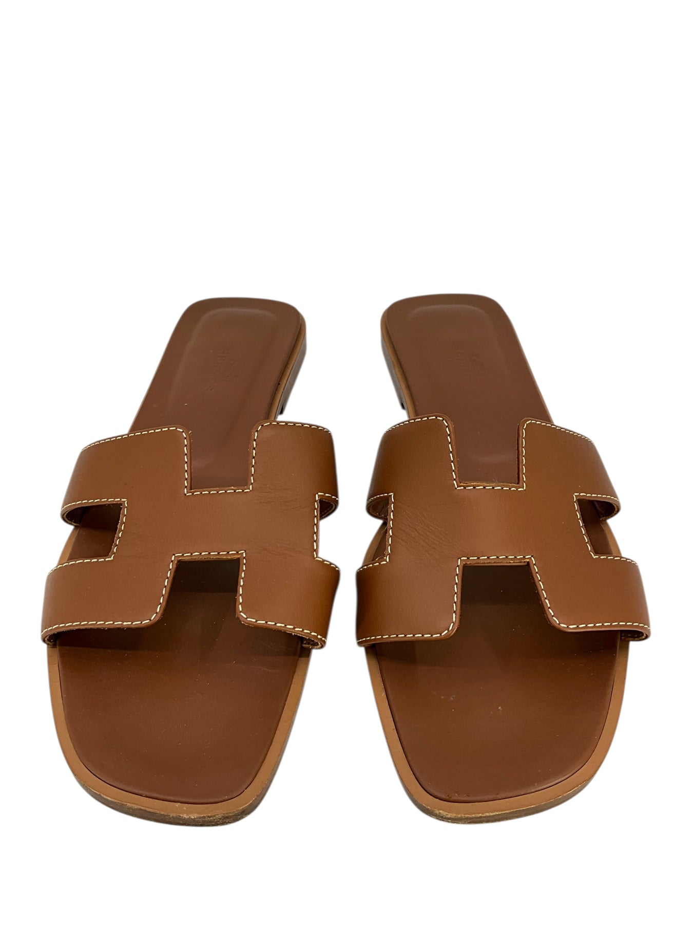 Condition: Very Good. The brown leather uppers are overall clean but have creasing on the H cross-strap. The foot-beds have minor surface scratches. The bottom soles have moderate scuffing.