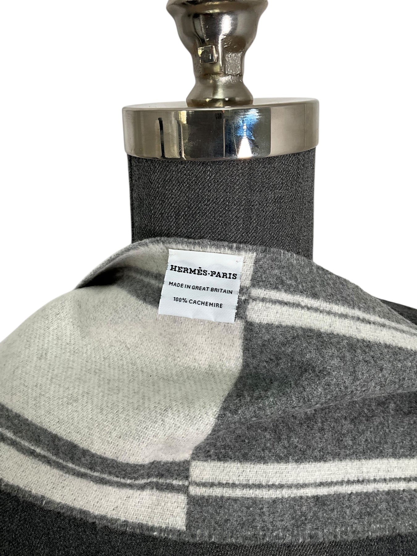 Add to your collection this thin bicolor Hermes Casaque Bande de Repos Cashmere Scarf beautifully crafted in stunning gray and ivory cashmere with a frayed bottom trim.