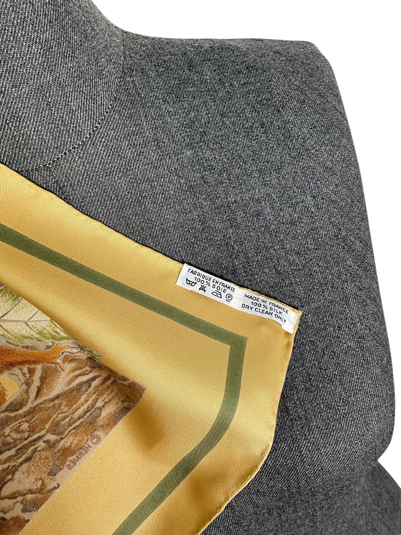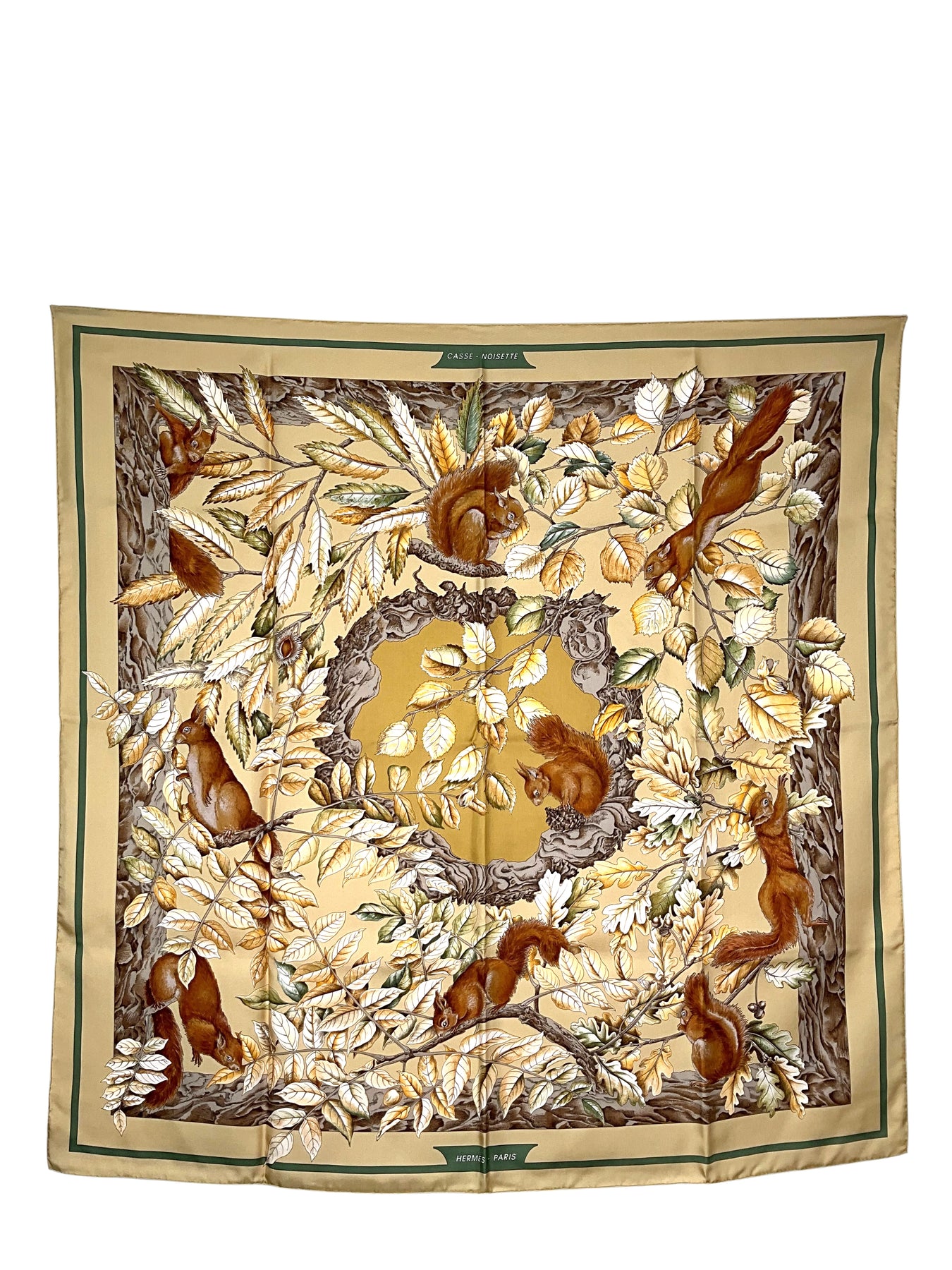 We guarantee the authenticity of this HERMES Casse Noisette Silk Scarf 90 designed by Antoine De Jacquelot and was first issued in 1988. This stunning scarf features leaf and squirrel motifs with hand-rolled edges.