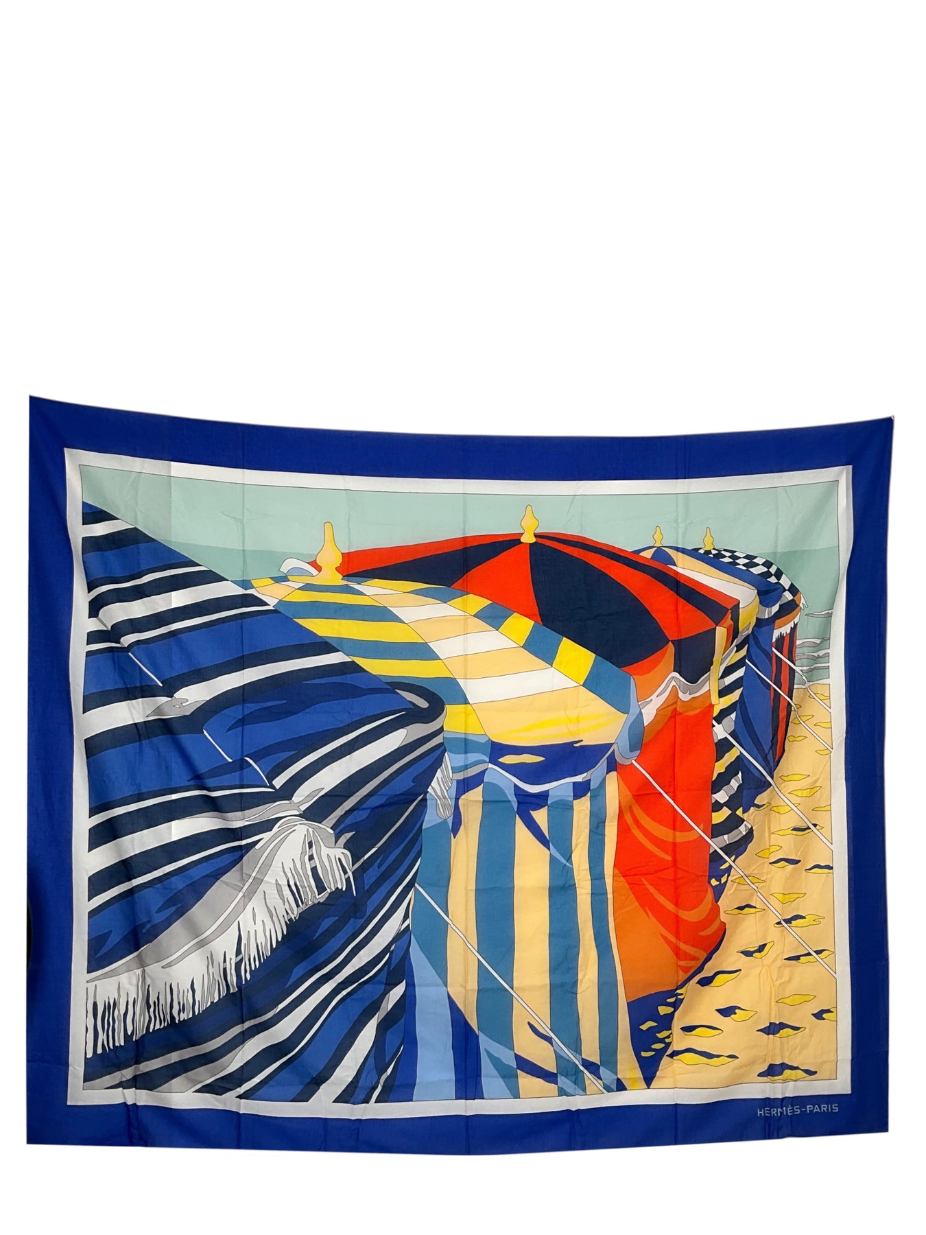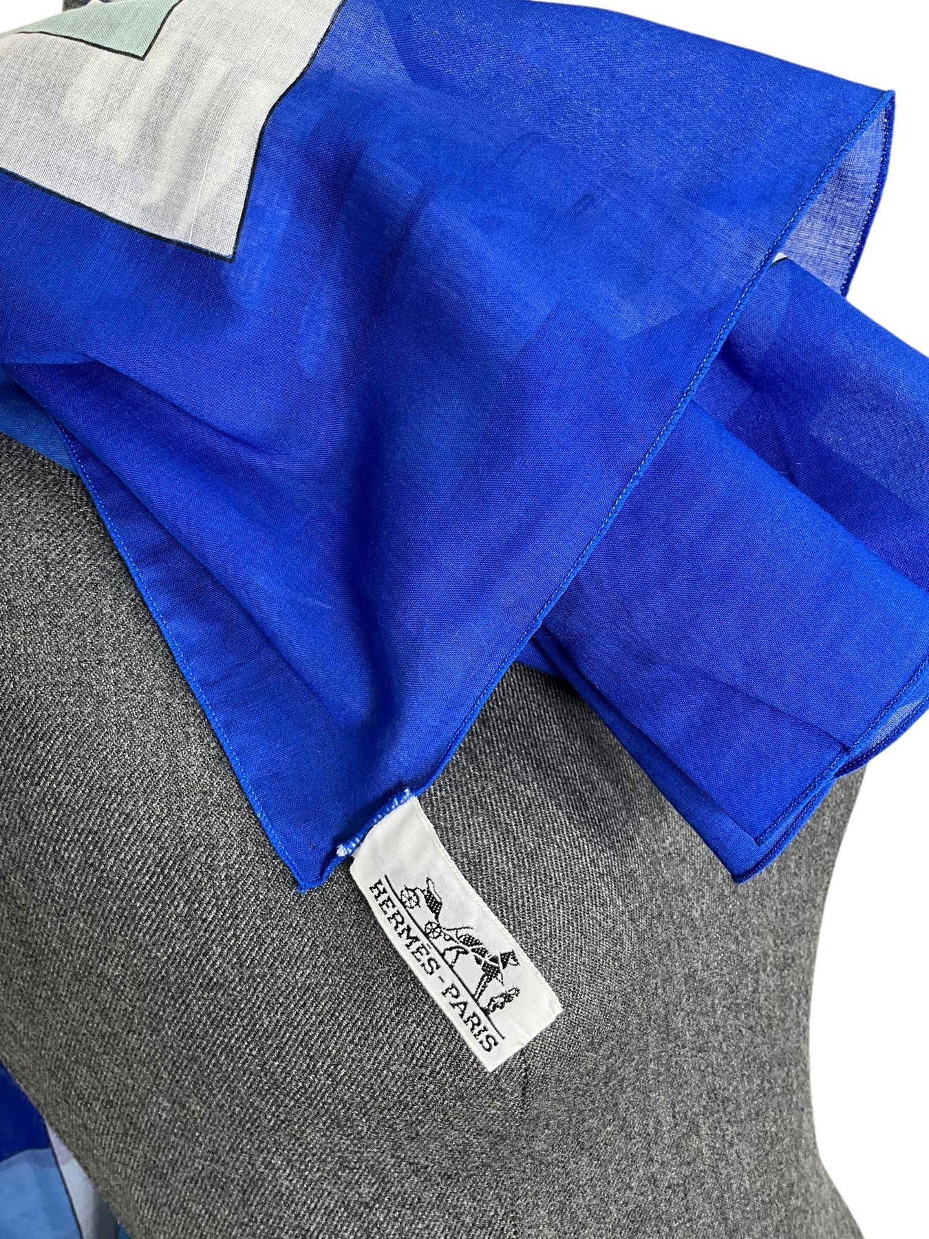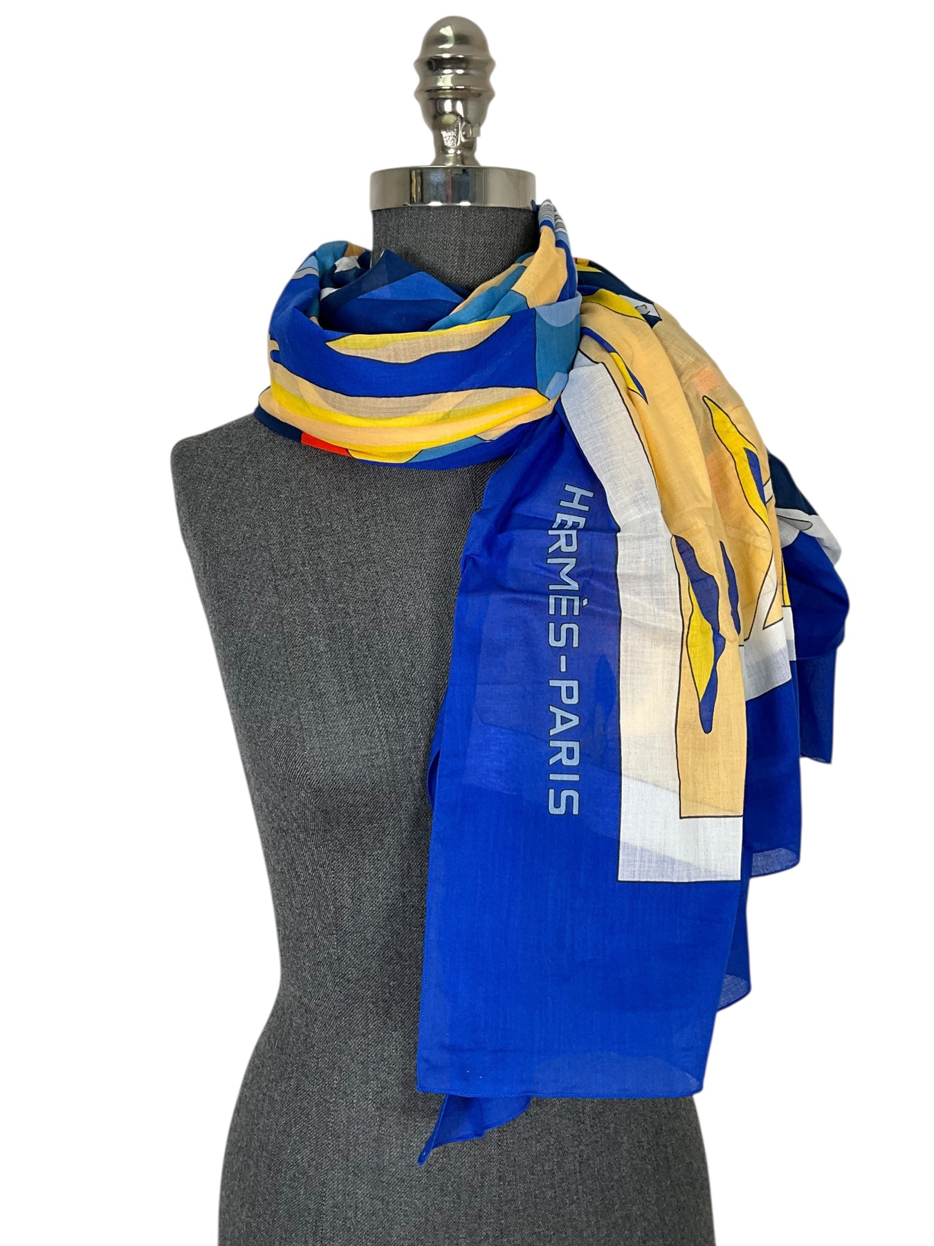 We guarantee the authenticity of this HERMES Charmes Des Plages Normandes Cotton Pereo Scarf Shawl designed by Loic Dubigeon and first issued in 1999. This stunning scarf features beautiful blue and multicolored hues.