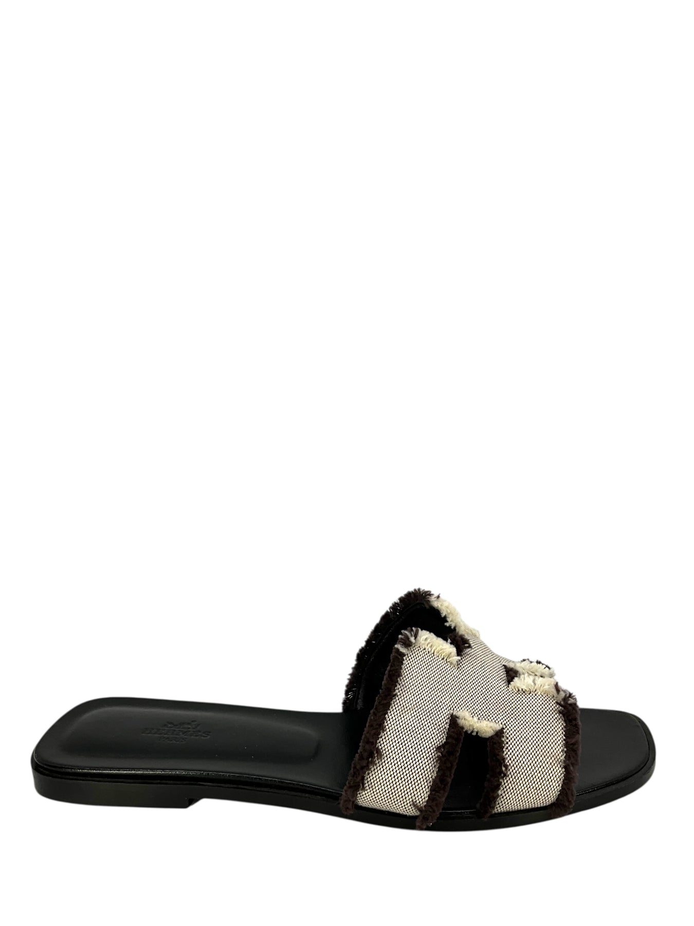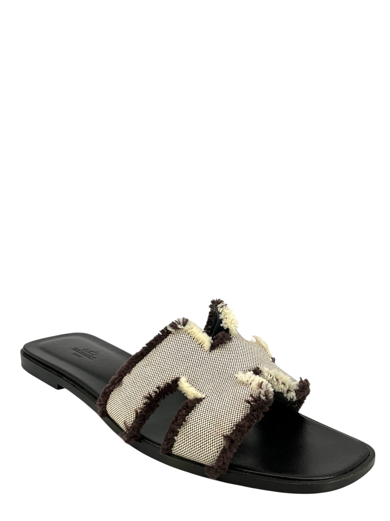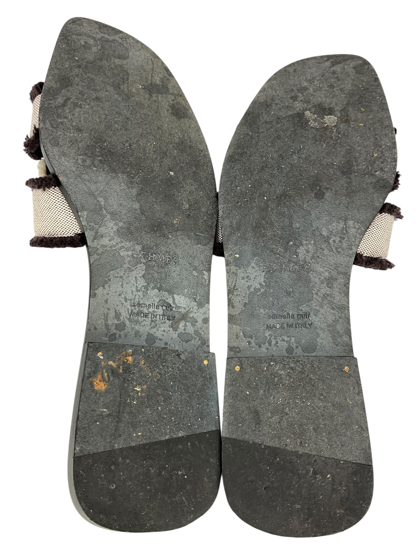 This authentic pair of HERMES Calfskin Leather Oran Sandals Size 7 | IT 37 define simple elegance. Expertly crafted in Italy from natural canvas and a dark brown fringe trim with the iconic signature 'H' cutout.