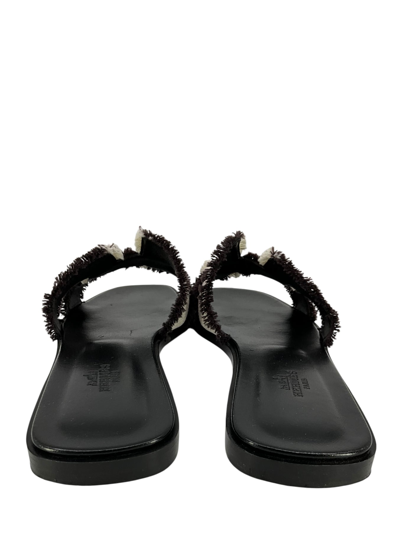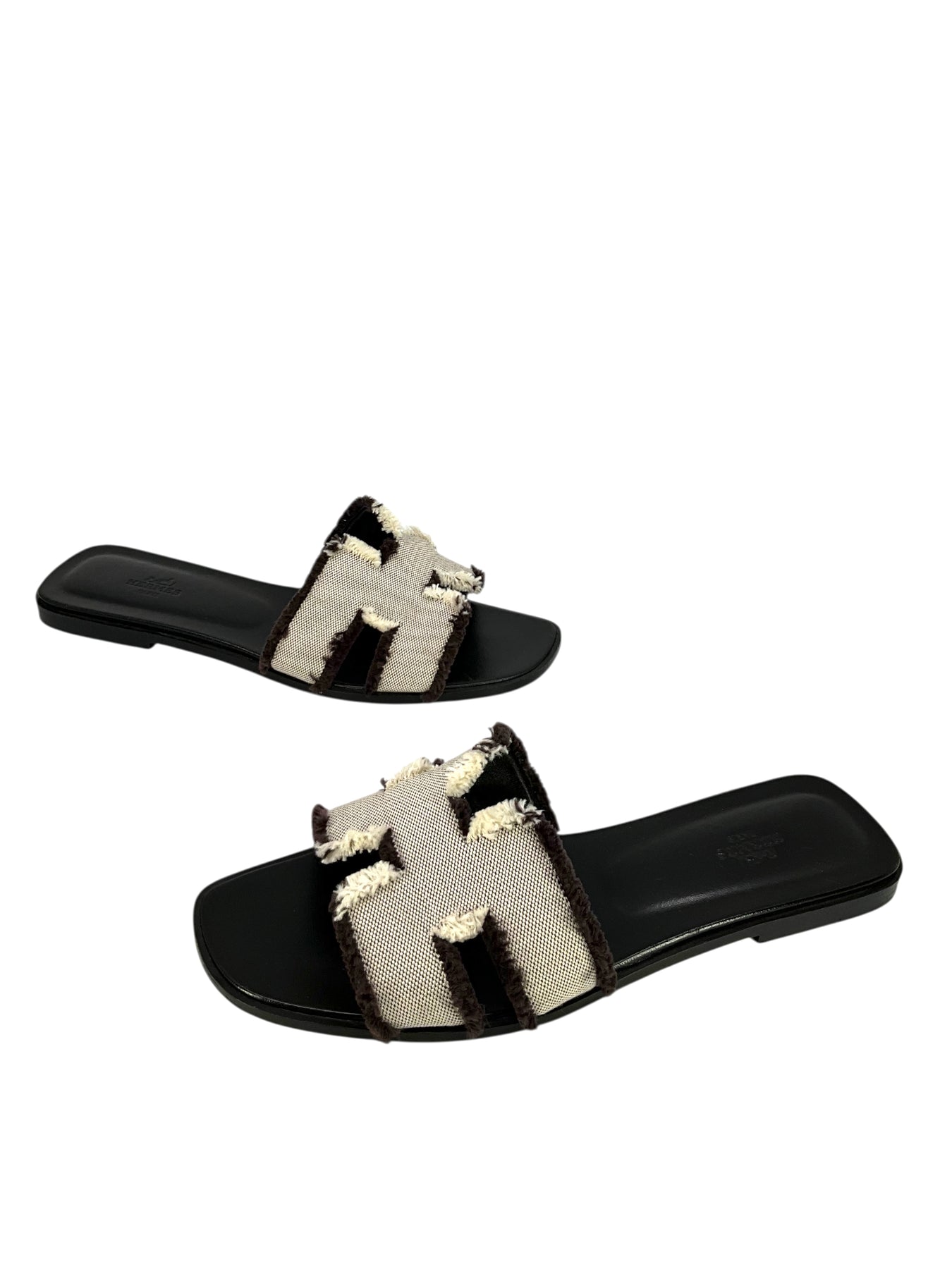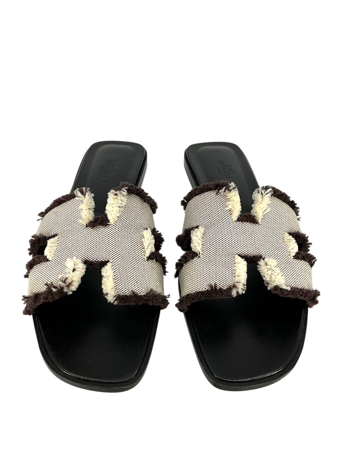 This authentic pair of HERMES Calfskin Leather Oran Sandals Size 7 | IT 37 define simple elegance. Expertly crafted in Italy from natural canvas and a dark brown fringe trim with the iconic signature 'H' cutout.