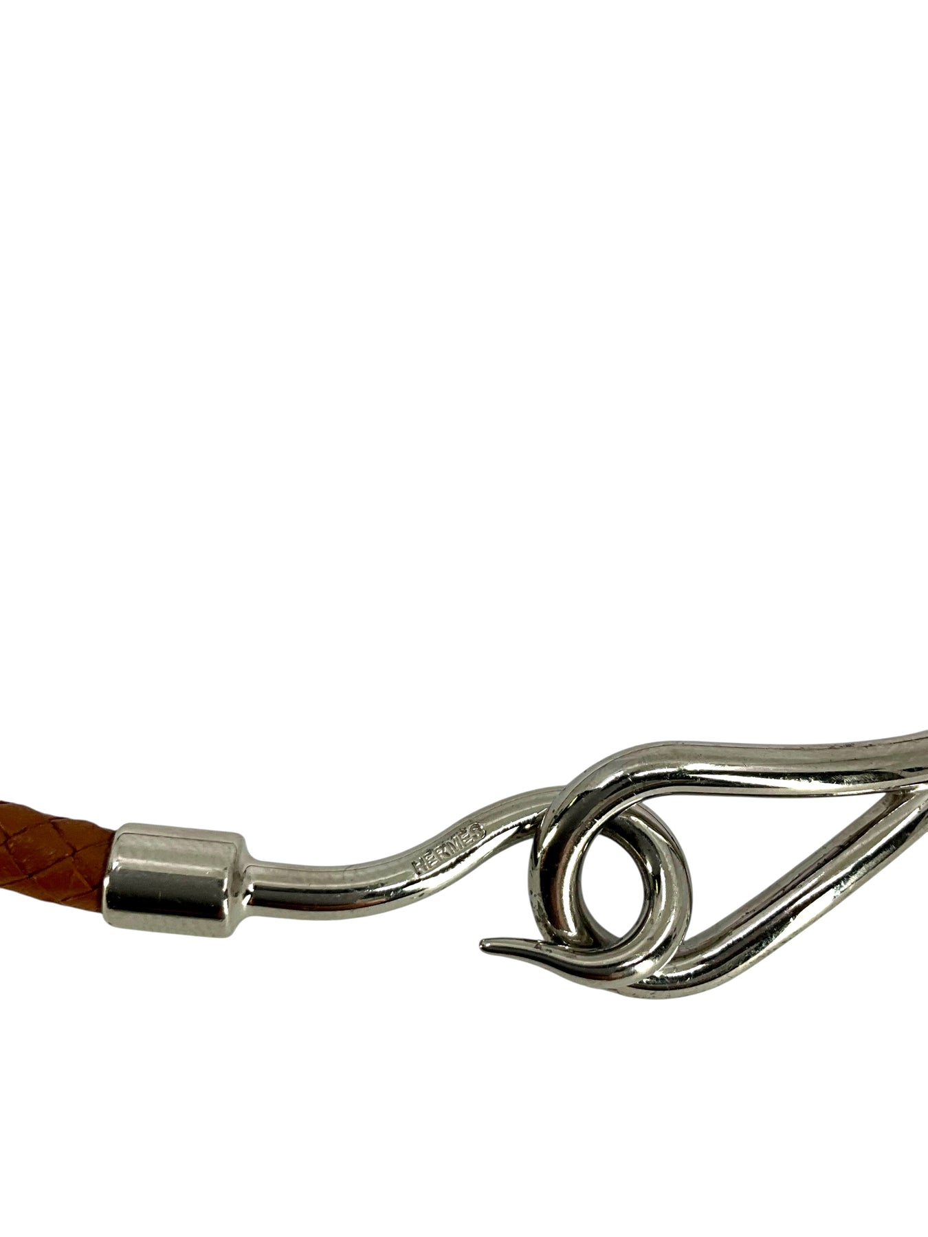 We guarantee the authenticity of this stunning Hermes Jumbo Hook Double Tour Bracelet featuring a braided brown leather cord with a palladium hook closure that wraps twice around your wrist.