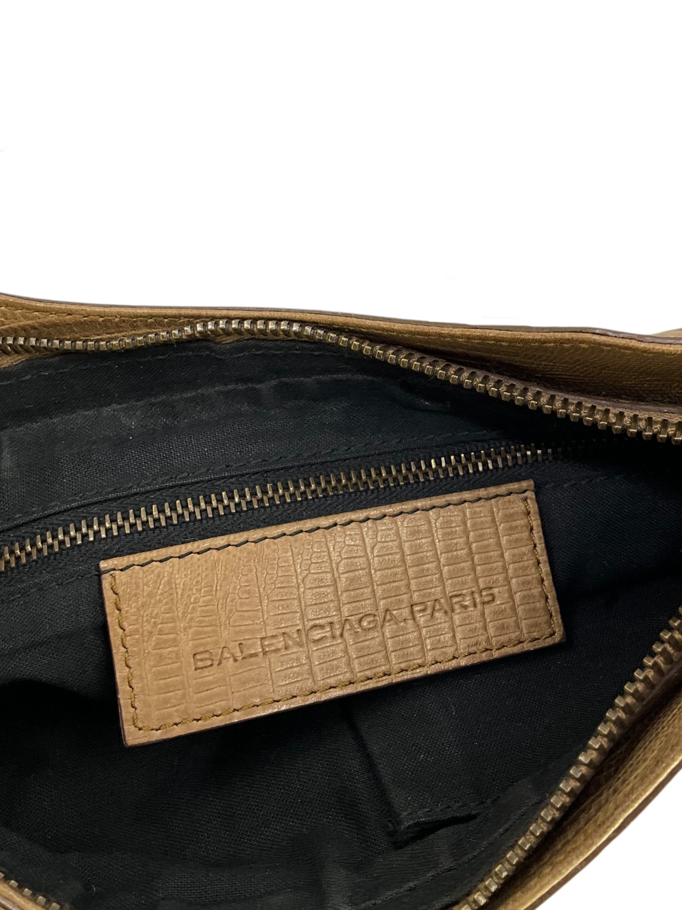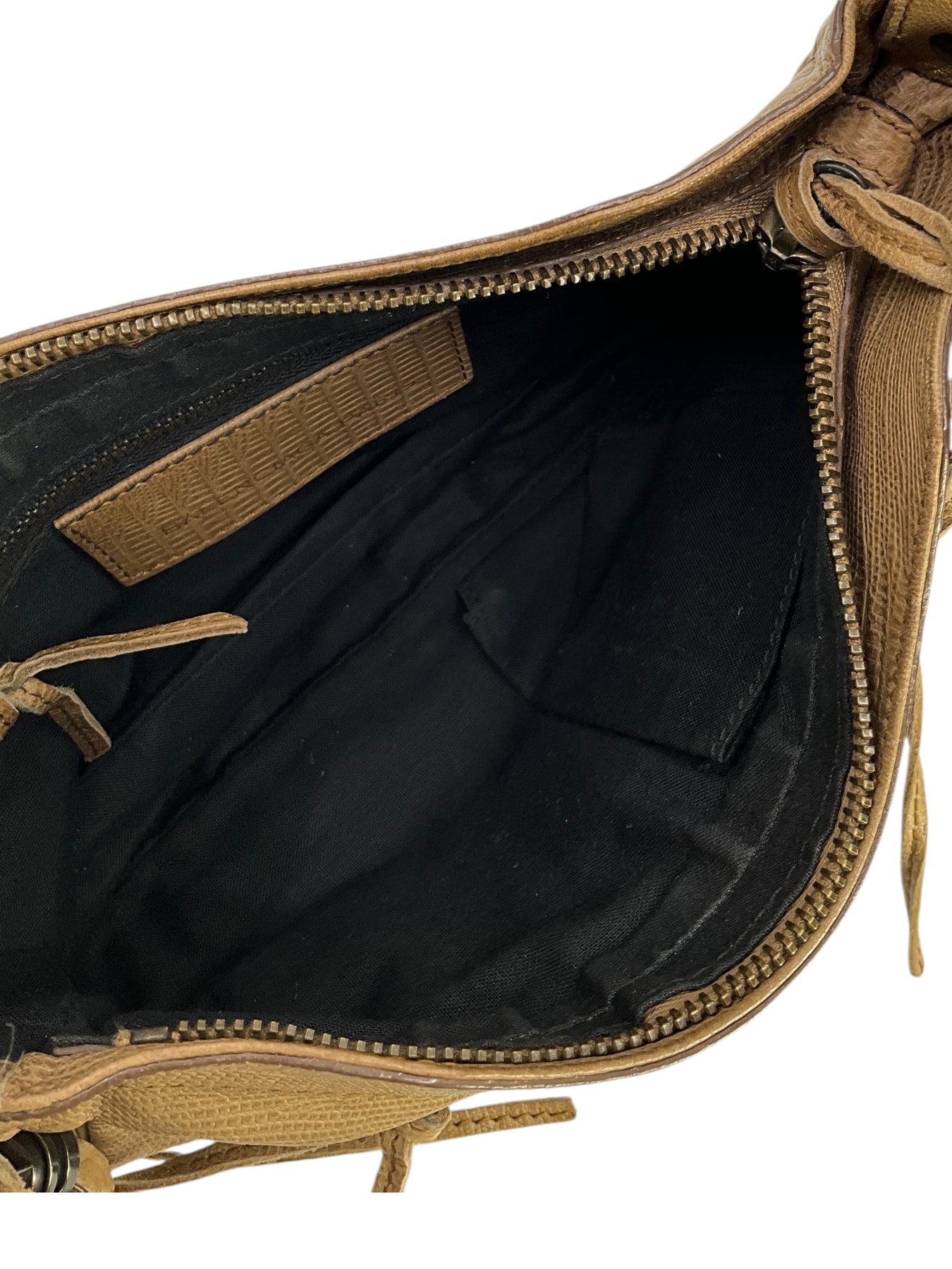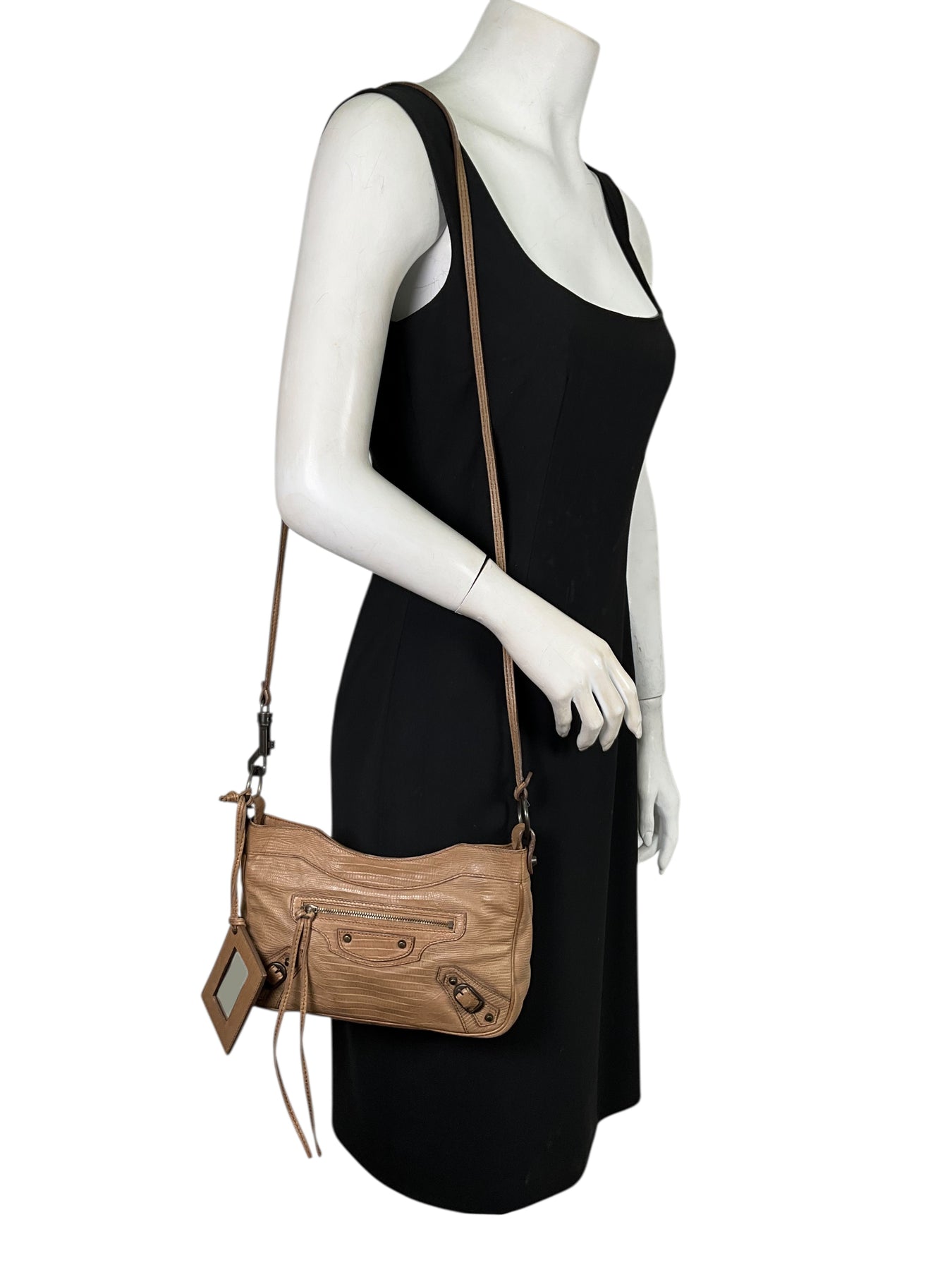 This authentic Balenciaga Motocross Classic Hip Crossbody Bag makes for the perfect bag for just the essentials. This bag is crafted from textured brown leather. It features a removable crossbody strap, bronze studded hardware, a front zip compartment and hanging hand mirror.