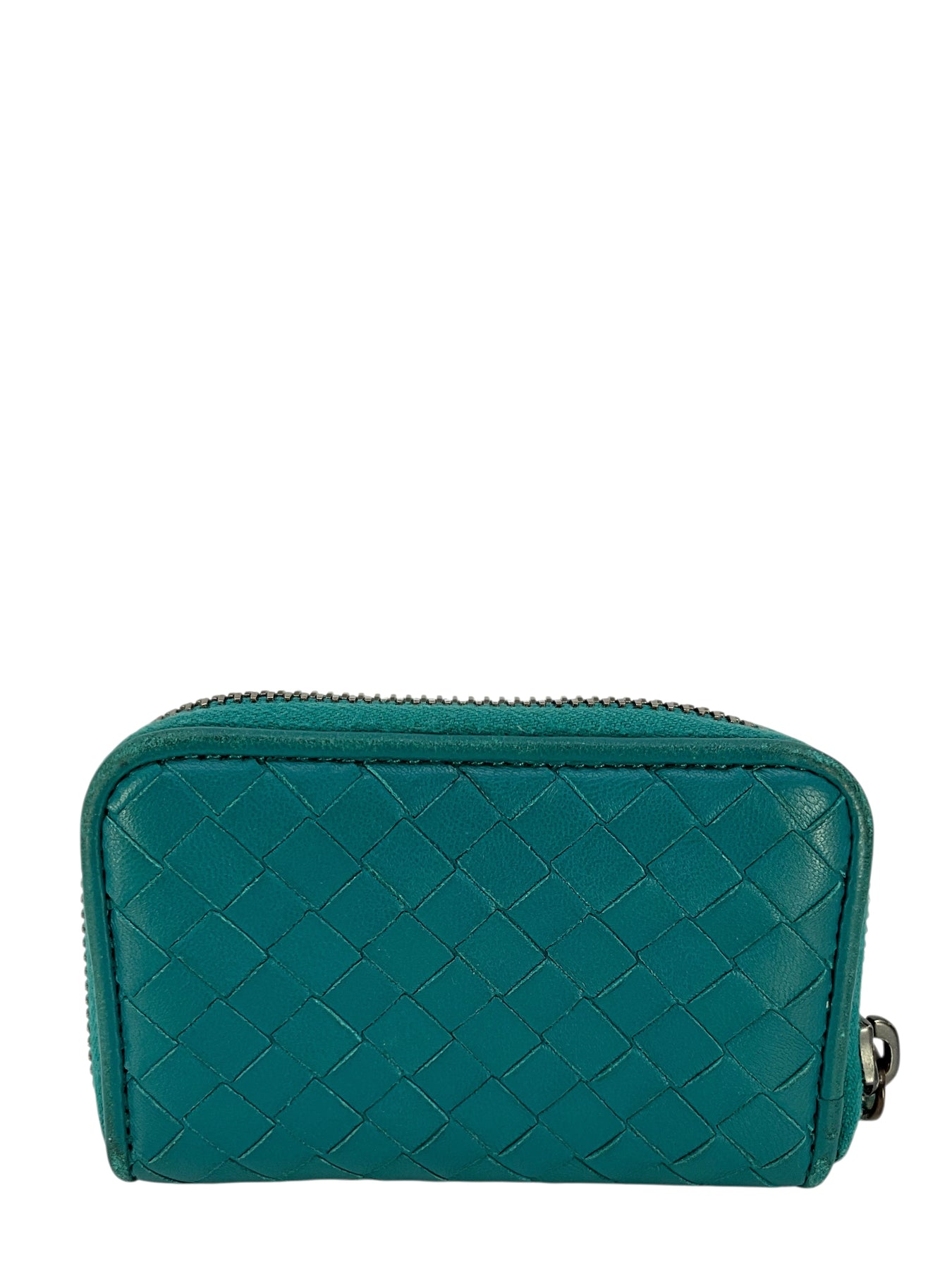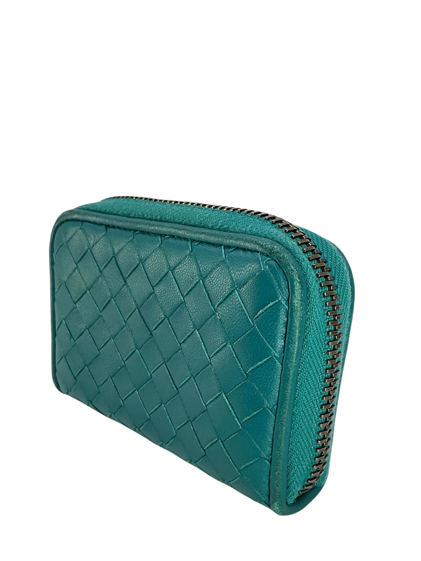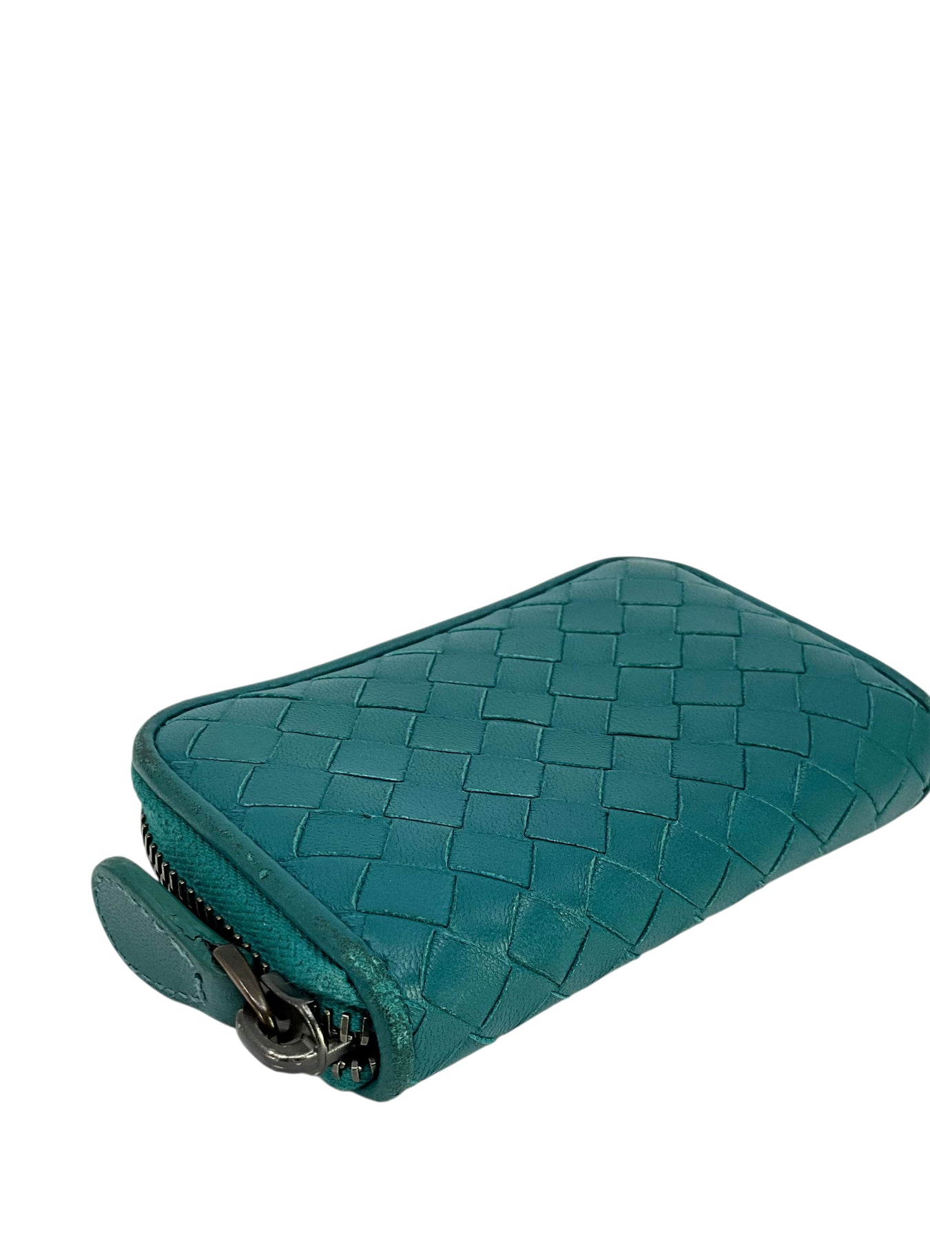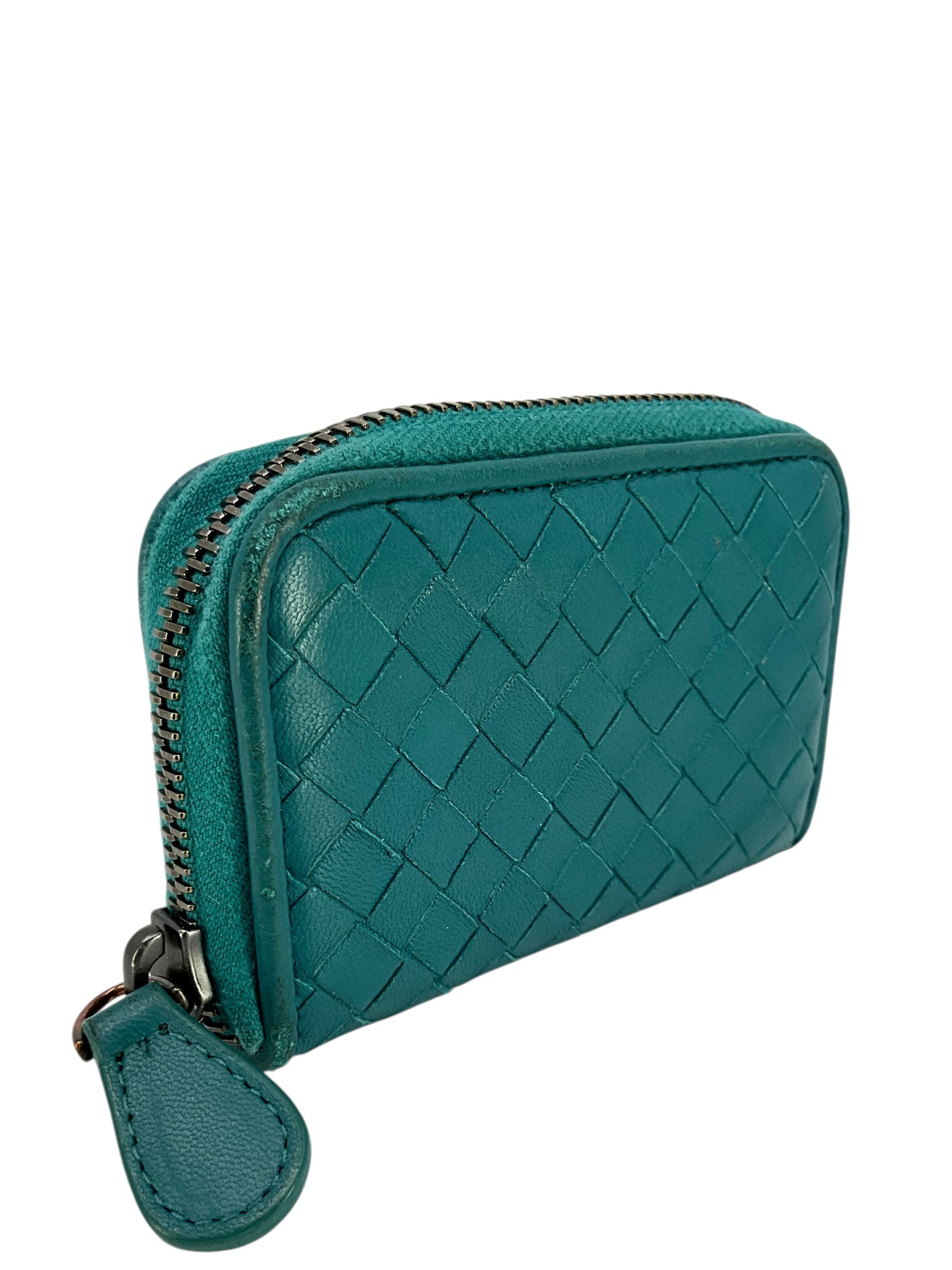 This is an authentic Bottega Veneta Intrecciato Woven Leather Card Holder crafted in teal leather with a secure zip-around closure