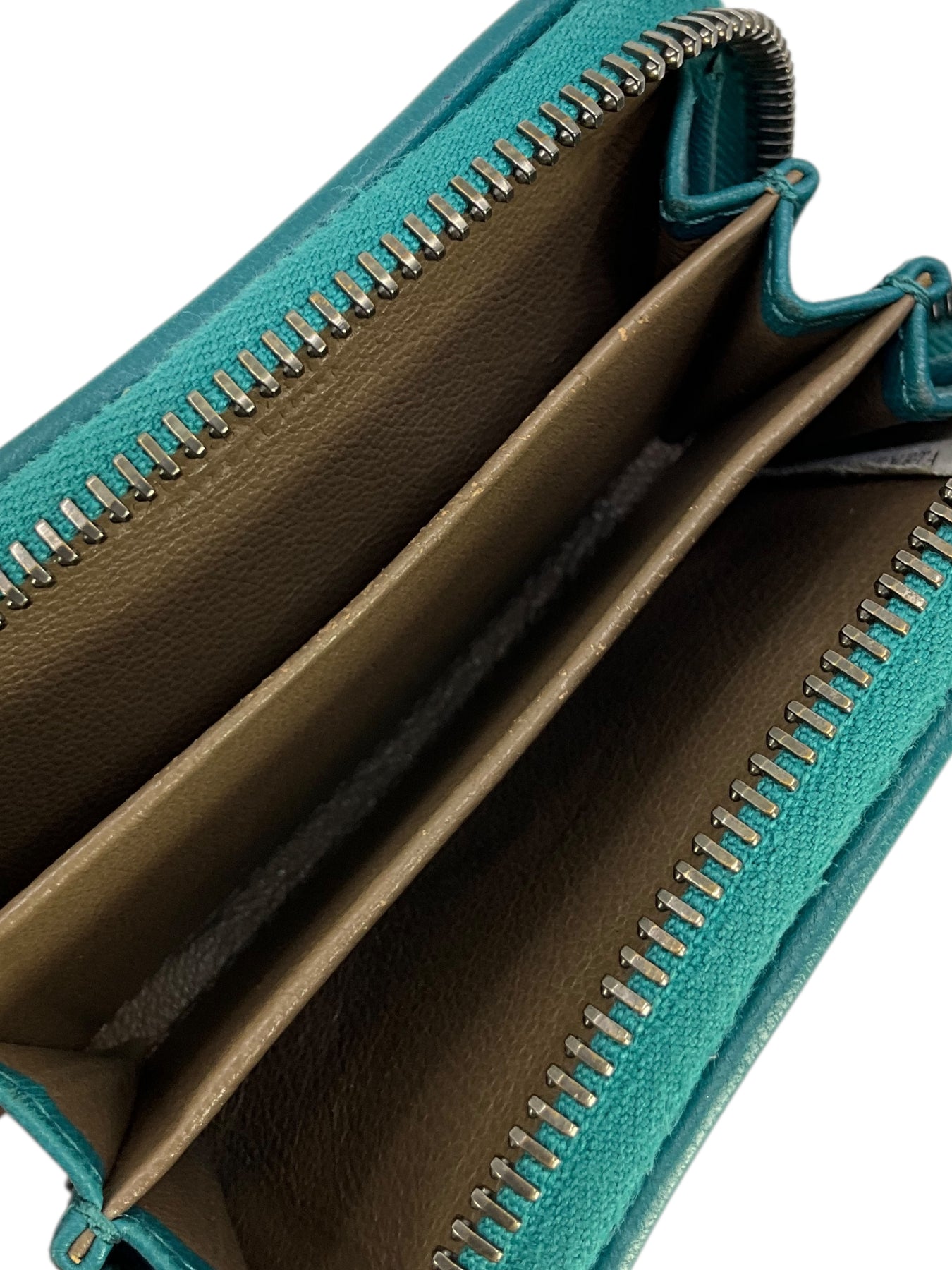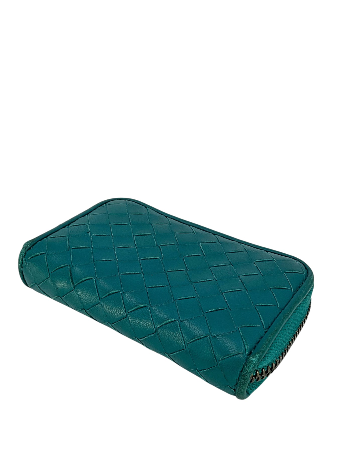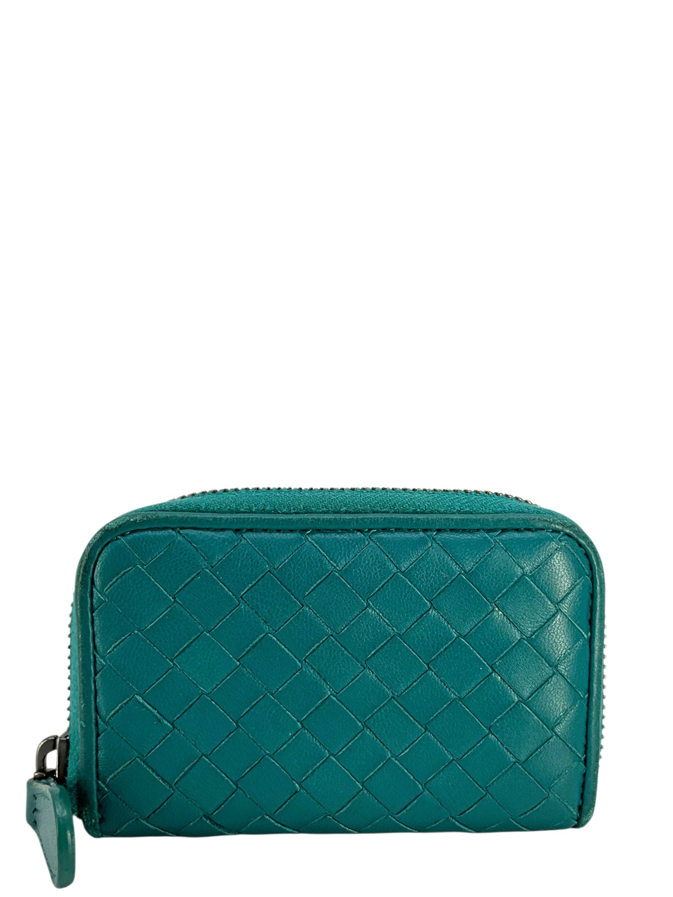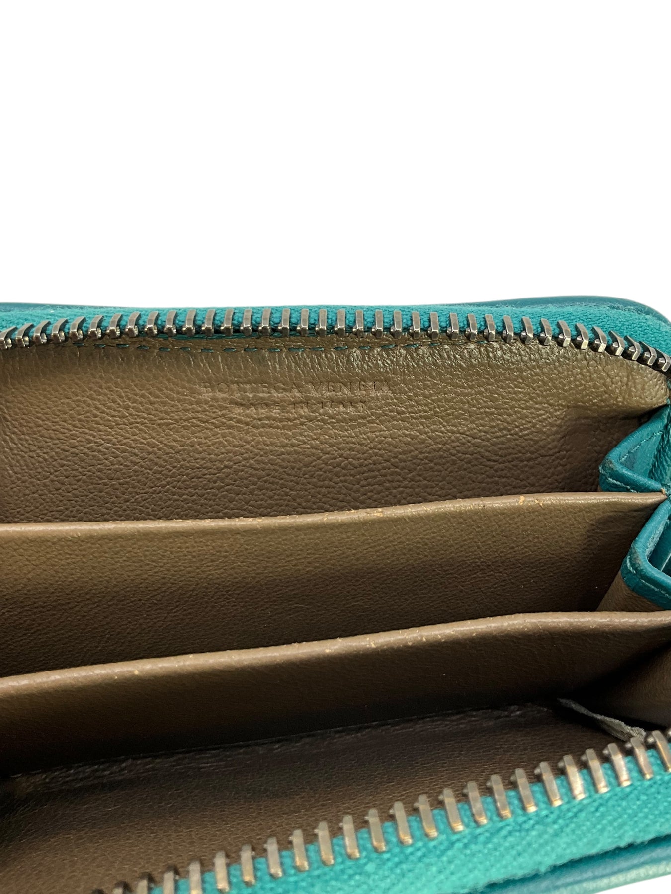 This is an authentic Bottega Veneta Intrecciato Woven Leather Card Holder crafted in teal leather with a secure zip-around closure