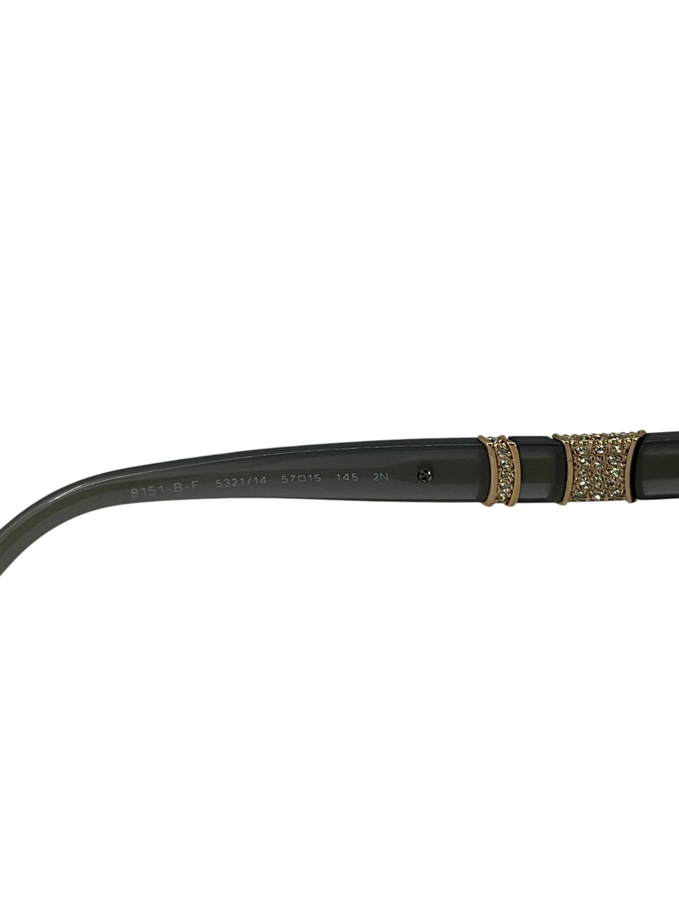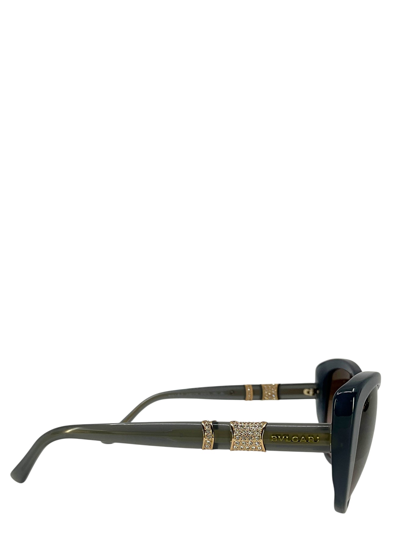 Add to your collection this guaranteed authentic pair of Bvlgari Cat Eye Sunglasses BV8151B featuring gray acetate frames and gold-tone metal crystal accents at the temples.