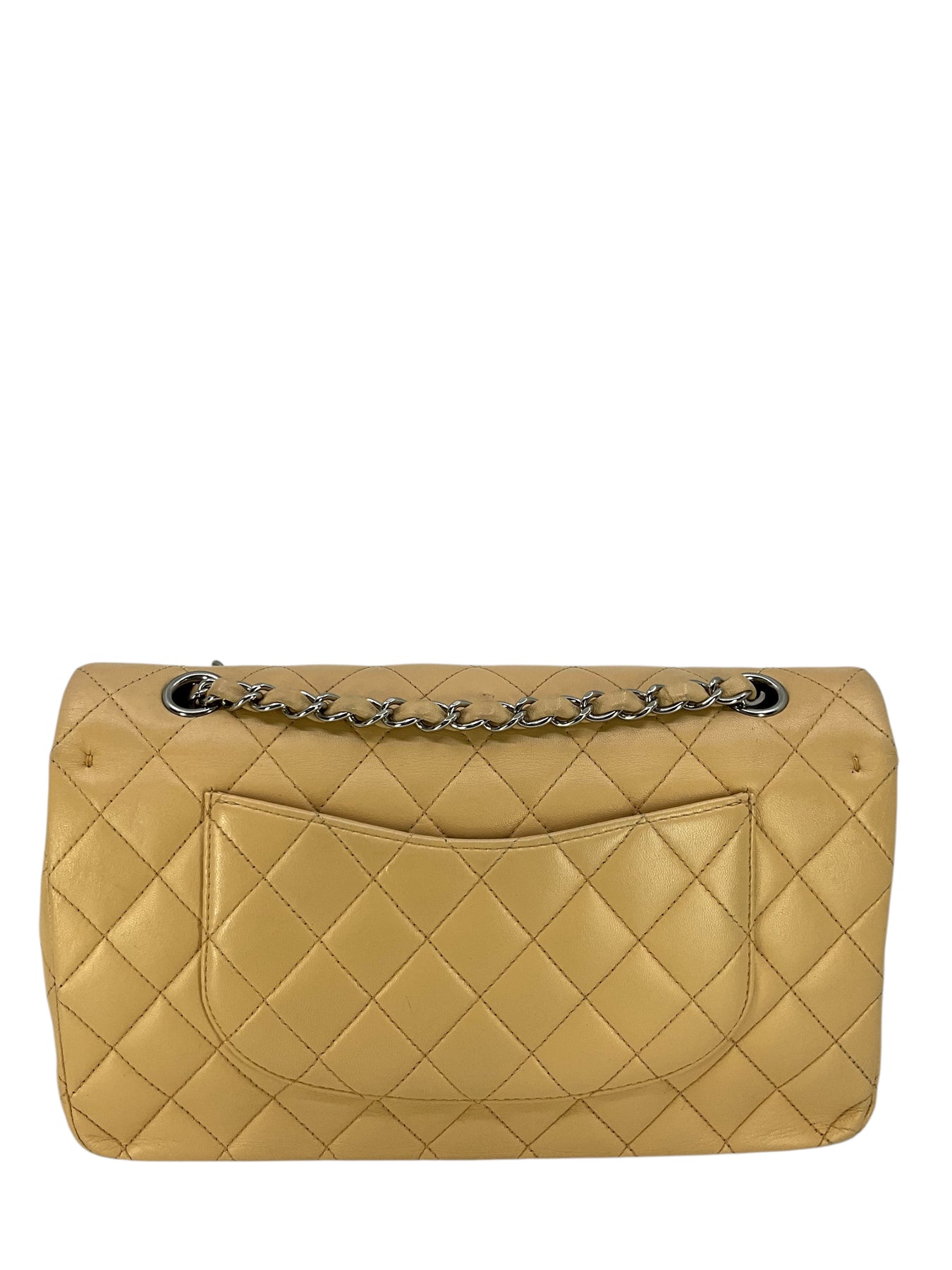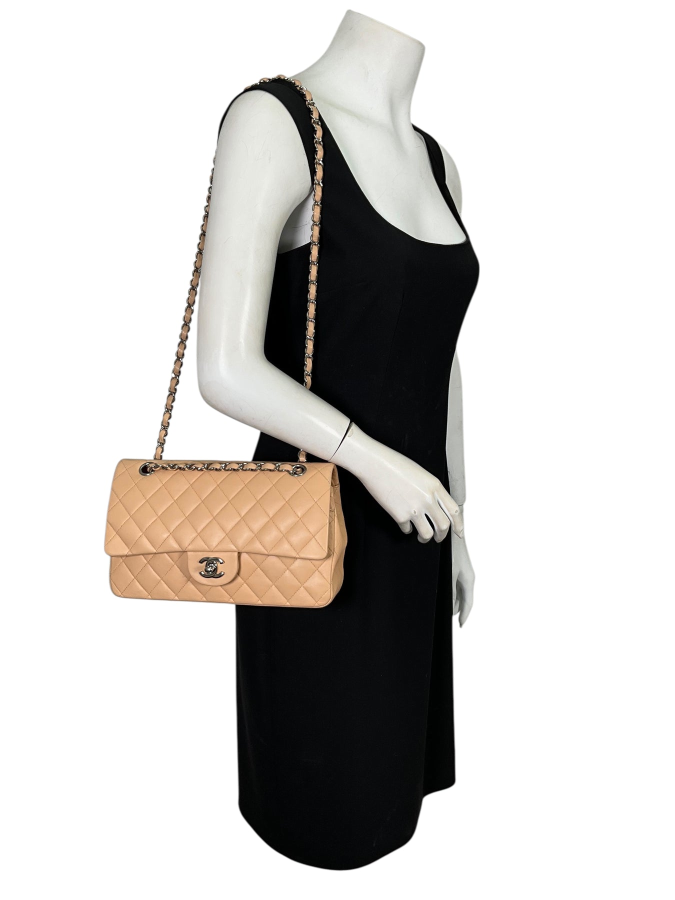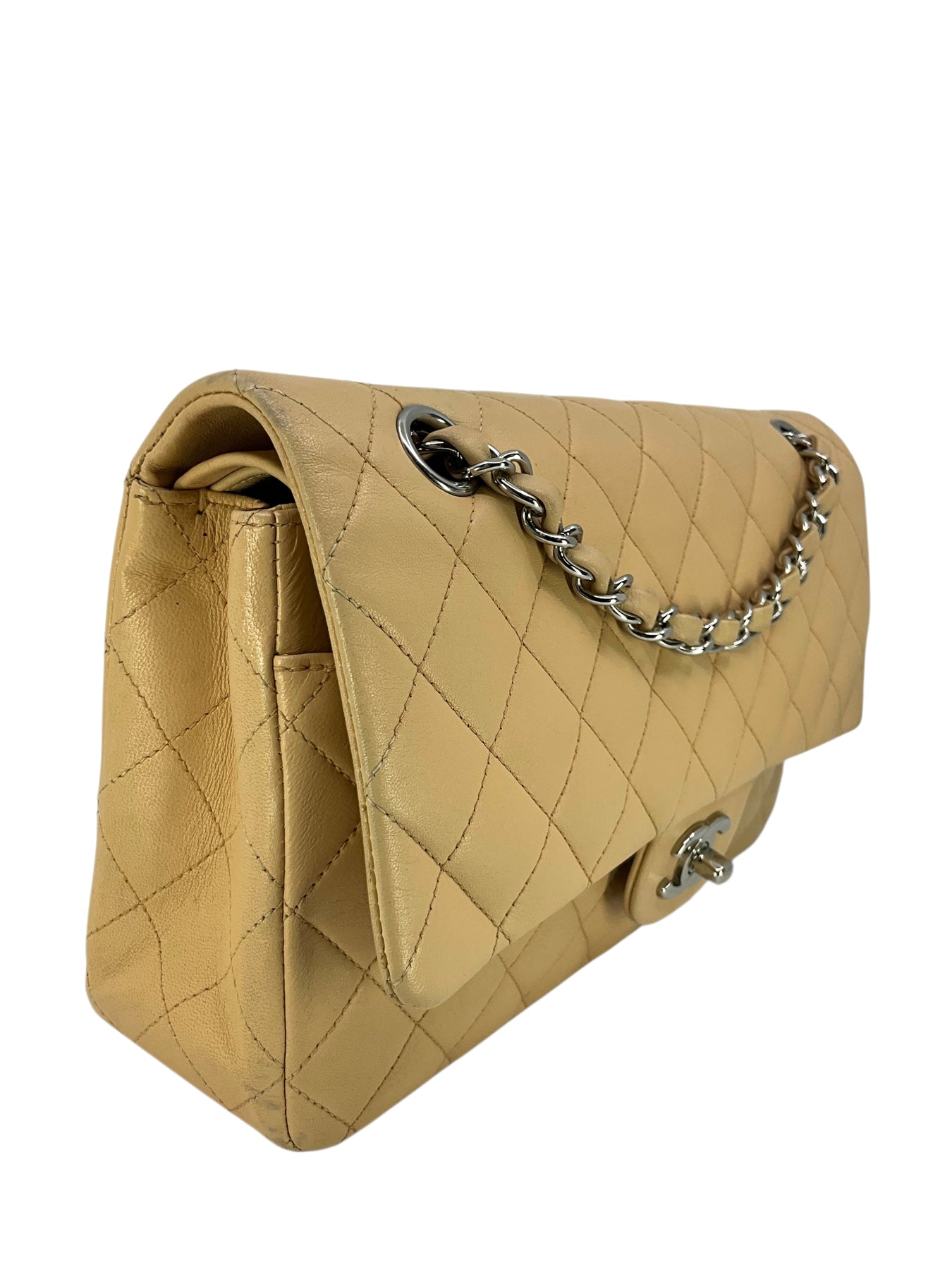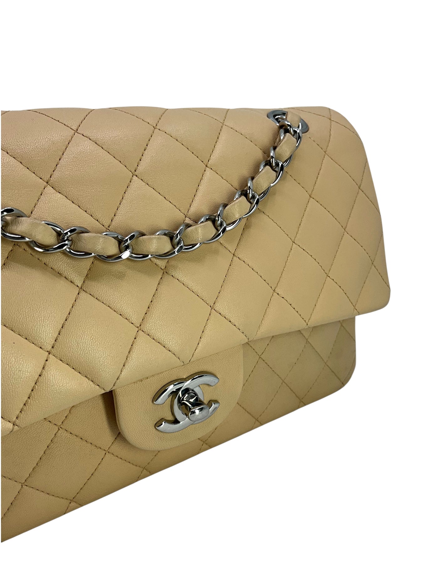 We guarantee the authenticity of this Chanel Quilted Lambskin Medium Classic Double Flap Bag crafted in supple beige diamond quilted lambskin leather and silver-tone hardware. This iconic bag features a chain link and leather shoulder strap that can be worn long or doubled, an exterior rear pocket and a double front flap with signature CC turn lock closure.