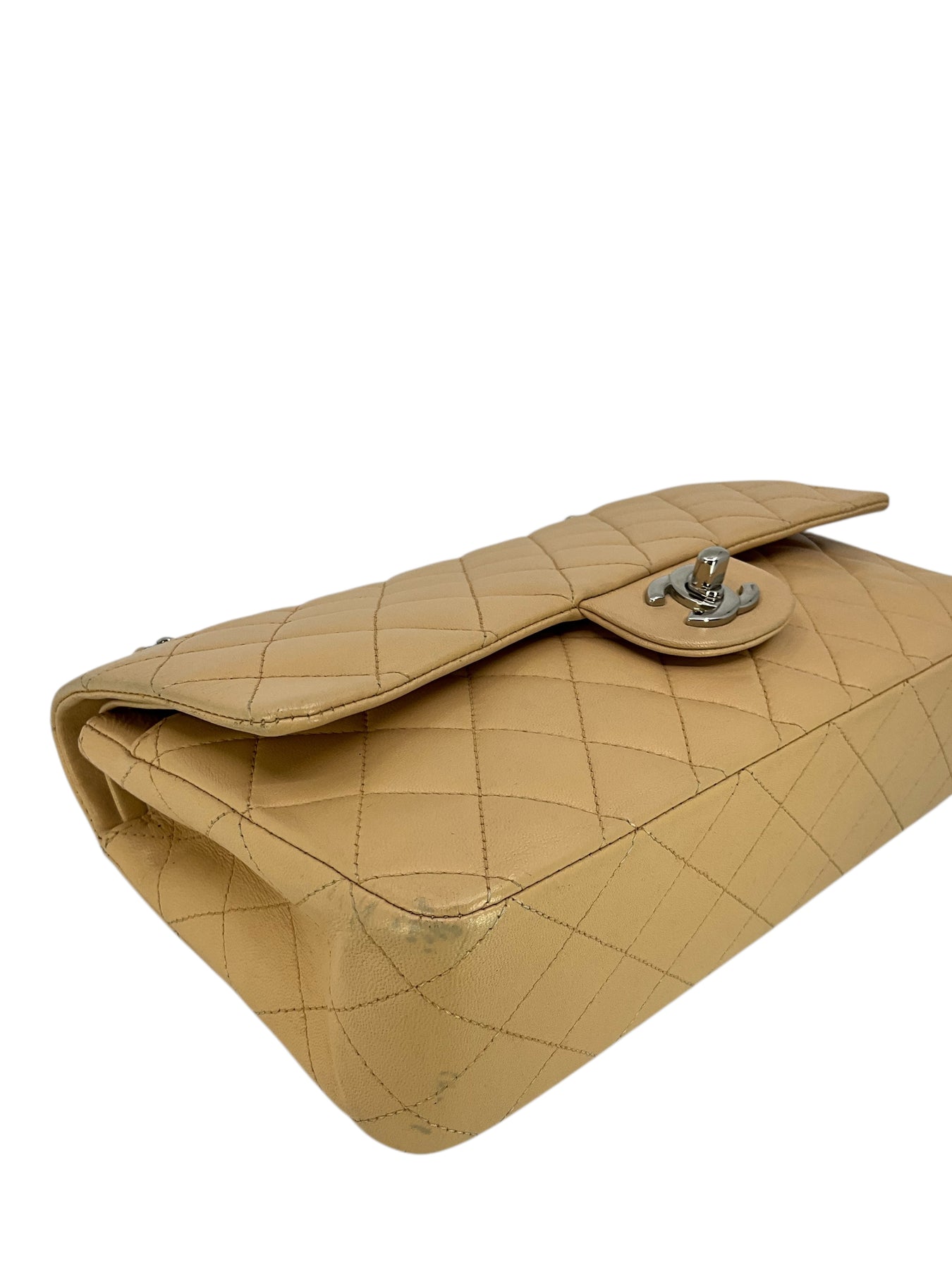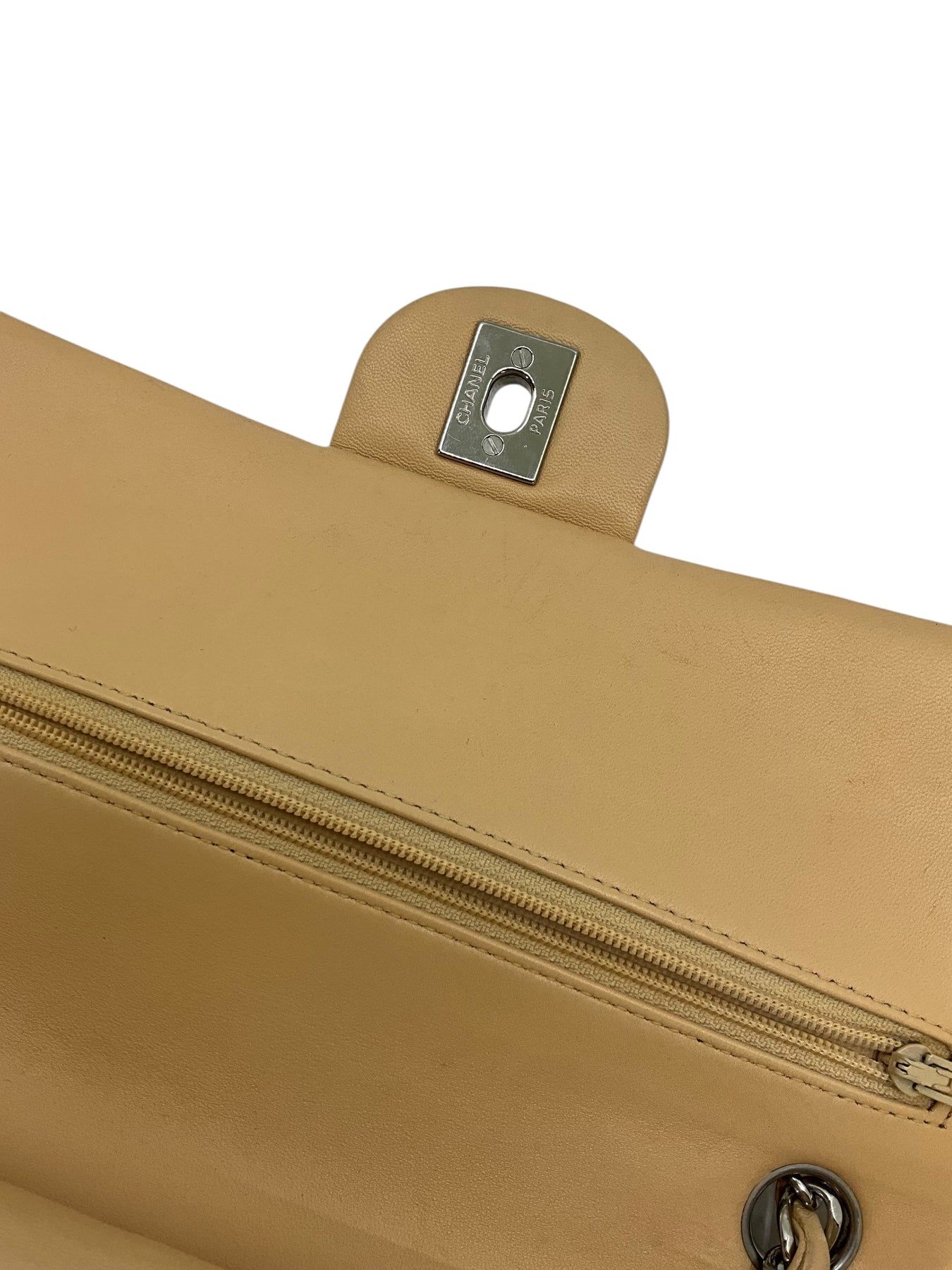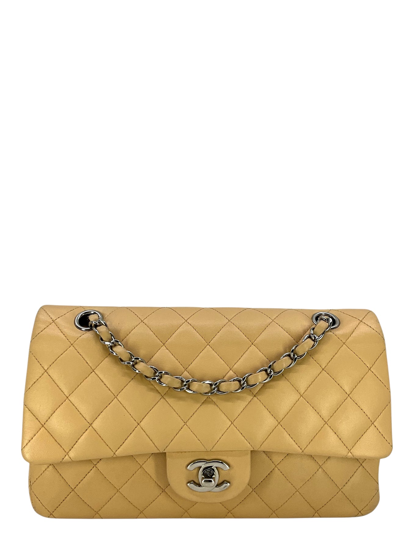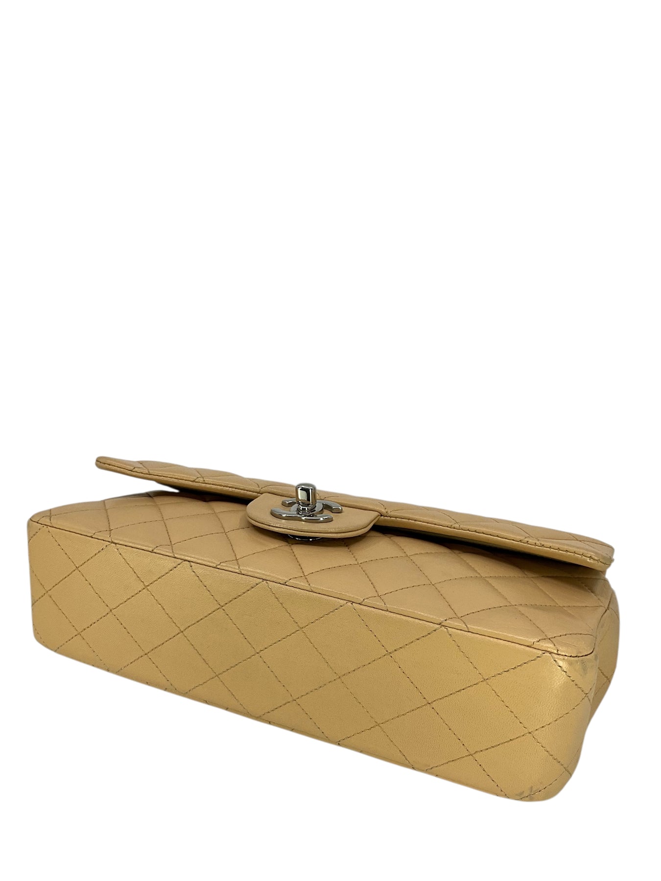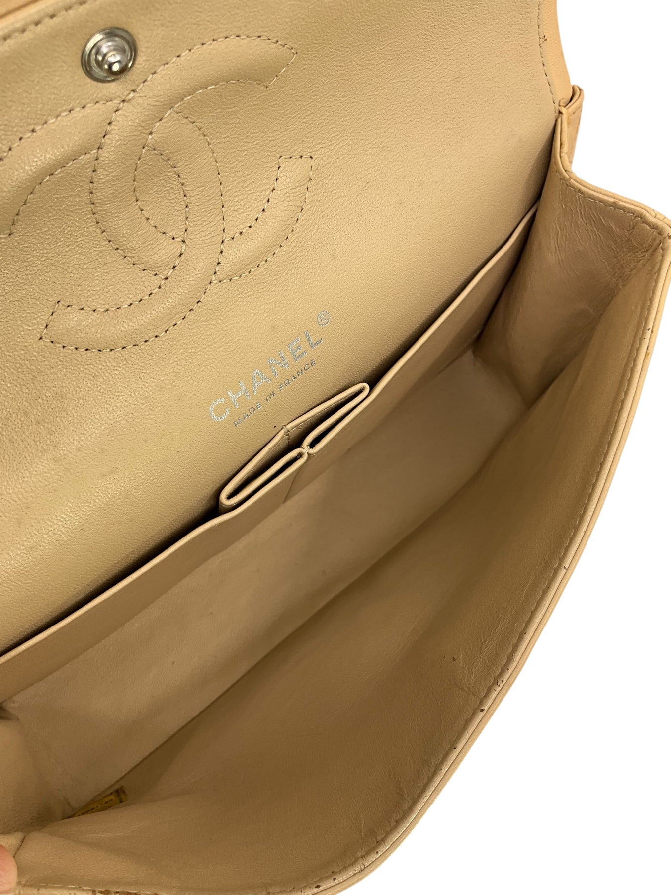 We guarantee the authenticity of this Chanel Quilted Lambskin Medium Classic Double Flap Bag crafted in supple beige diamond quilted lambskin leather and silver-tone hardware. This iconic bag features a chain link and leather shoulder strap that can be worn long or doubled, an exterior rear pocket and a double front flap with signature CC turn lock closure.