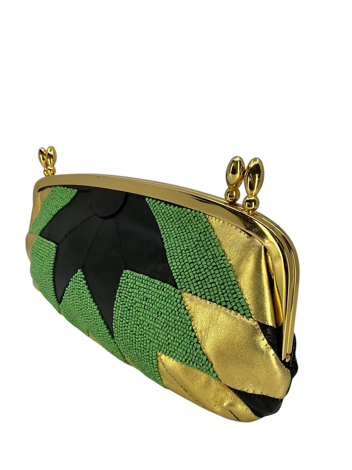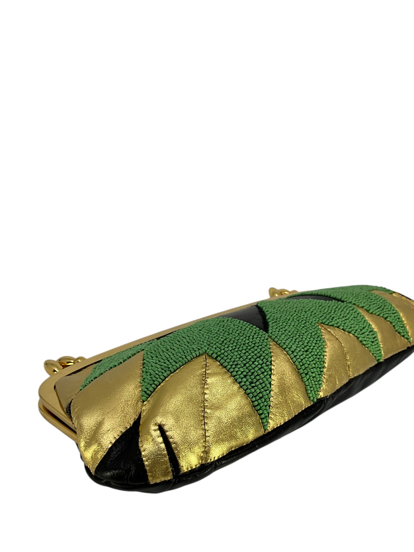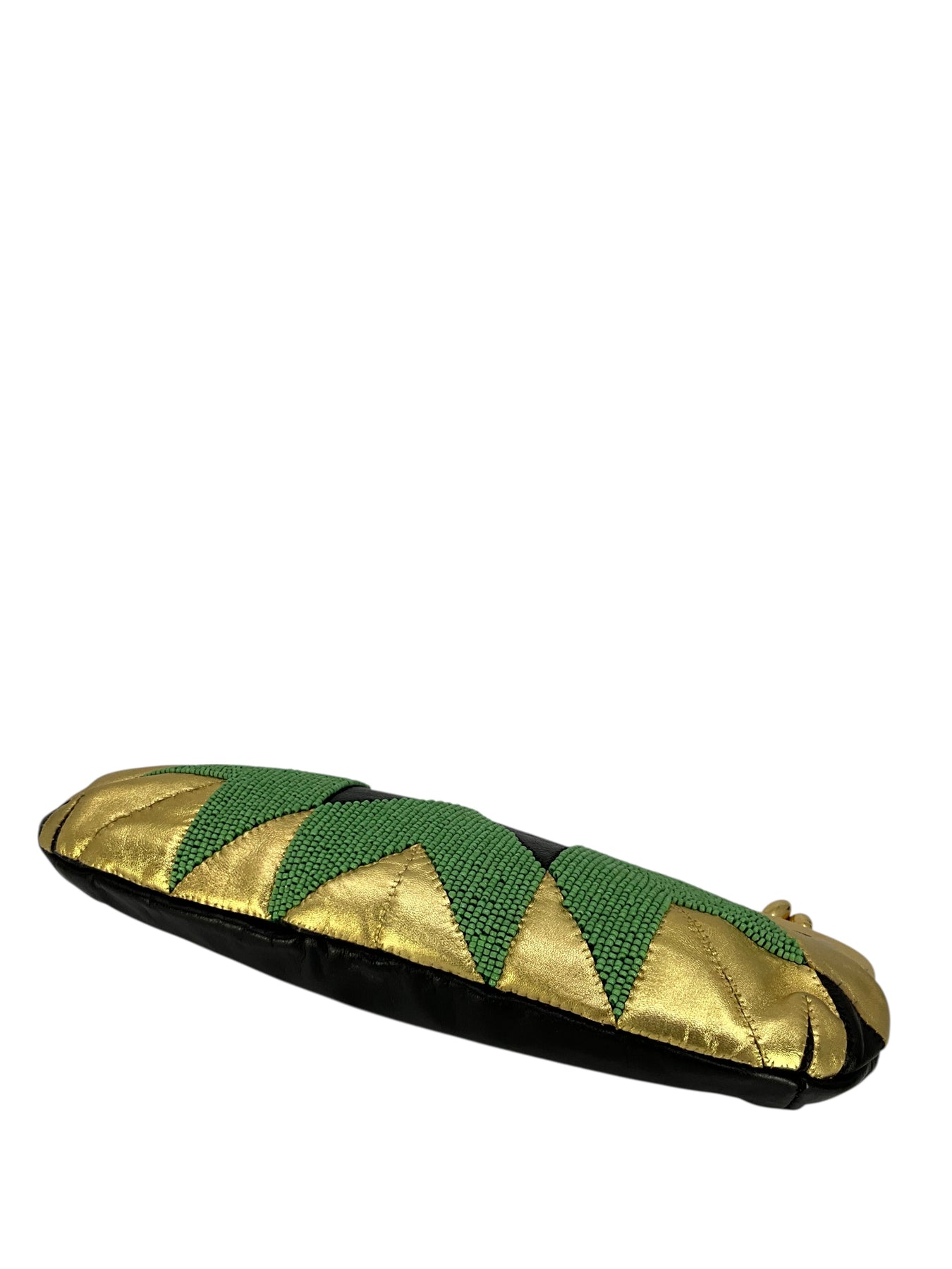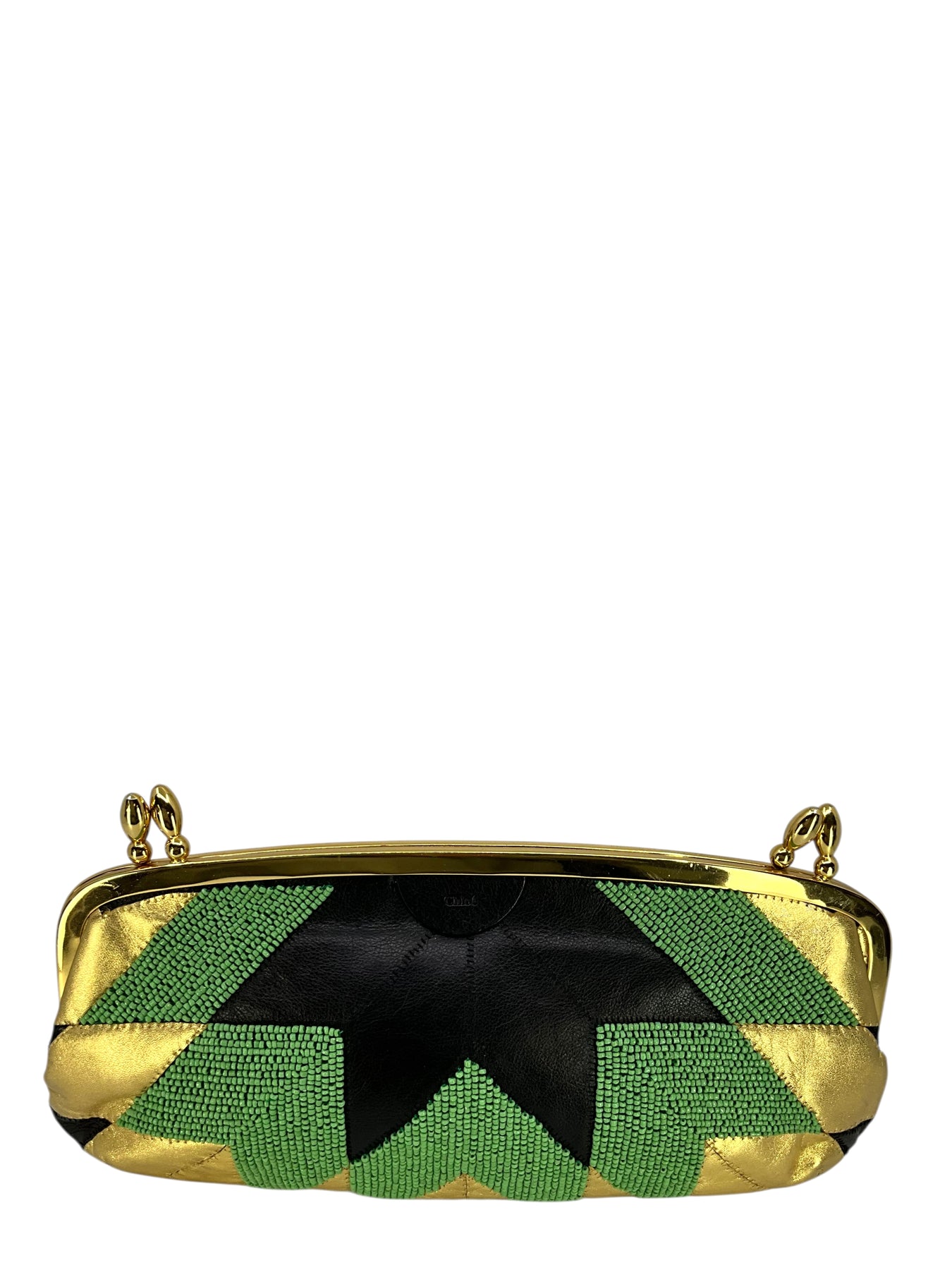 We guarantee the authenticity of this must-have Chloe Vintage Beaded Leather Clutch crafted from supple gold and black leather with green bead accents and a gold-tone metal frame.
