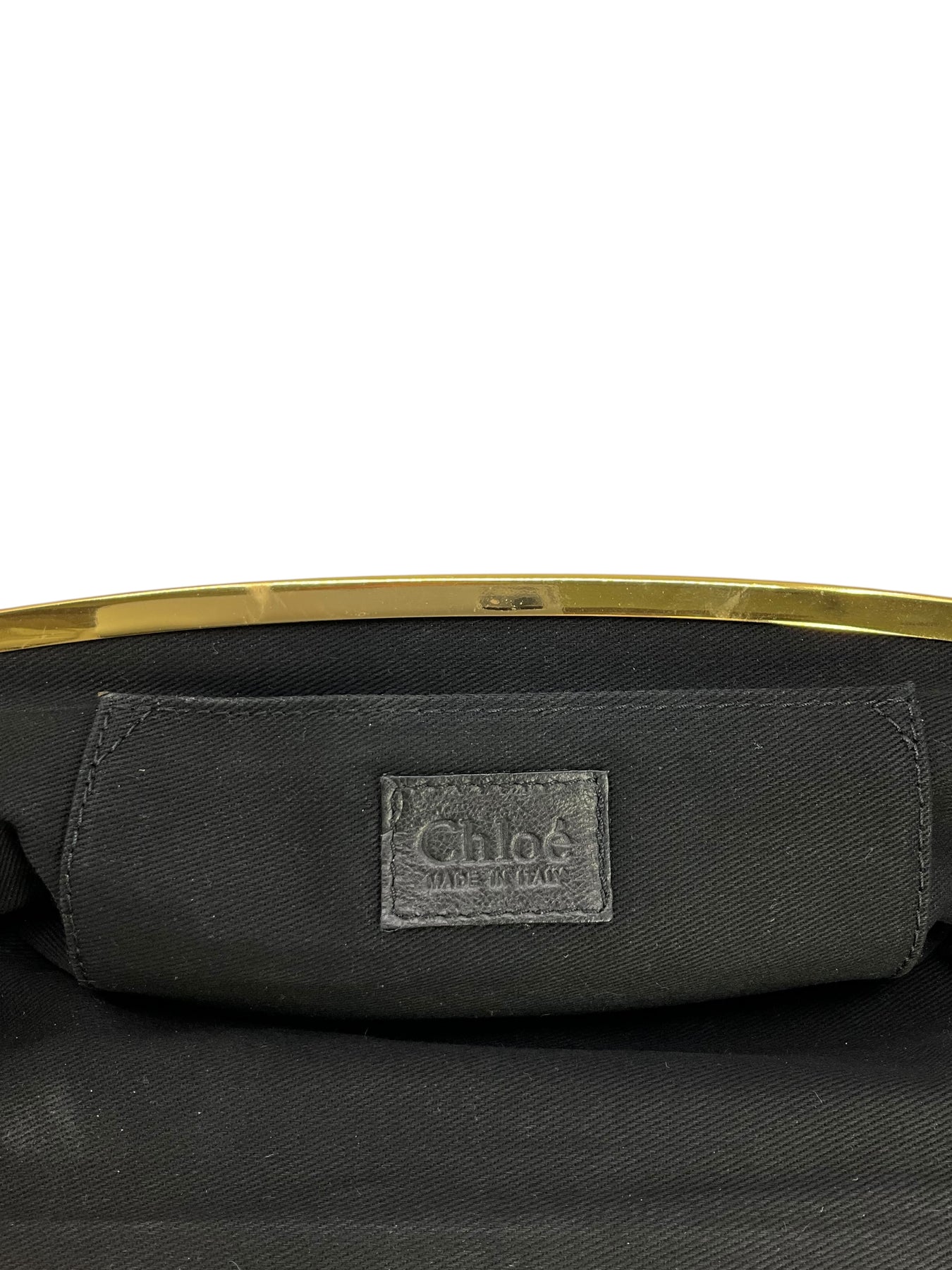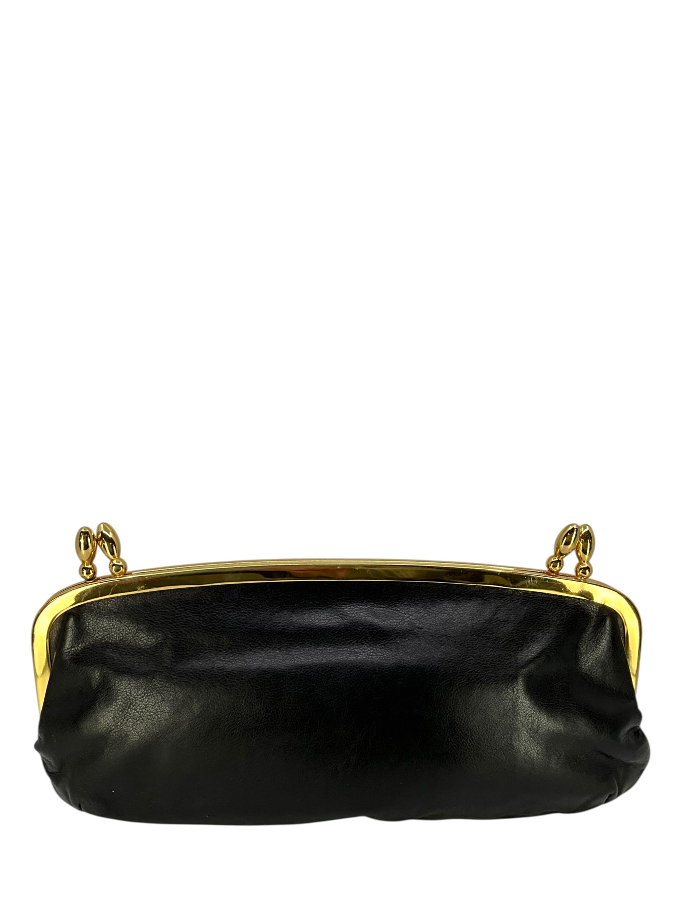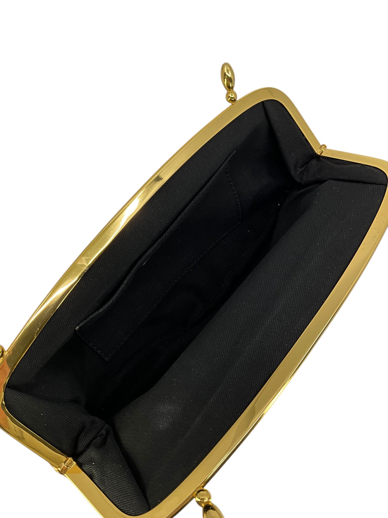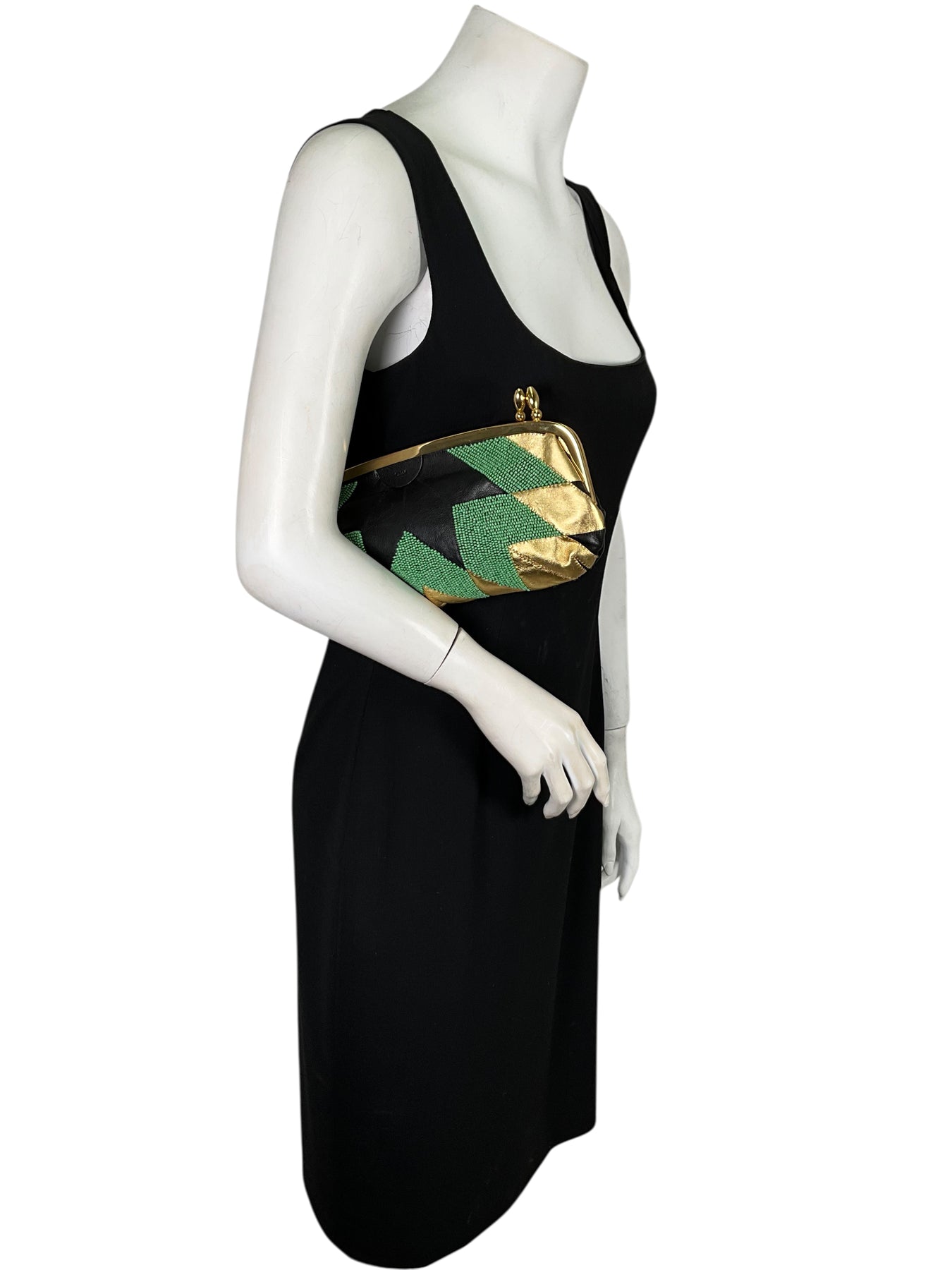 We guarantee the authenticity of this must-have Chloe Vintage Beaded Leather Clutch crafted from supple gold and black leather with green bead accents and a gold-tone metal frame.