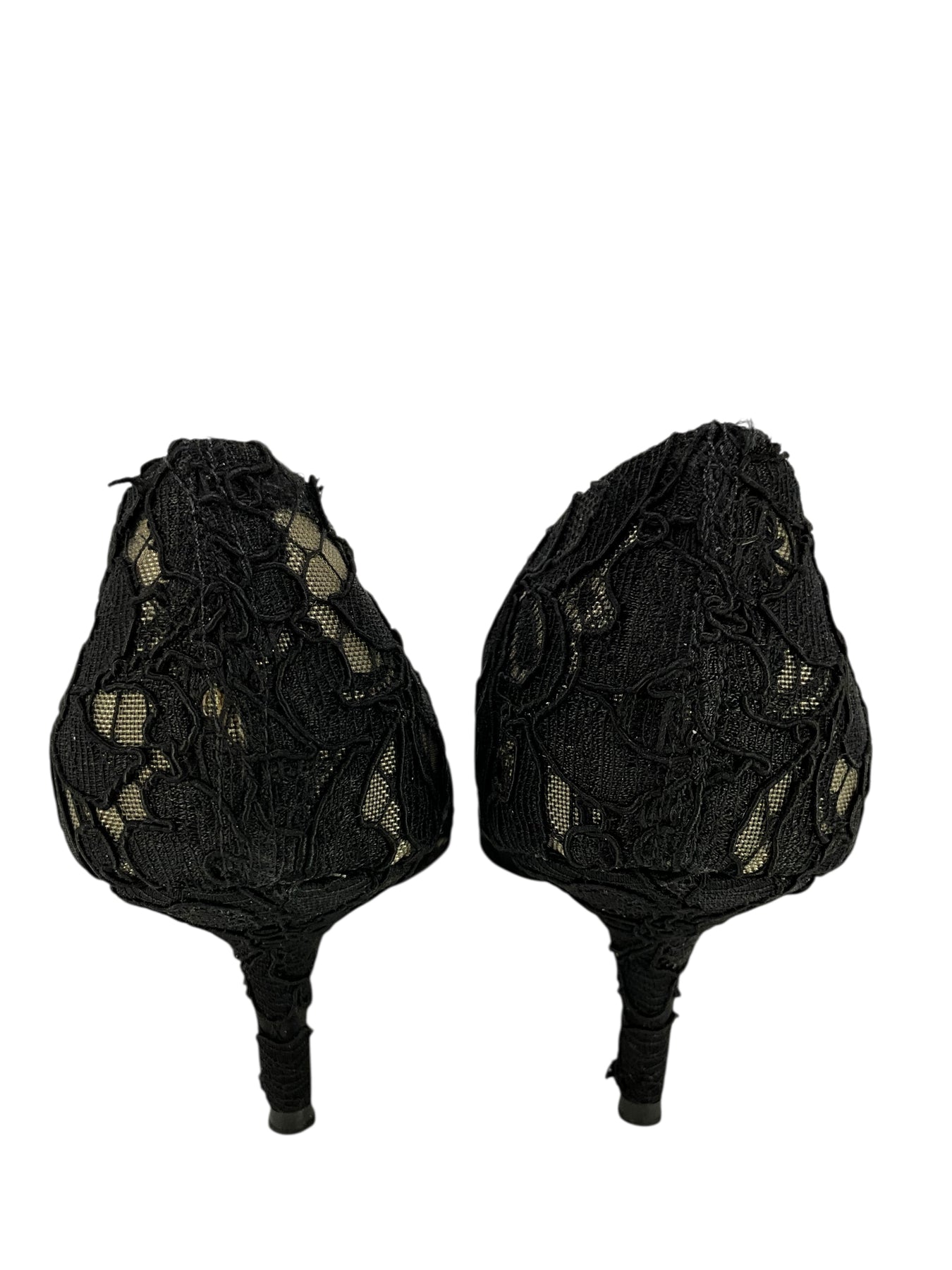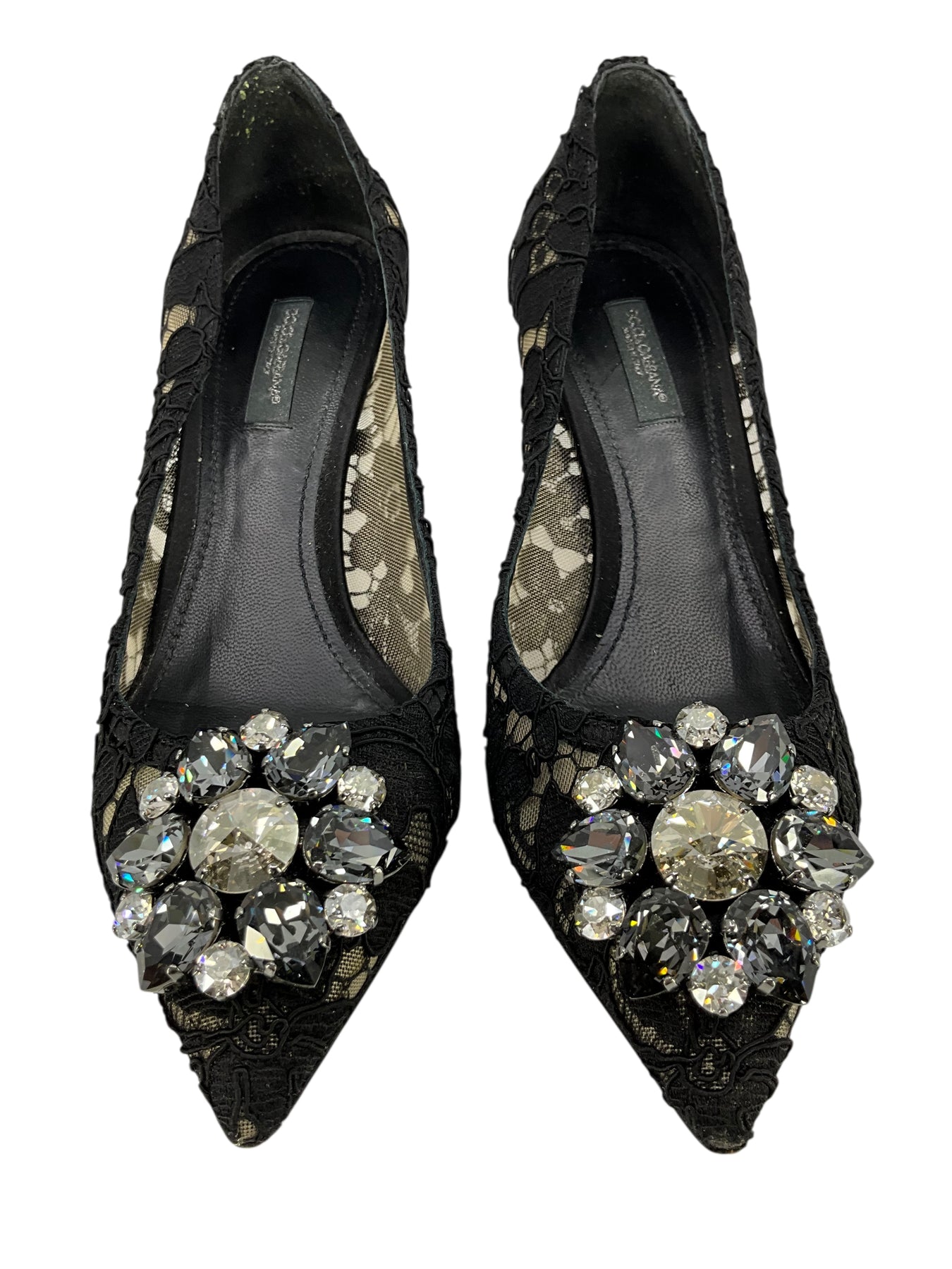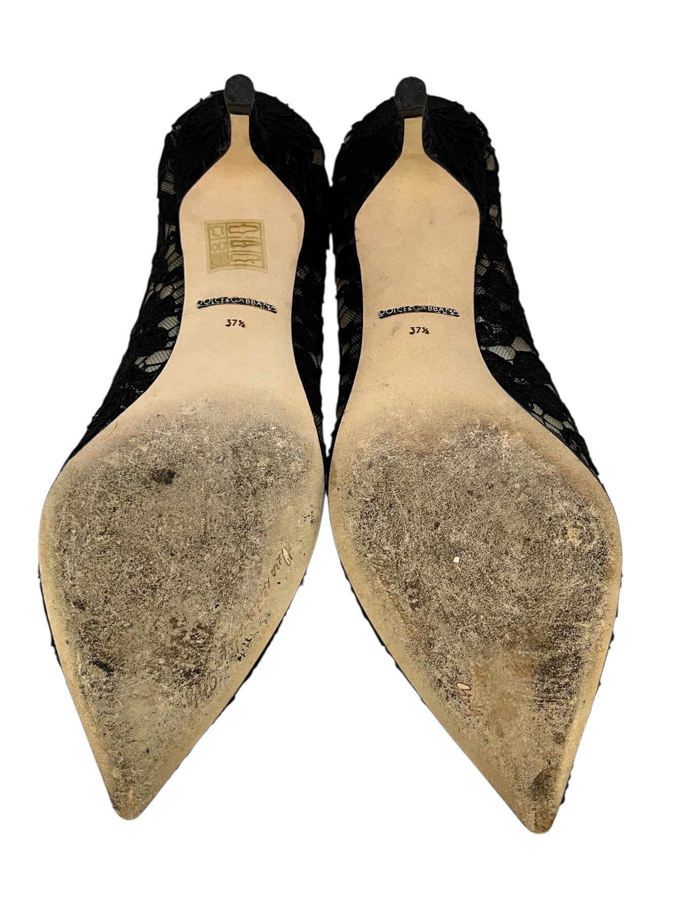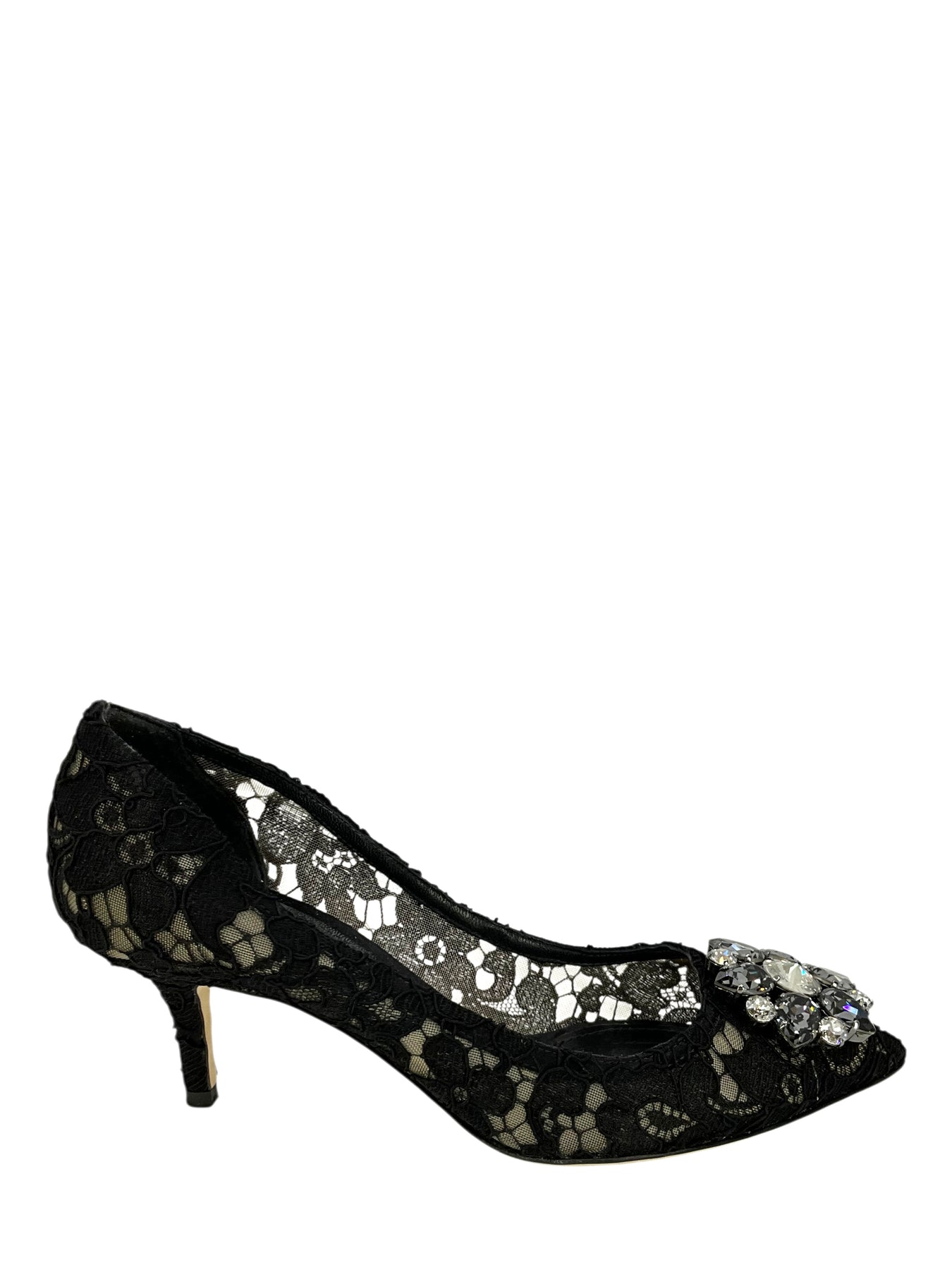 Add to your collection these classic, guaranteed authentic Dolce and Gabbana Lace Crystal Embellished Pumps Size 7.5 crafted from beautiful black lace fabric with a pointed toe. Featuring a crystal-embellishment on the vamp, a self-covered heel and black leather insoles.