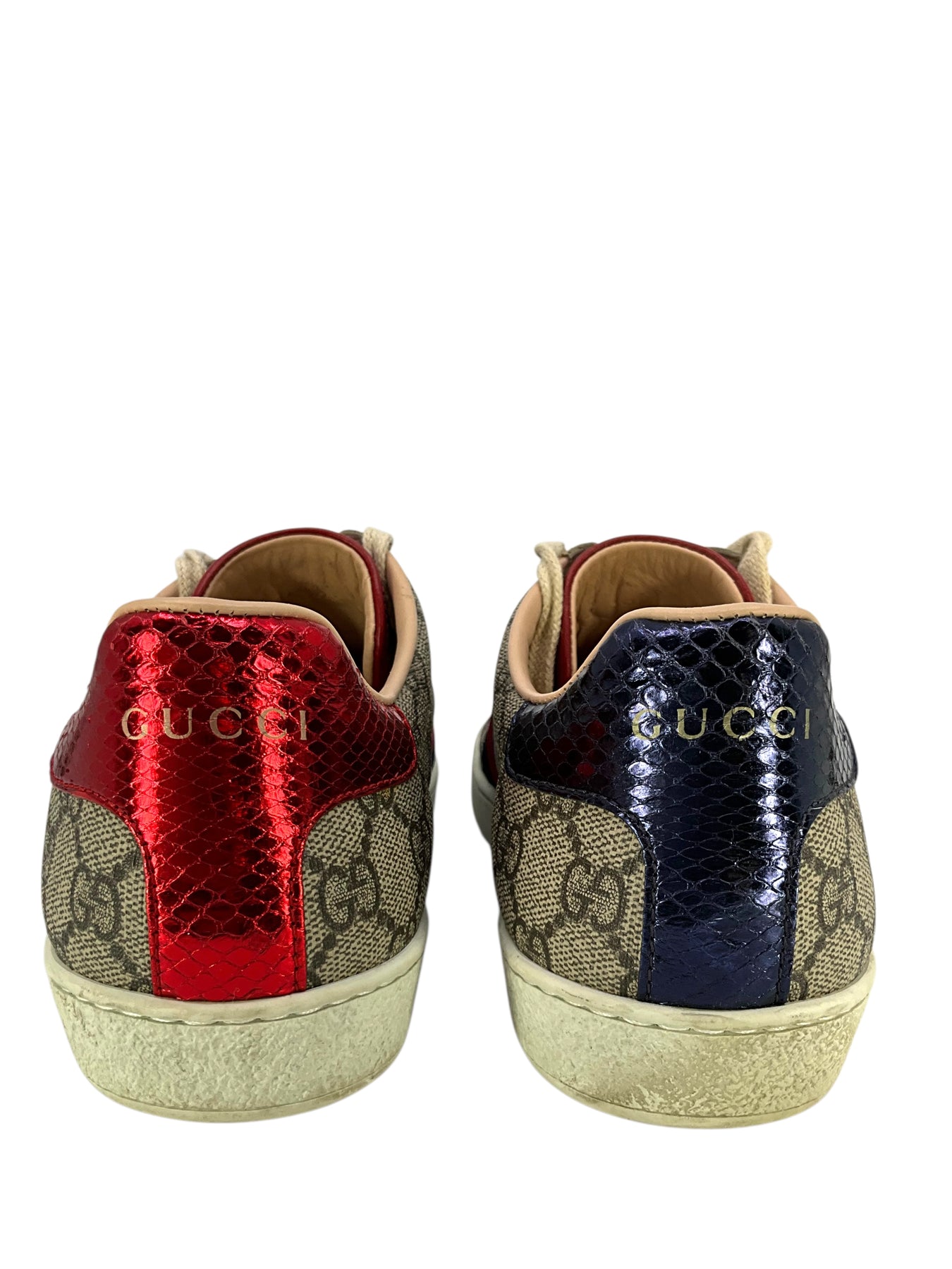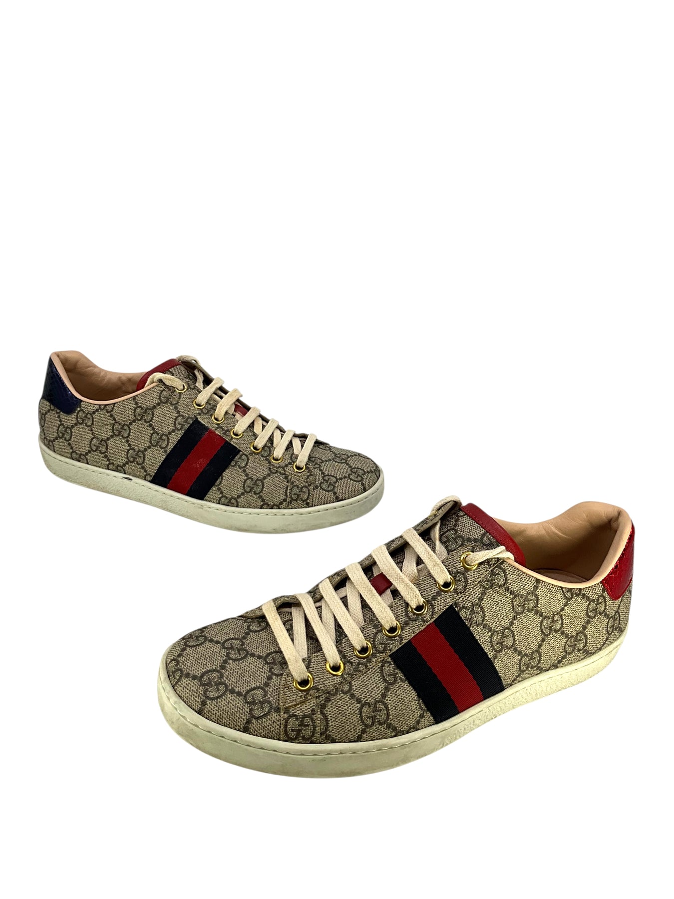This is an authentic pair of Gucci Ace GG Supreme Canvas Web Low Top Sneaker Size 9. Featuring signature red and blue web detail, cotton laces at the vamps and red/blue python heel counters.