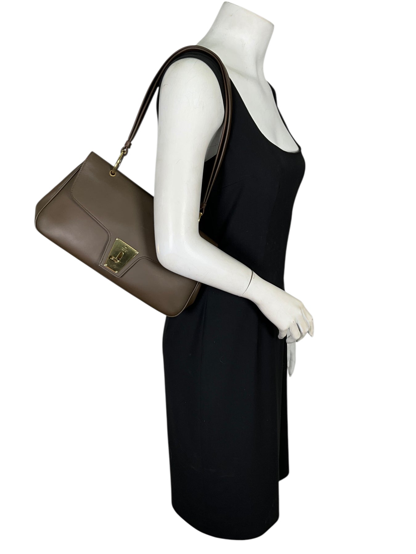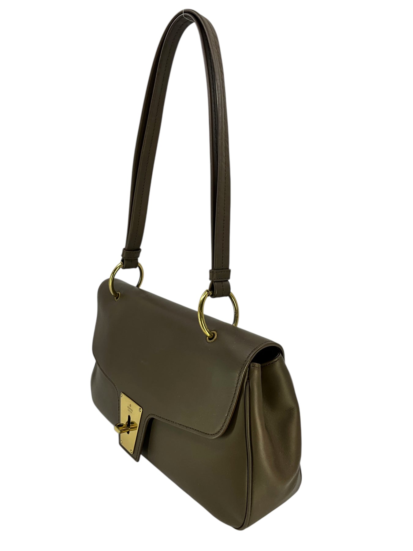 We guarantee the authenticity of this Gucci Vintage Leather Flap Shoulder Bag crafted from supple brown leather and gold-tone hardware. This versatile bag features a leather shoulder strap and a front flap with a twist-lock closure.