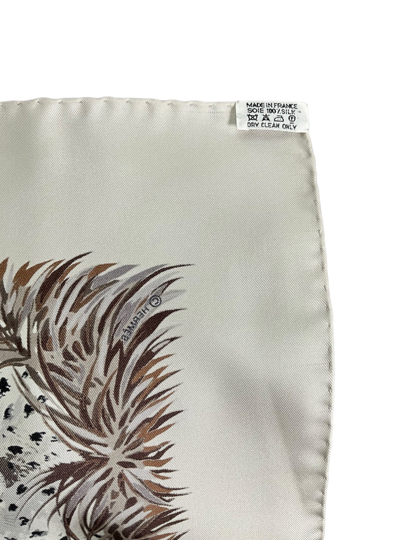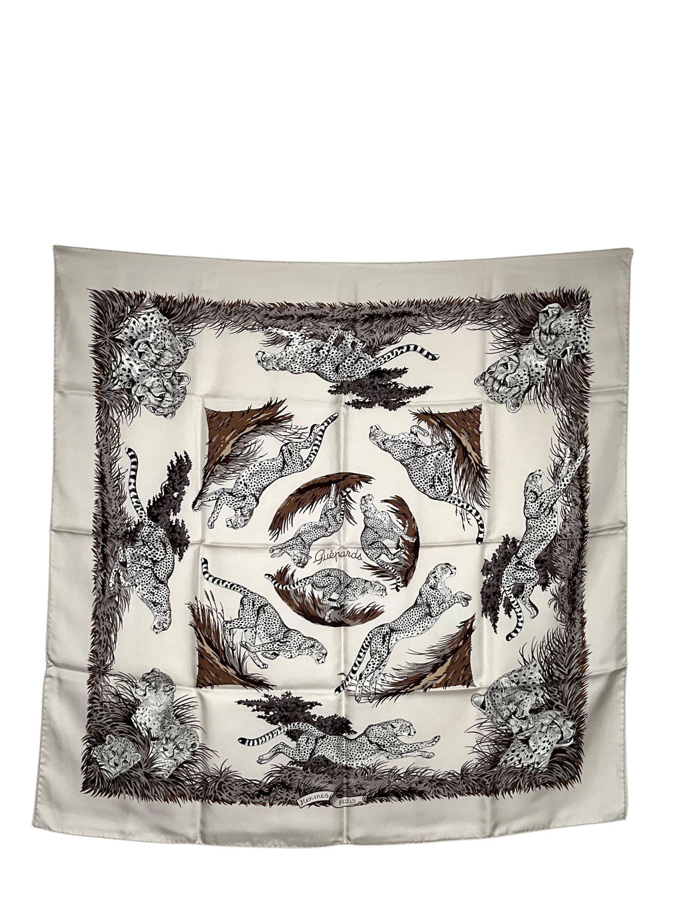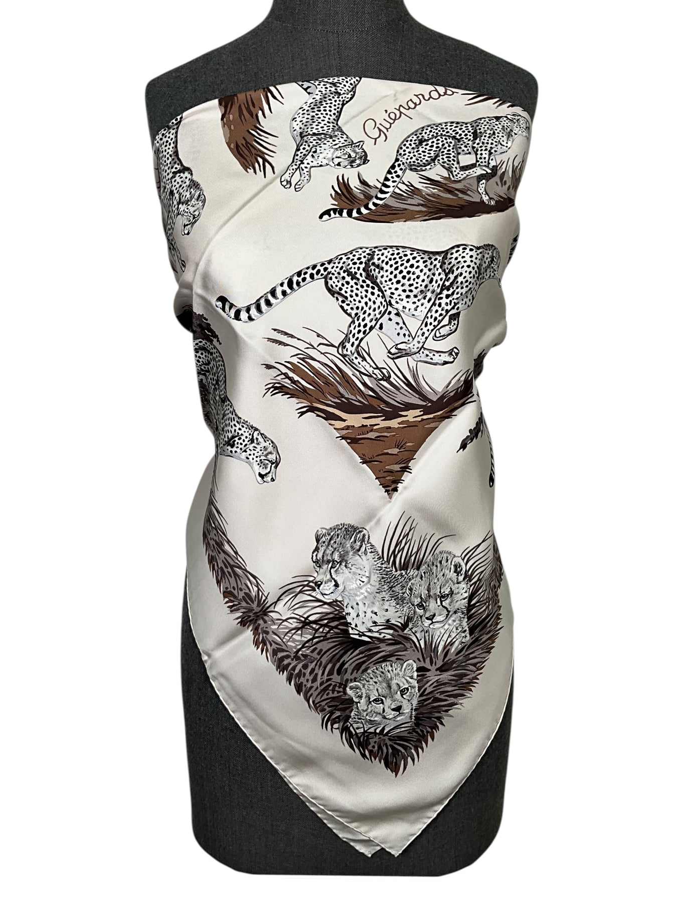 We guarantee the authenticity of this Hermes Guepards Silk Scarf 90 designed by Robert Dallet which was first issued back in 2007 and depicts images of cheetahs in action. It features beautiful hues of light gray and brown with hand-rolled edges.