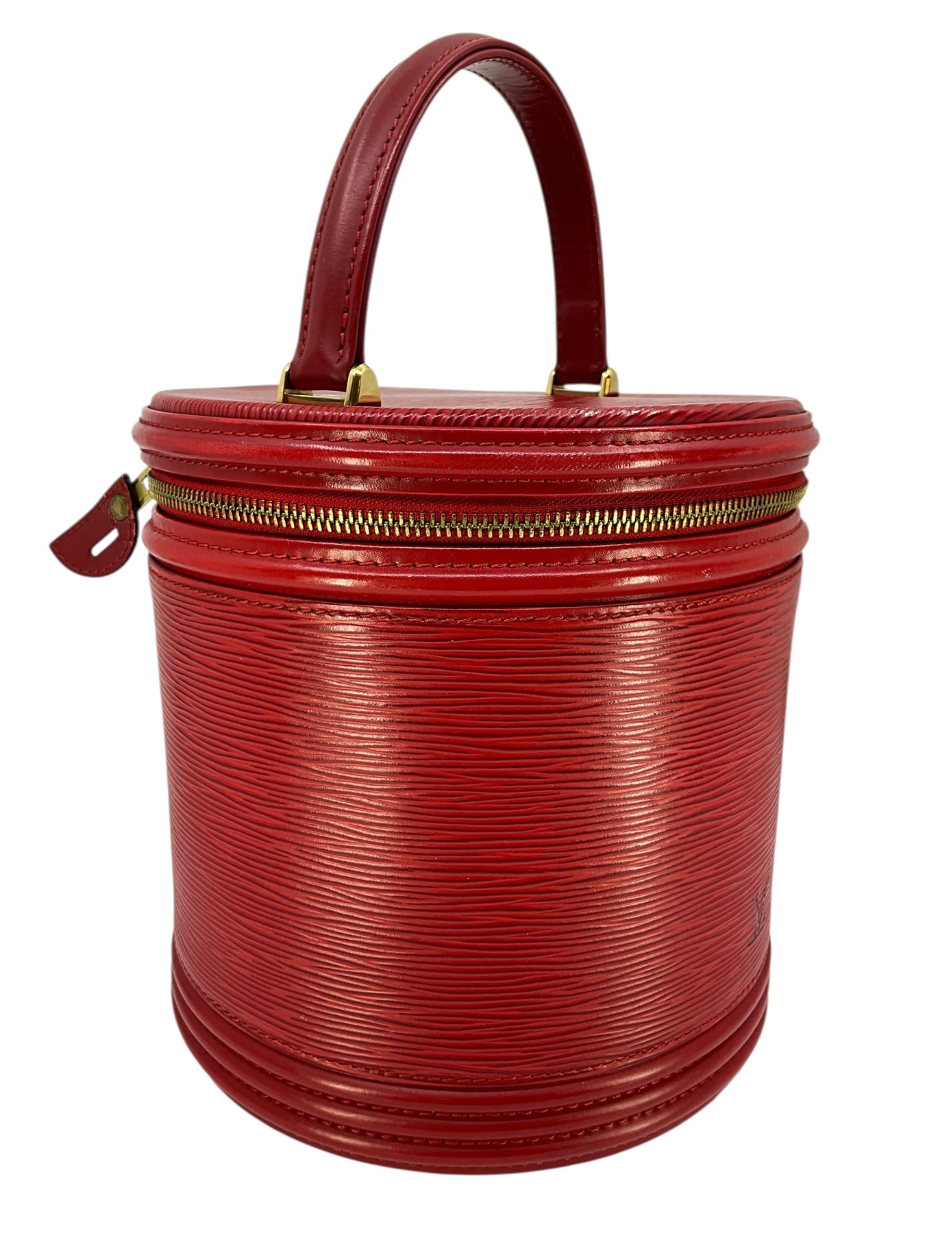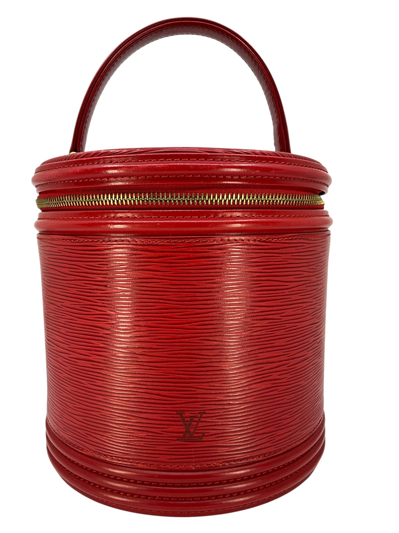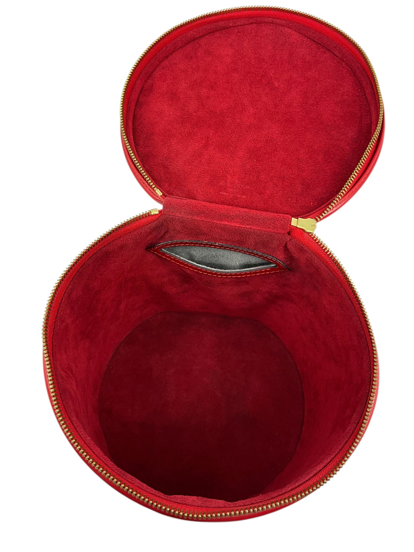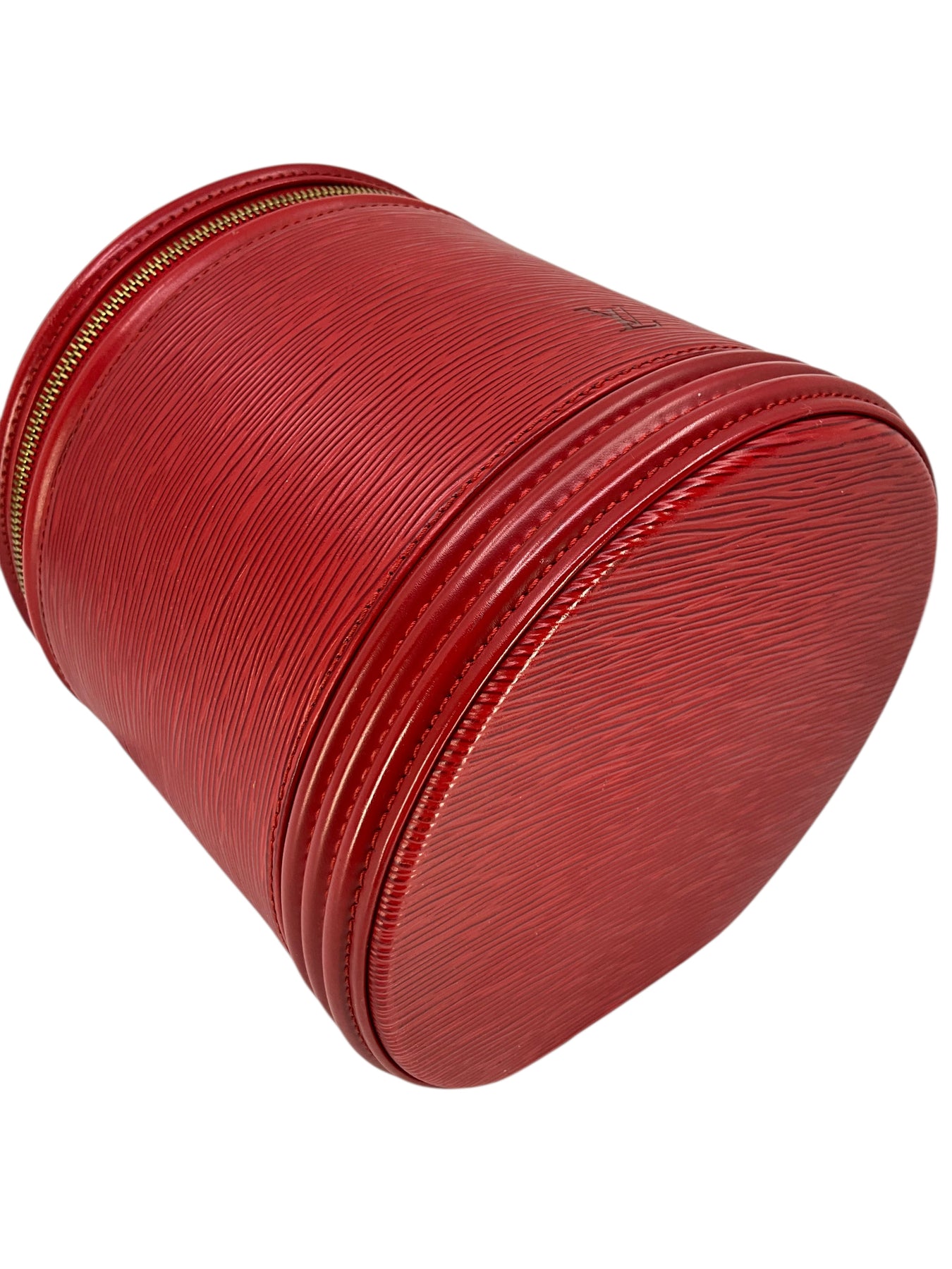 We guarantee the authenticity of this unique, discontinued Louis Vuitton Epi Cannes Cosmetic Case Vanity Bag crafted from Louis Vuitton's red signature textured epi leather. Featuring a single rolled top handle, an embossed LV logo at front and a zip-around closure that opens to a smooth red Alcantara fabric with a single slot pocket.