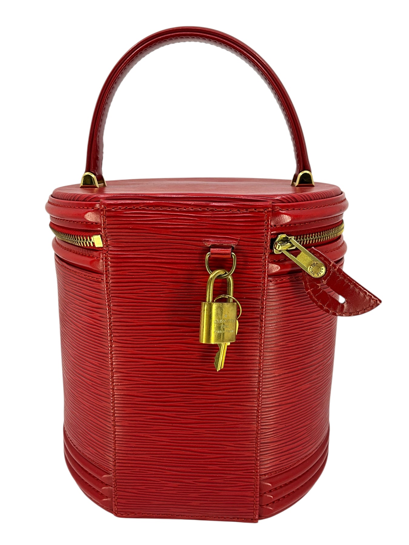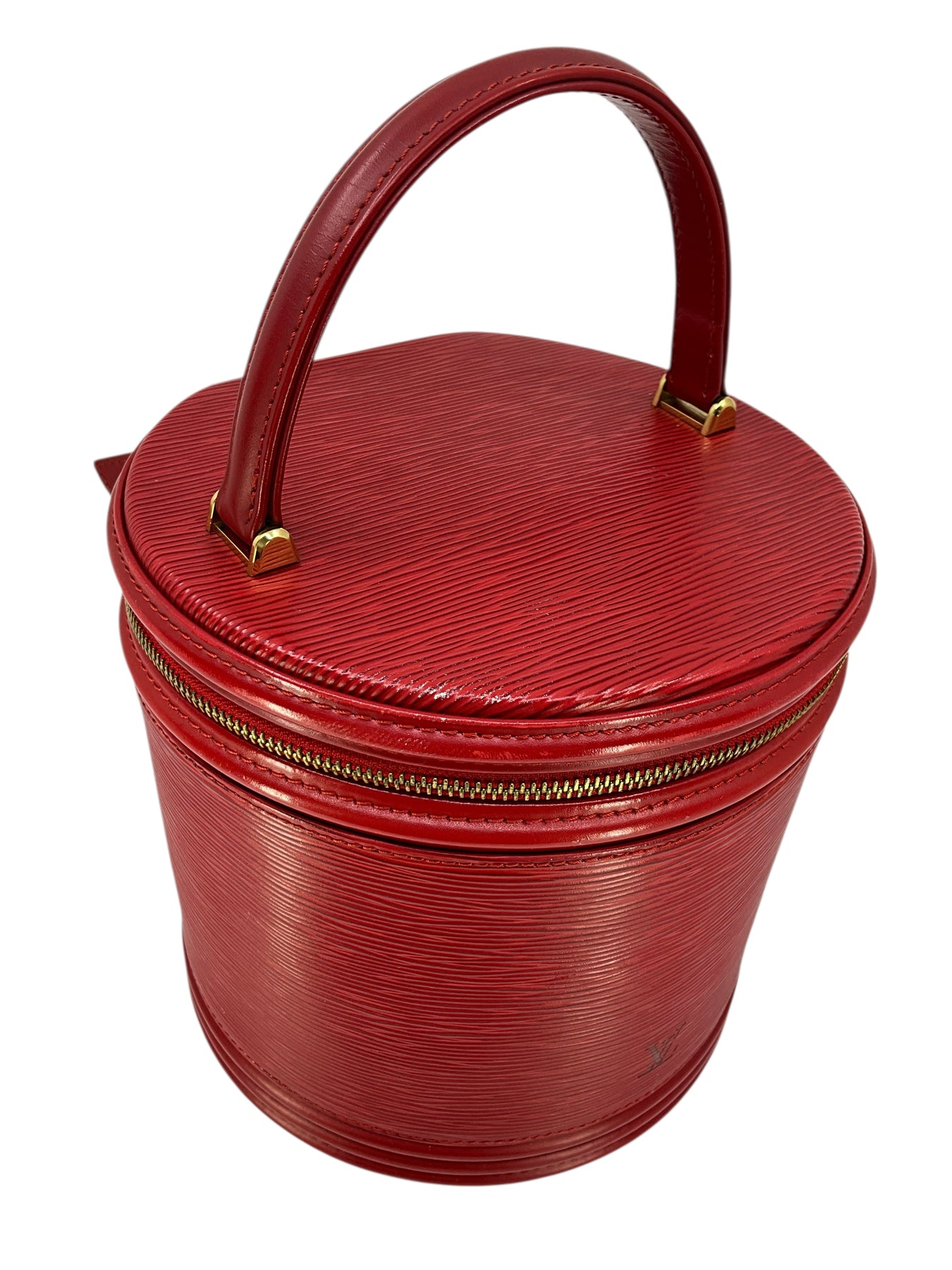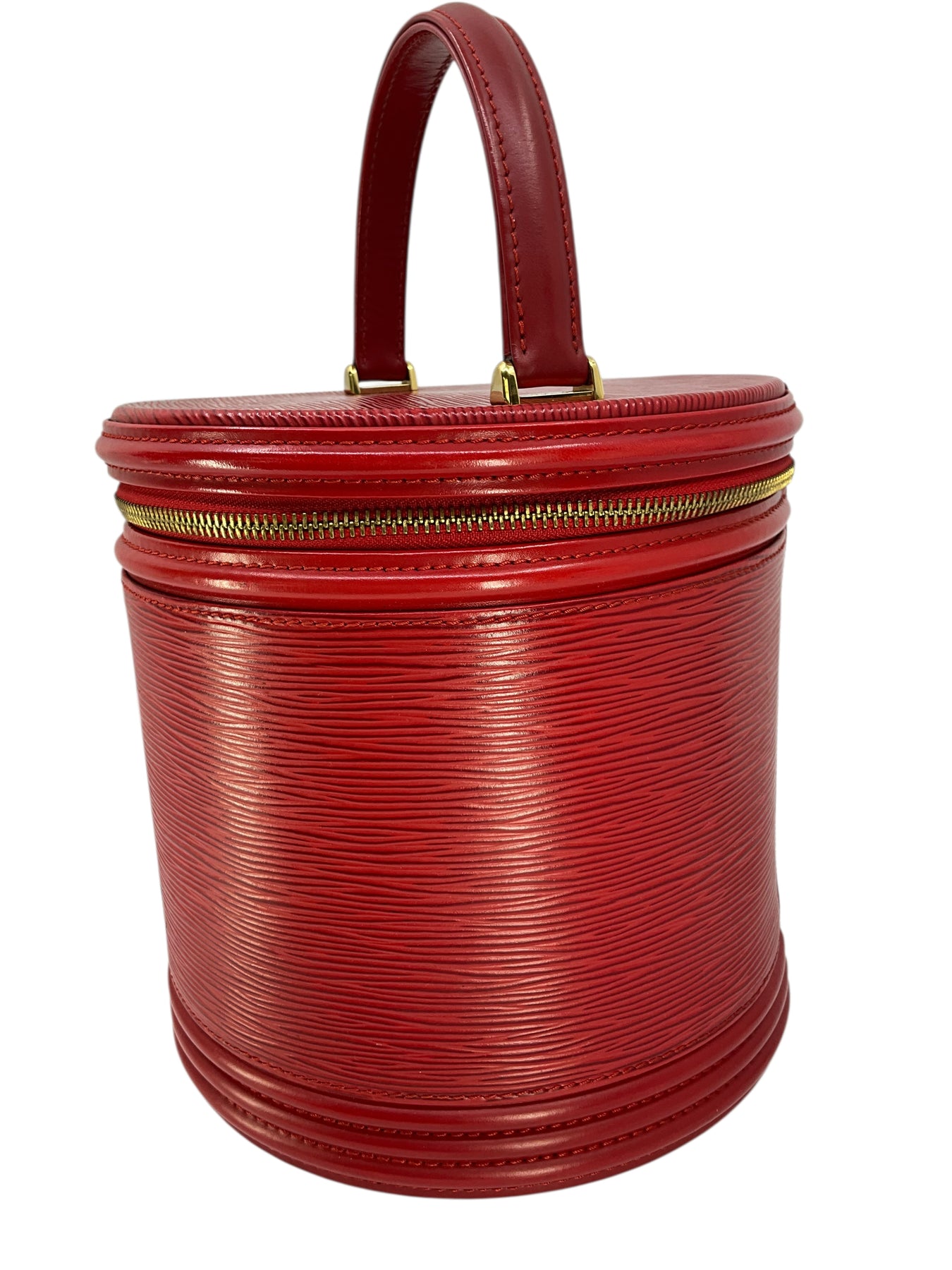 We guarantee the authenticity of this unique, discontinued Louis Vuitton Epi Cannes Cosmetic Case Vanity Bag crafted from Louis Vuitton's red signature textured epi leather. Featuring a single rolled top handle, an embossed LV logo at front and a zip-around closure that opens to a smooth red Alcantara fabric with a single slot pocket.