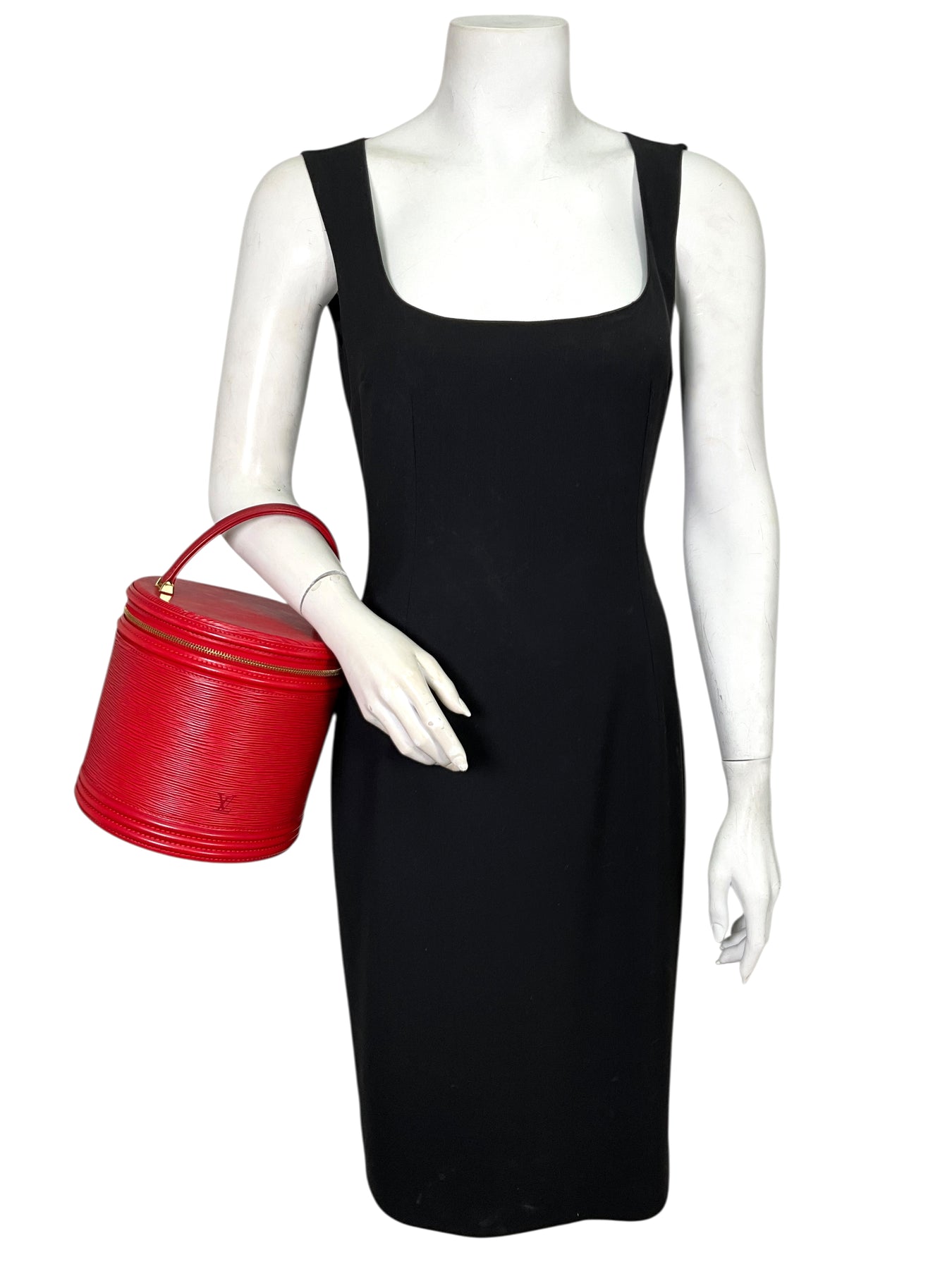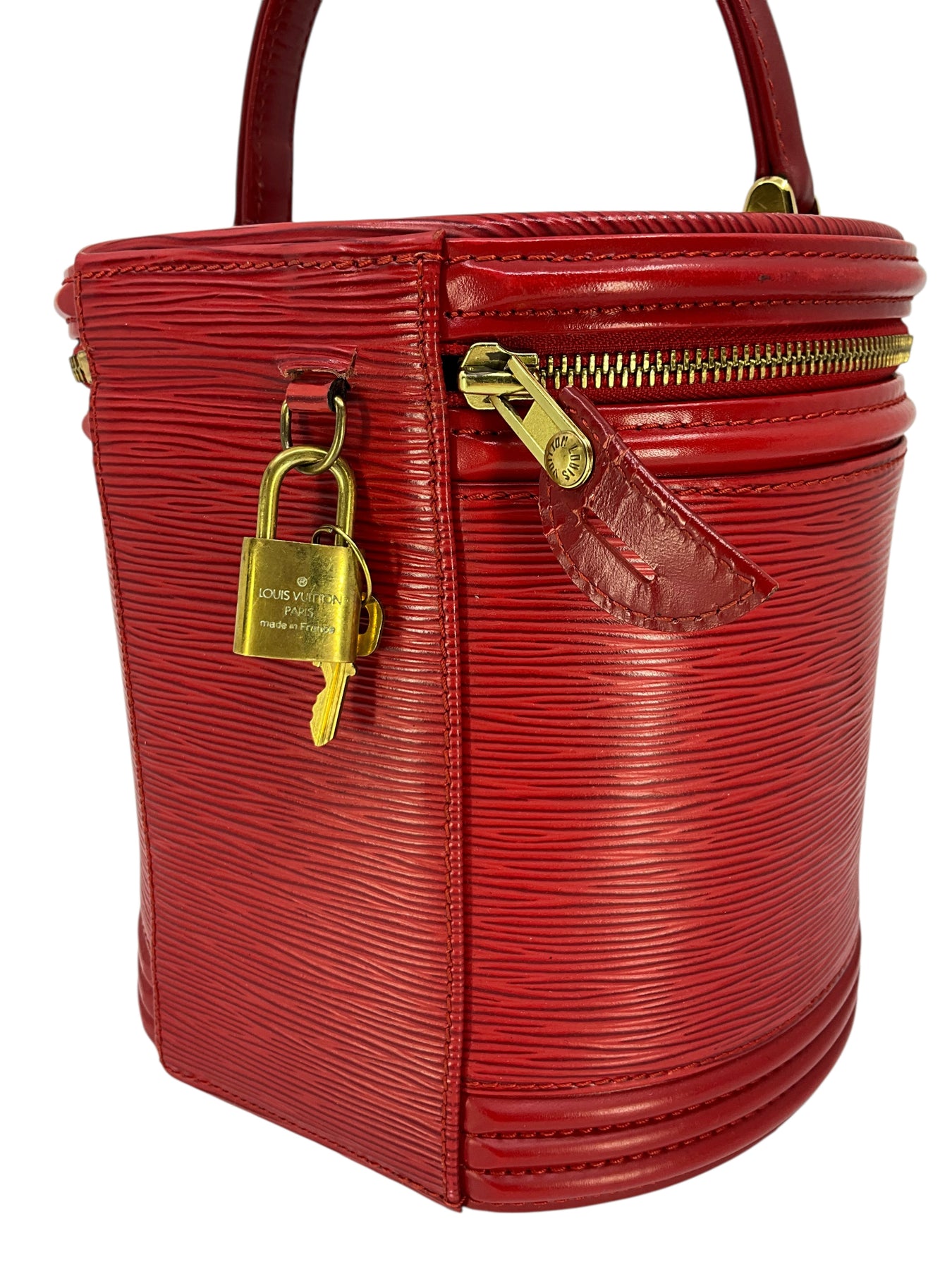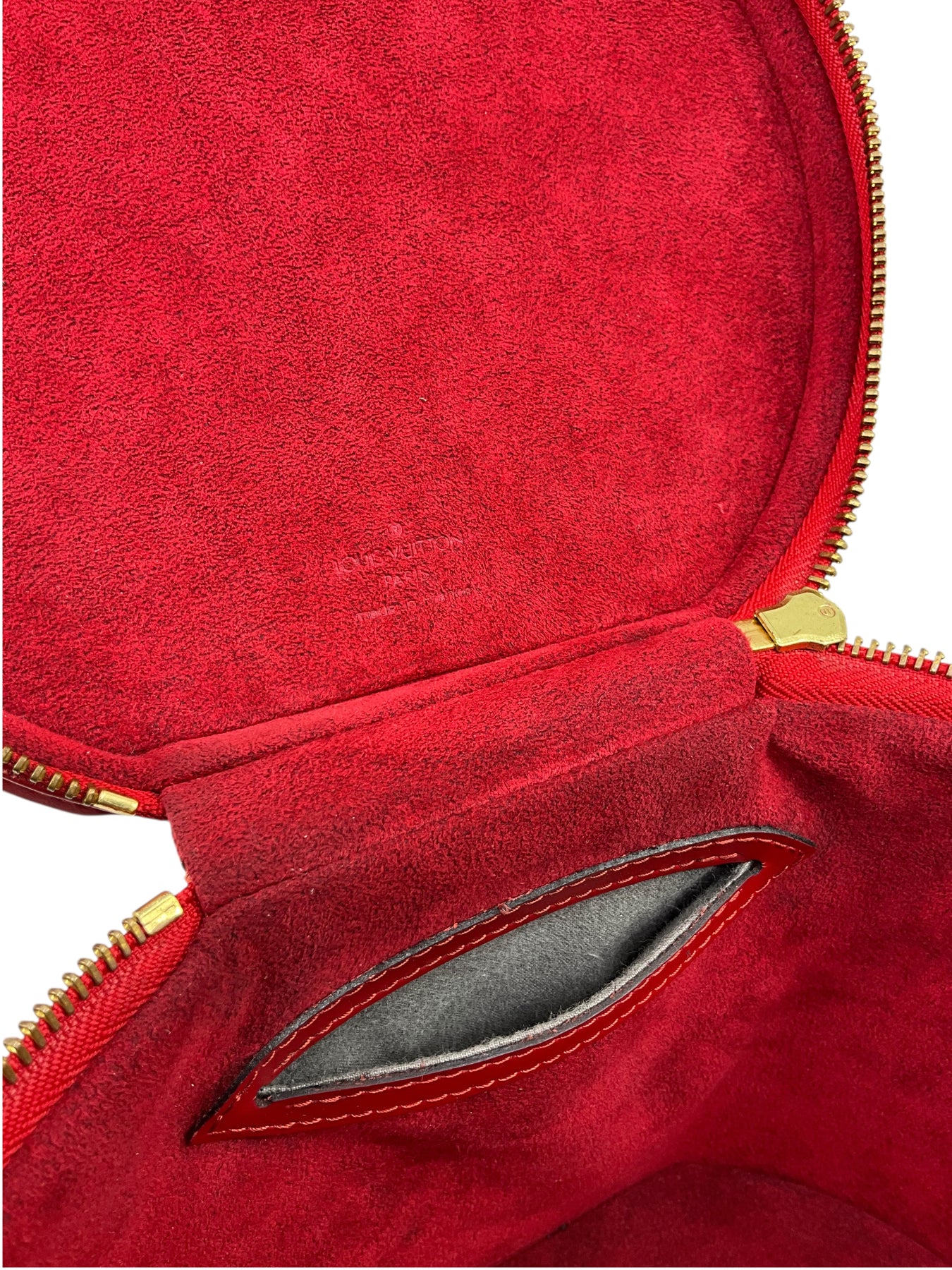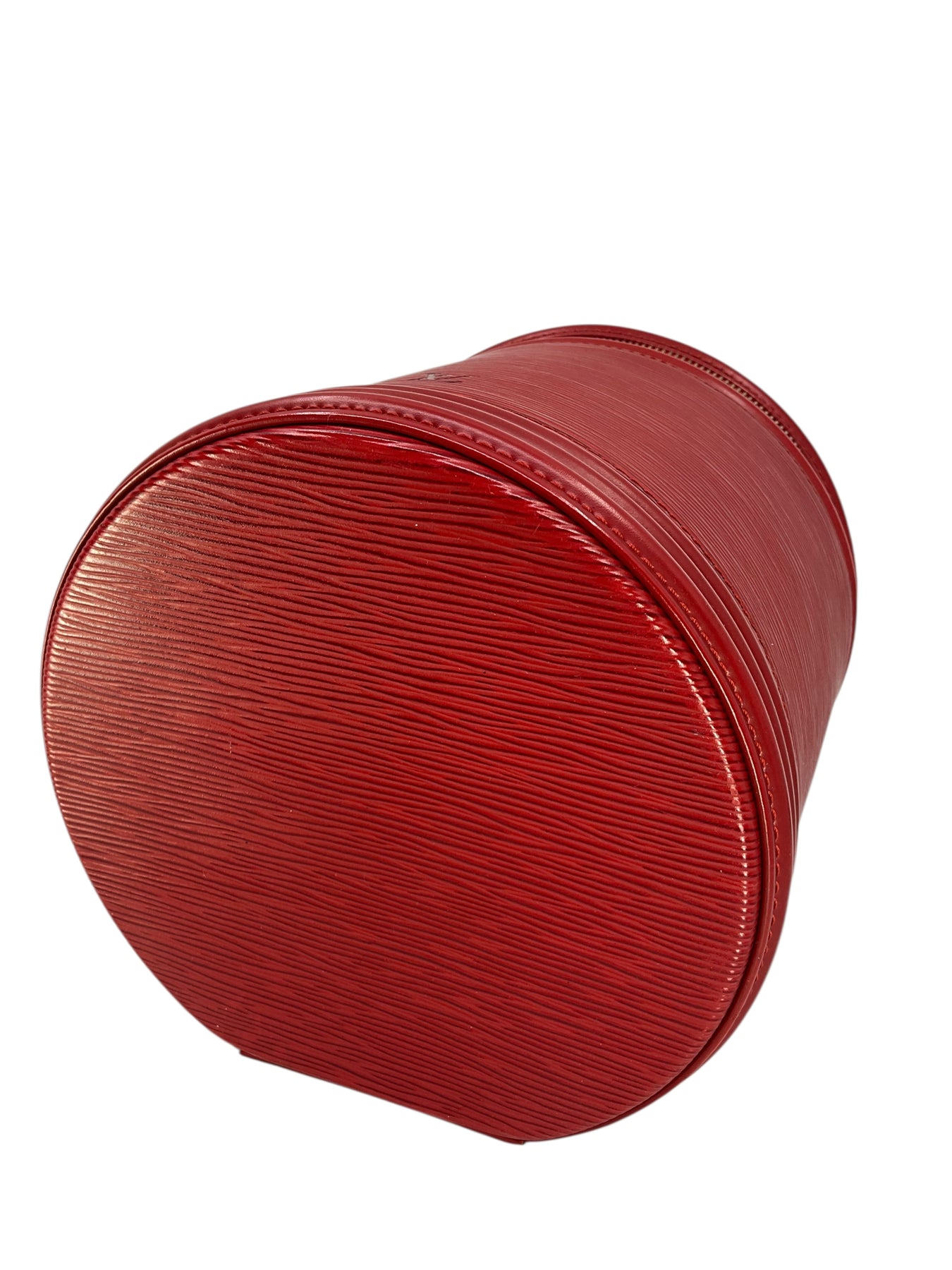 We guarantee the authenticity of this unique, discontinued Louis Vuitton Epi Cannes Cosmetic Case Vanity Bag crafted from Louis Vuitton's red signature textured epi leather. Featuring a single rolled top handle, an embossed LV logo at front and a zip-around closure that opens to a smooth red Alcantara fabric with a single slot pocket.