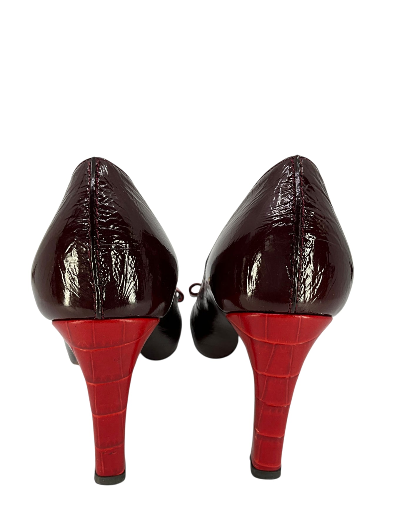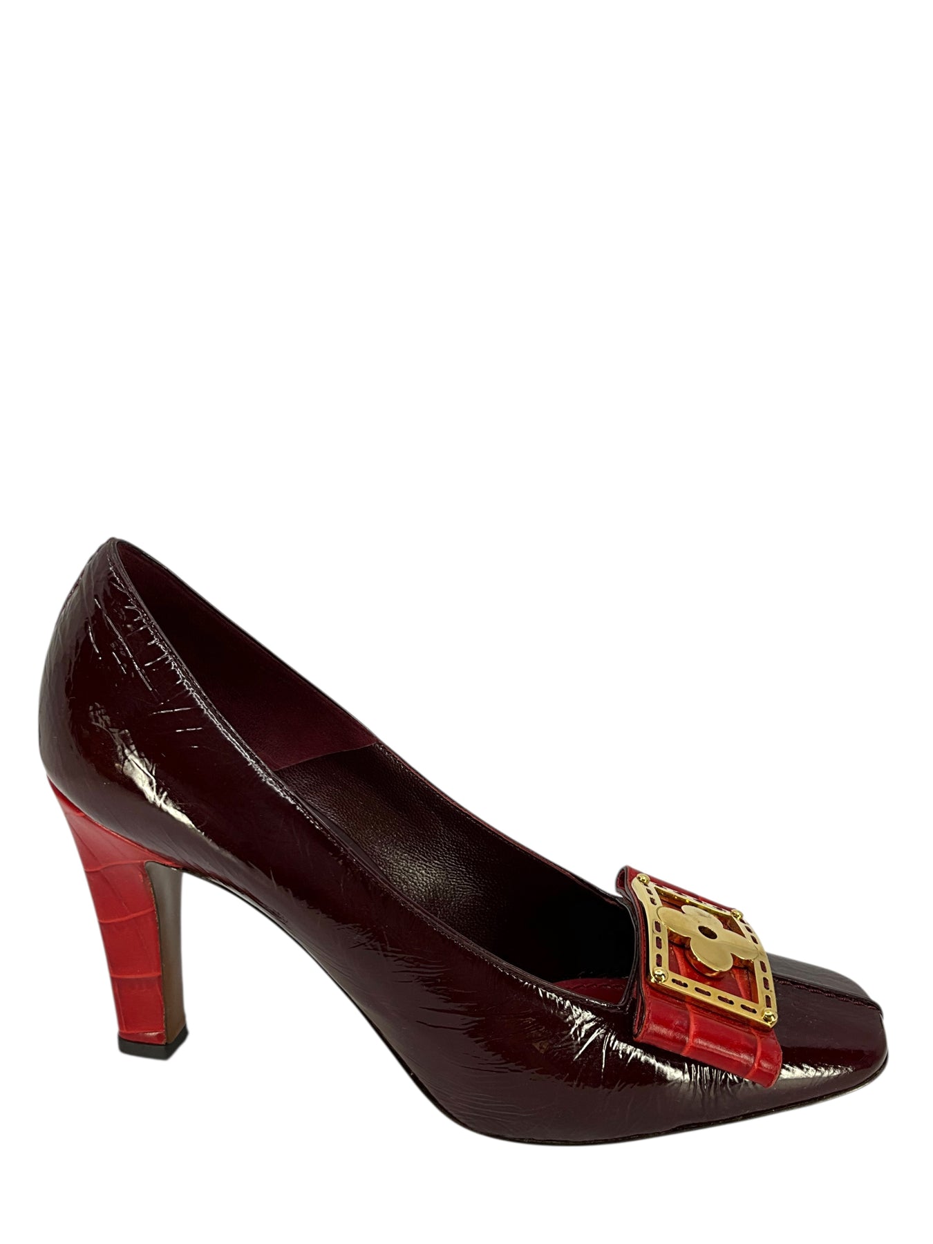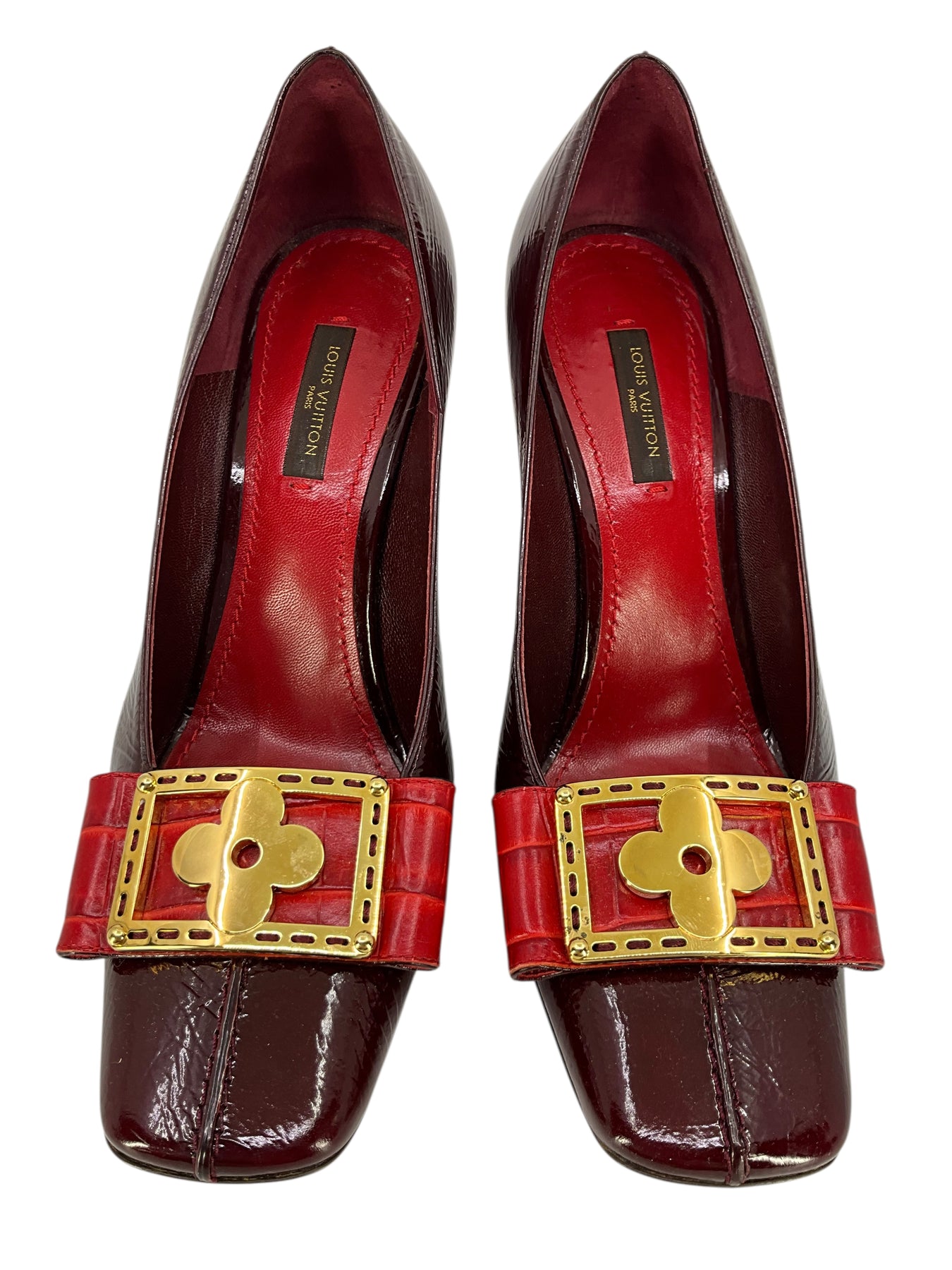 We guarantee the authenticity of these Louis Vuitton Patent Leather Fleur Pumps Size 7 in burgundy. Featuring a square toe, a gold-tone fleur accent on the vamp and red embossed heels.