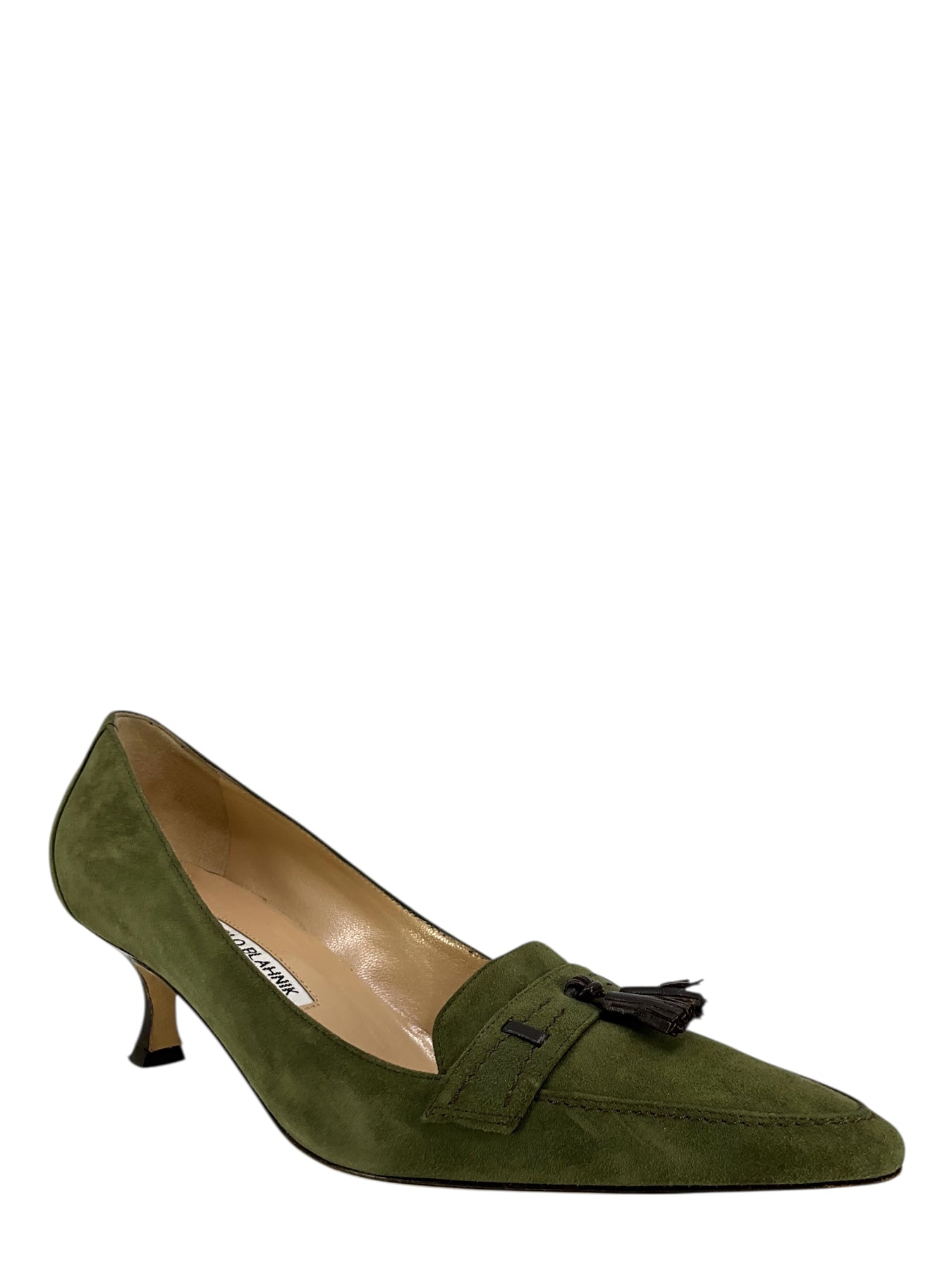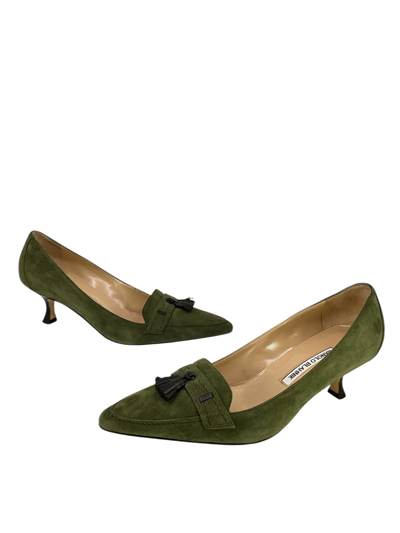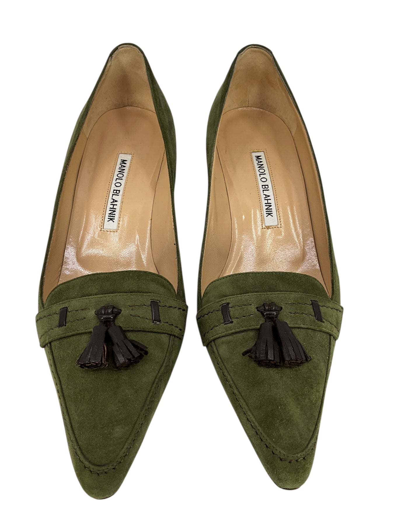 This is an authentic pair of classic Manolo Blahnik Suede Tassel Accent Pumps Size 7.5 crafted in smooth green suede with a fine-pointed toe. They feature a wooden kitten heel and brown leather tassels at the vamp.