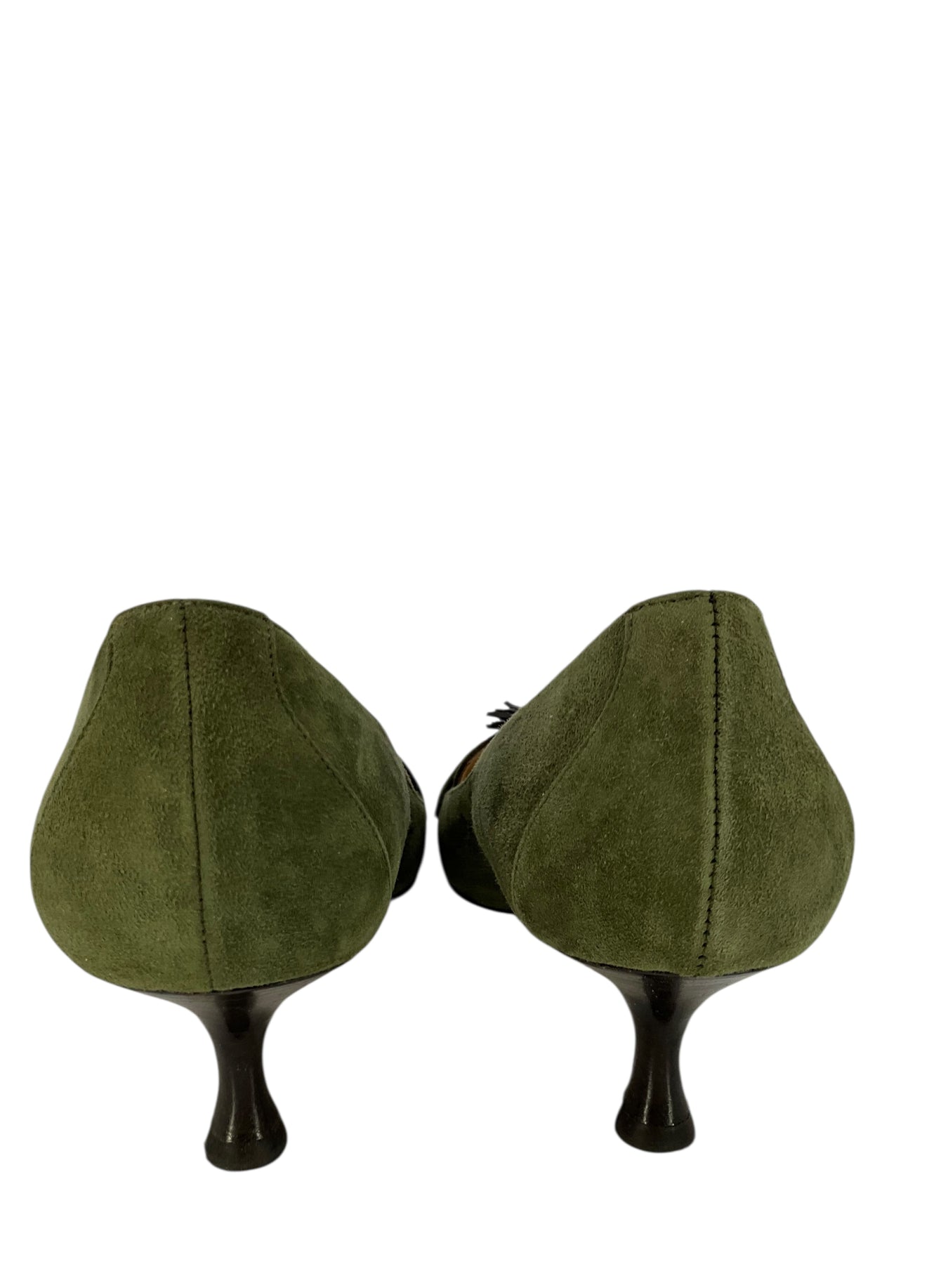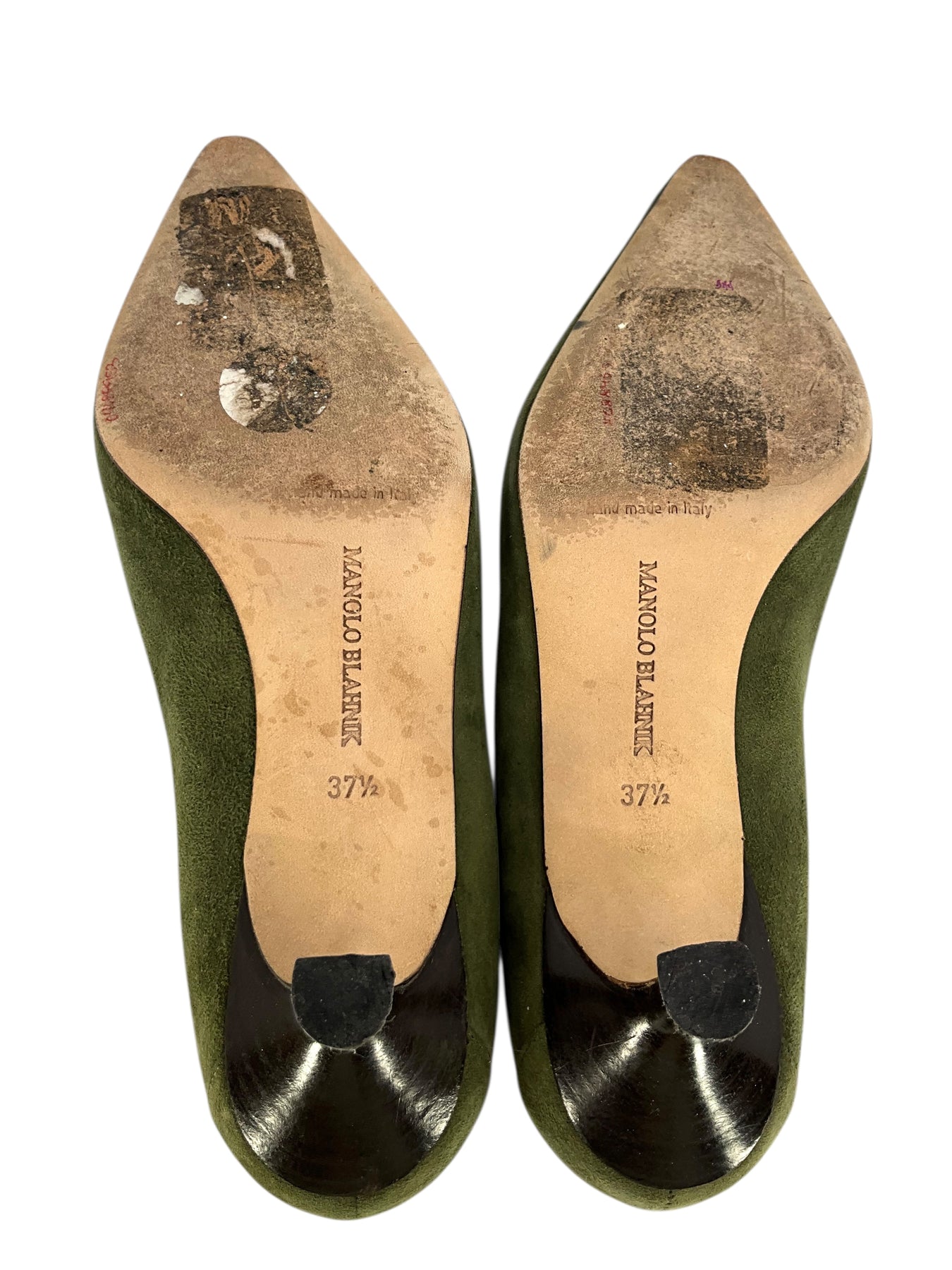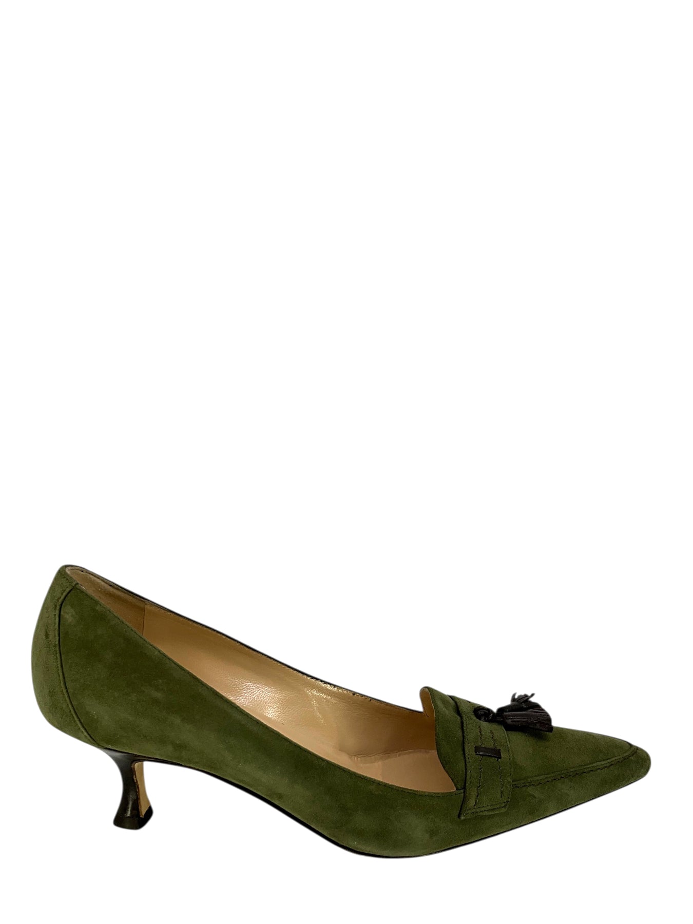 This is an authentic pair of classic Manolo Blahnik Suede Tassel Accent Pumps Size 7.5 crafted in smooth green suede with a fine-pointed toe. They feature a wooden kitten heel and brown leather tassels at the vamp.