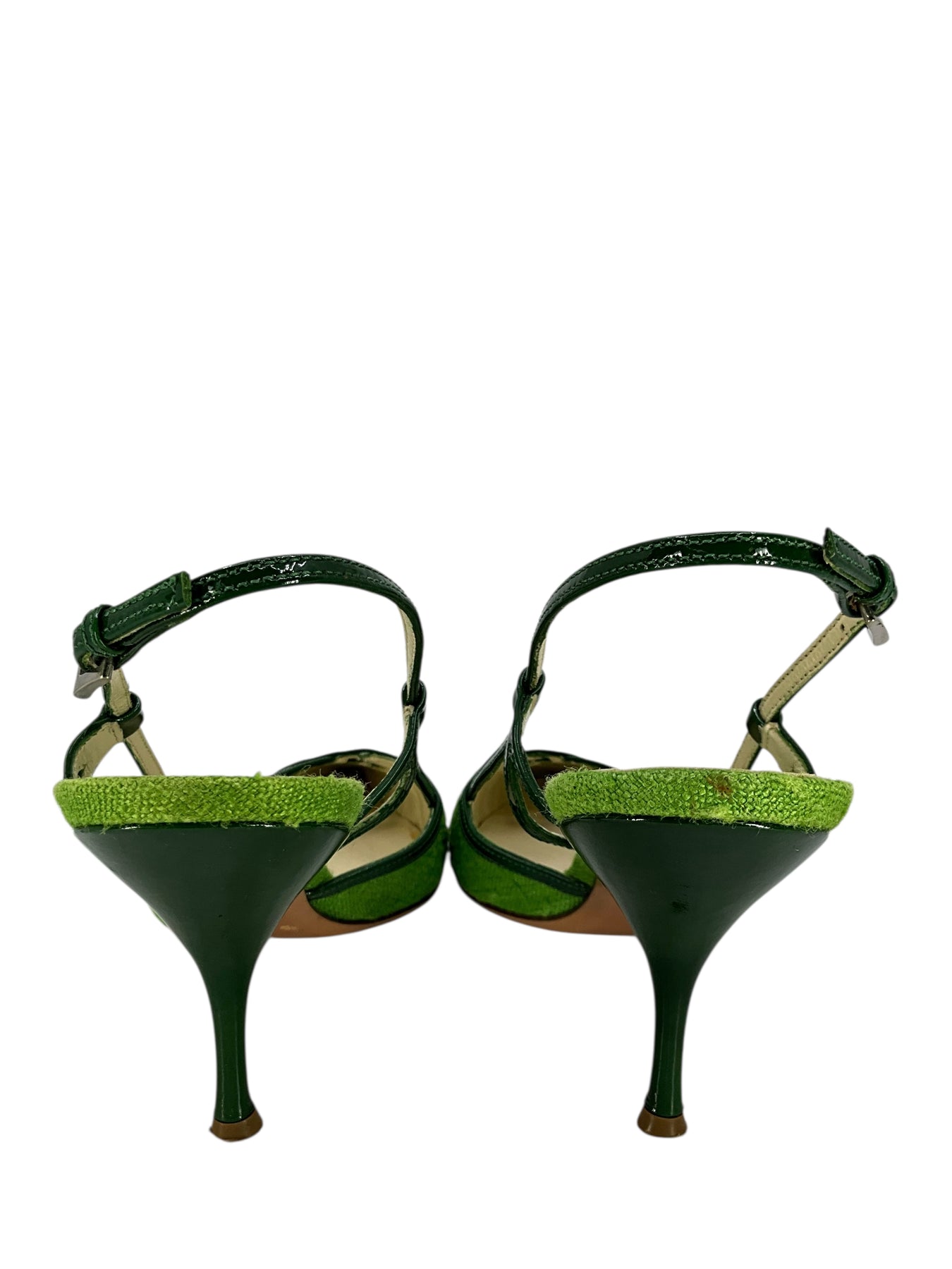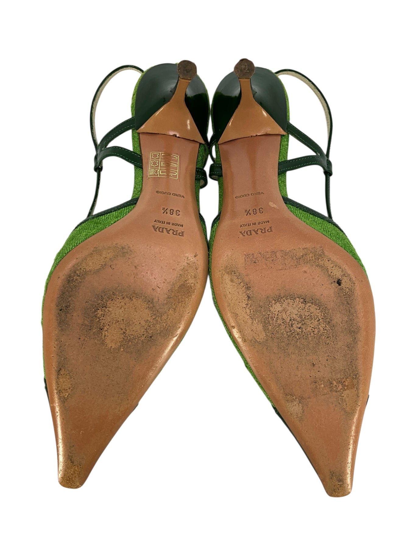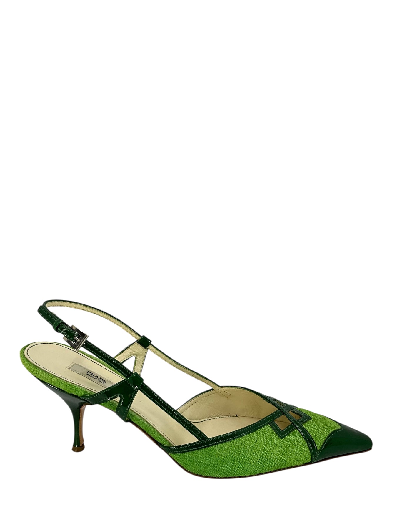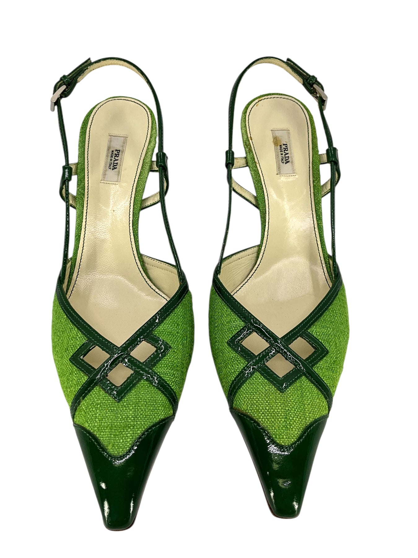 Add a touch of style to your wardrobe with these chic Prada Canvas and Patent Leather Slingbacks Size 8.5 crafted from green canvas and patent leather. Featuring a fine-pointed toe, a patent leather heel and an adjustable buckled slingback strap.