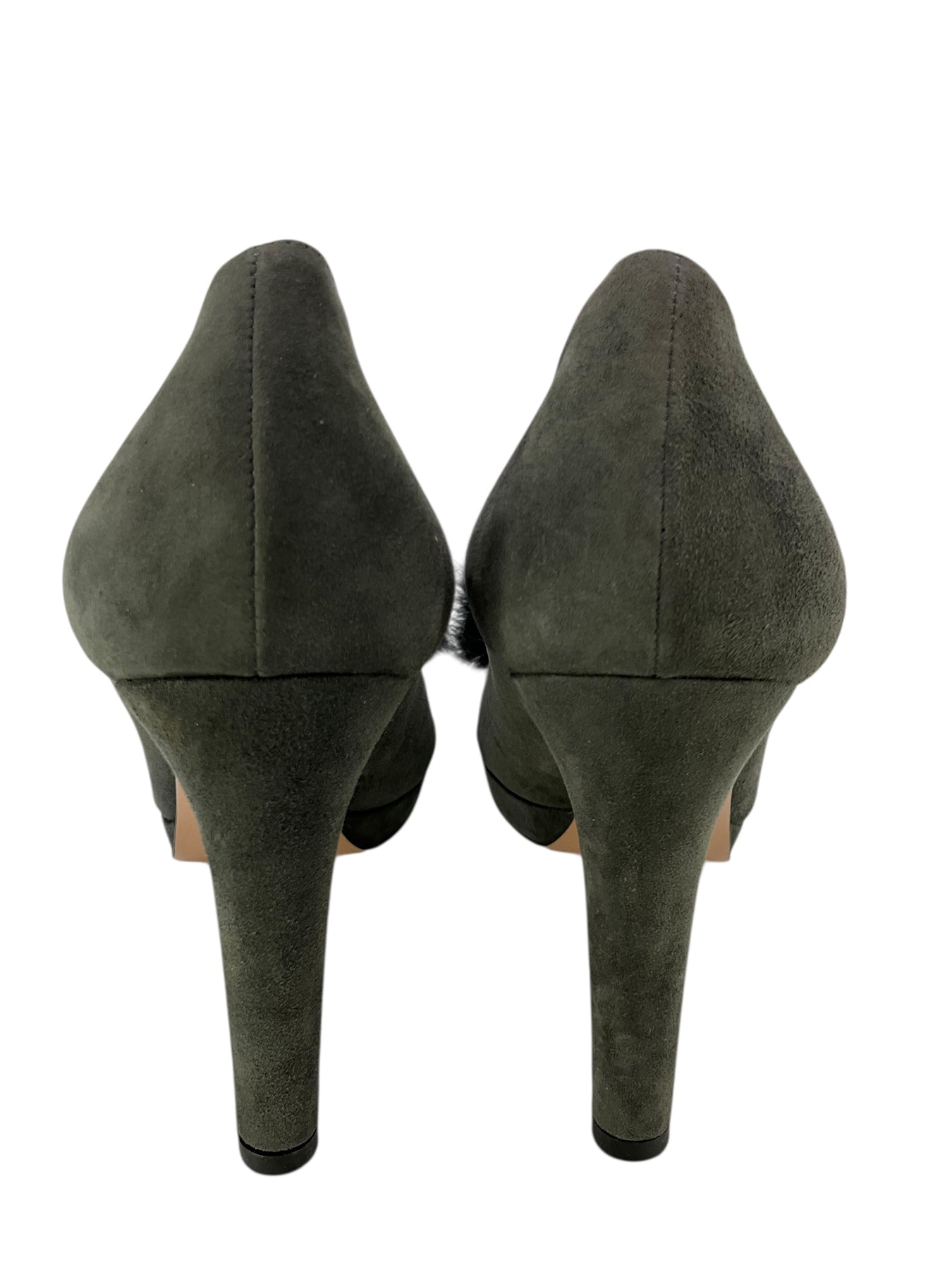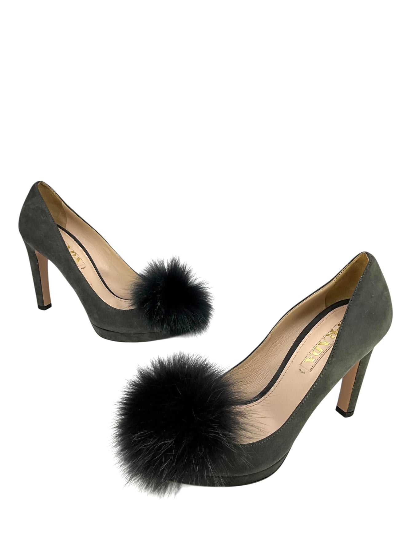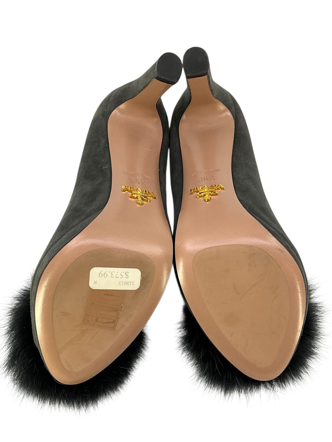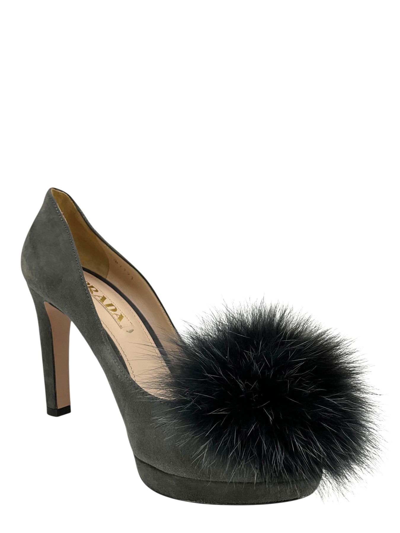 Step out in style with these gorgeous authentic Prada Suede Fur Pom Pom Pumps Size 6.5 crafted from gray suede. These gorgeous pumps feature a chic peep toe and buttery-soft fur pom poms on the vamp.