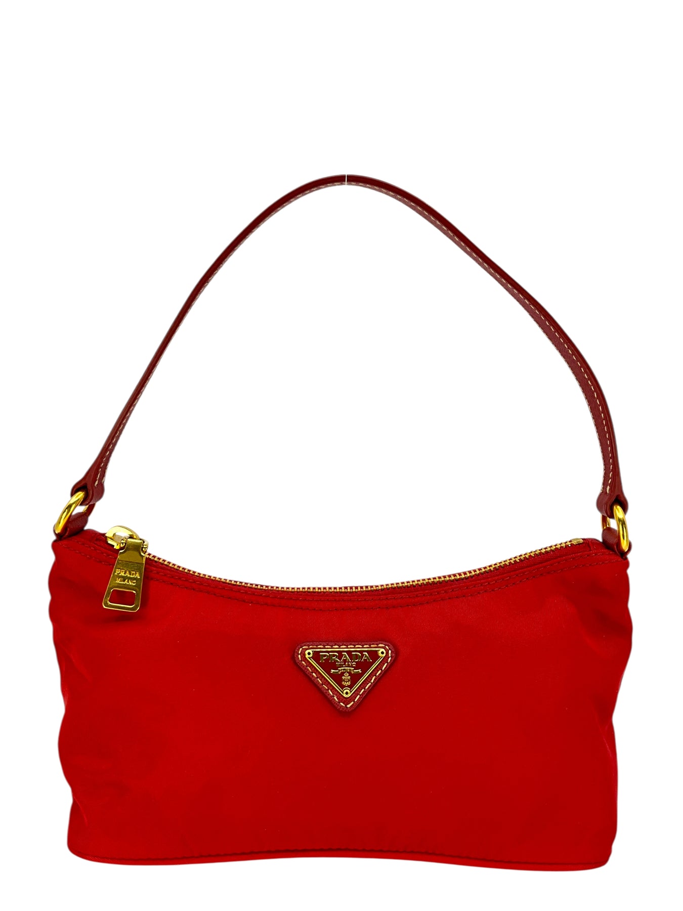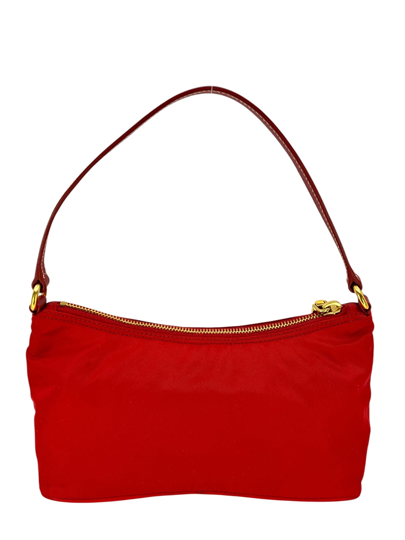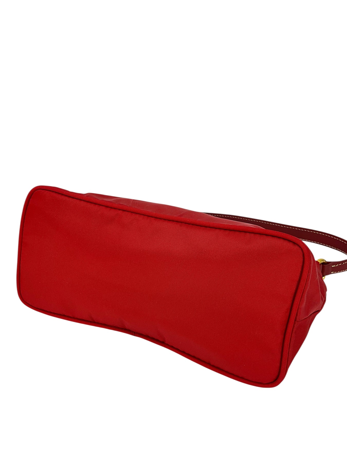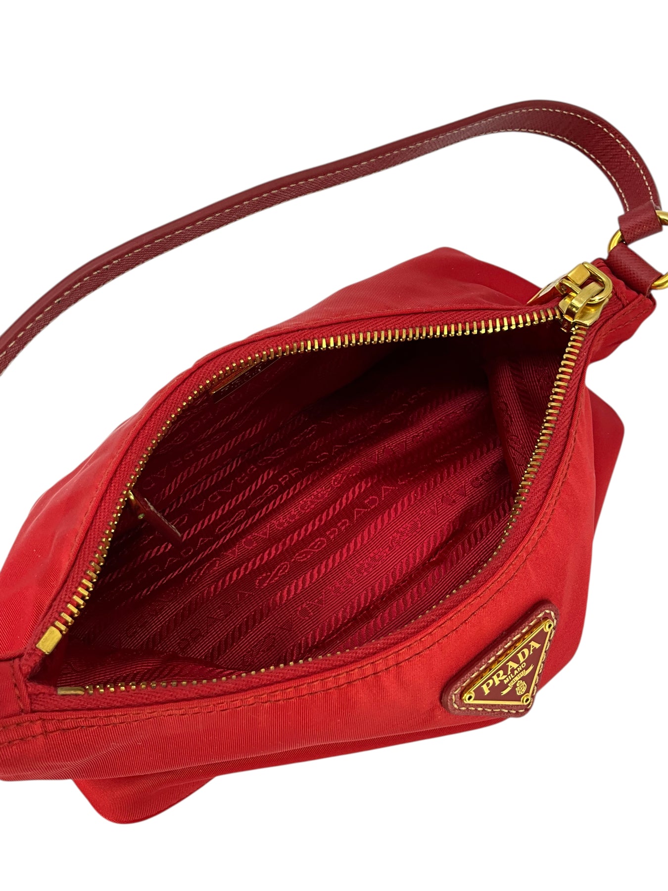 Add to your collection this guaranteed authentic Prada Tessuto Nylon Pochette crafted from red nylon with a tonal Saffiano leather shoulder strap. This chic bag features a signature triangle logo at front with a secure single zip closure.