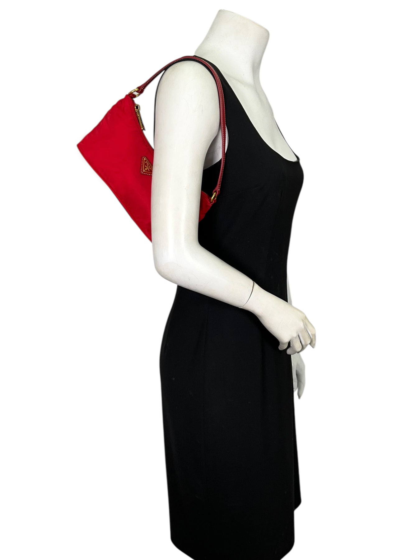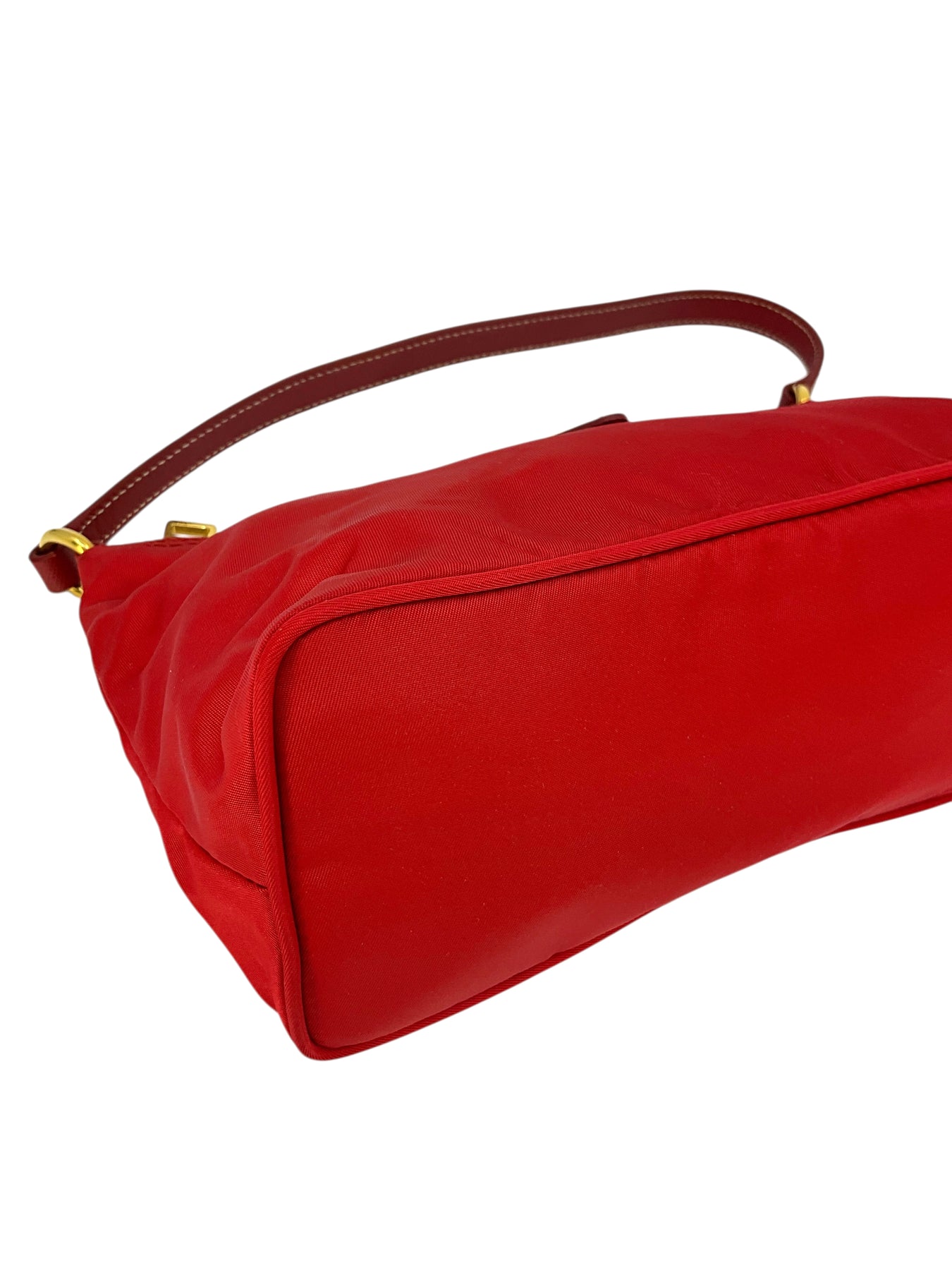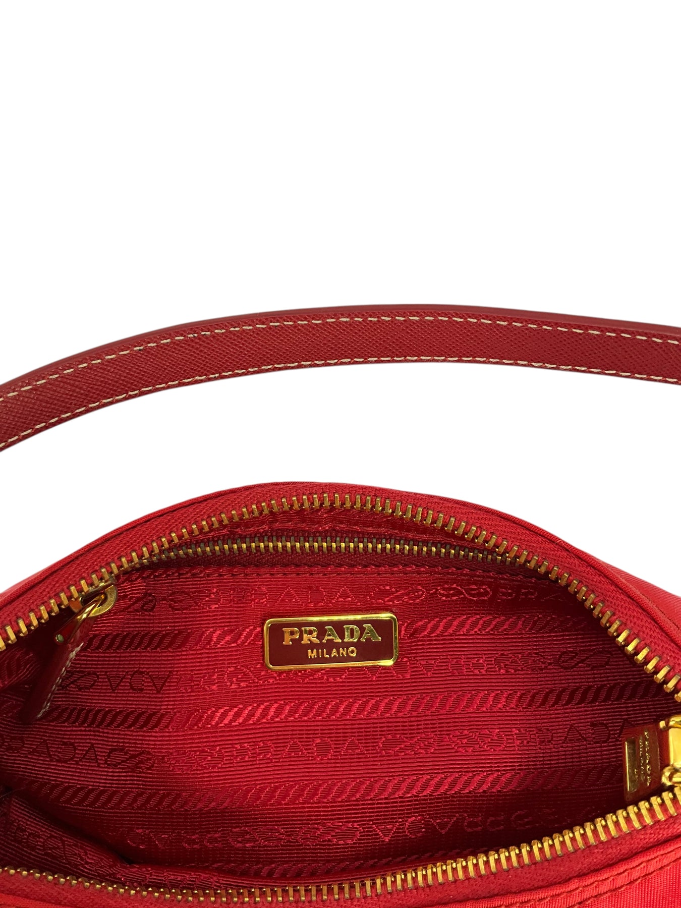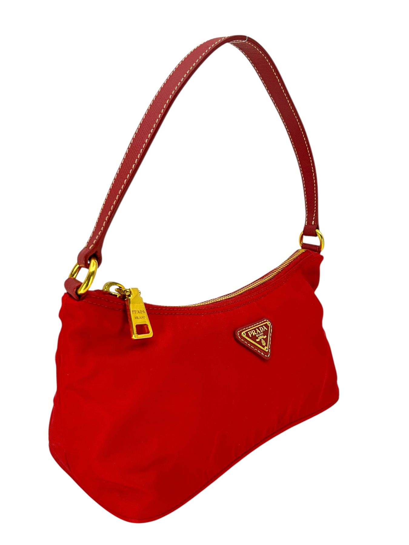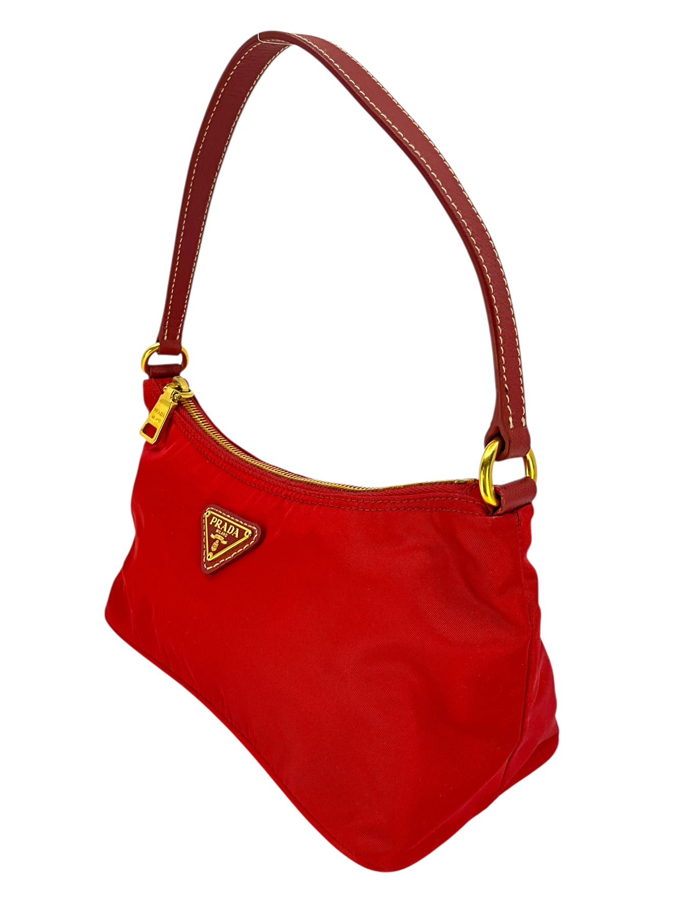 Add to your collection this guaranteed authentic Prada Tessuto Nylon Pochette crafted from red nylon with a tonal Saffiano leather shoulder strap. This chic bag features a signature triangle logo at front with a secure single zip closure.