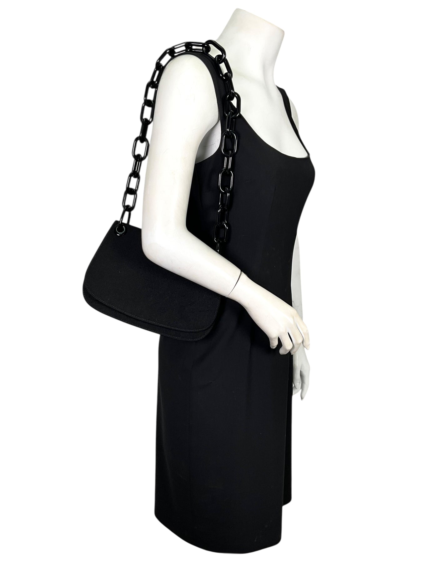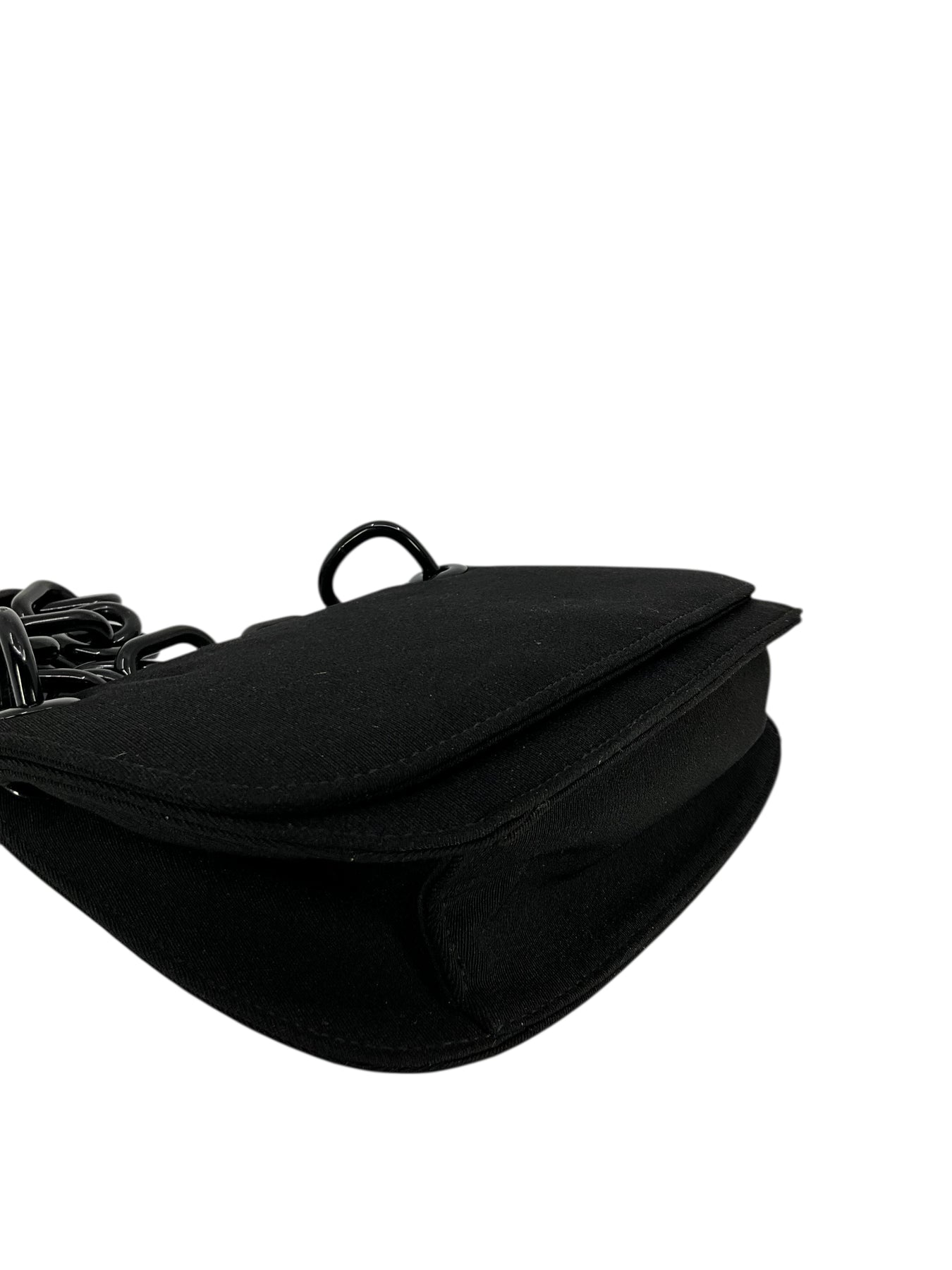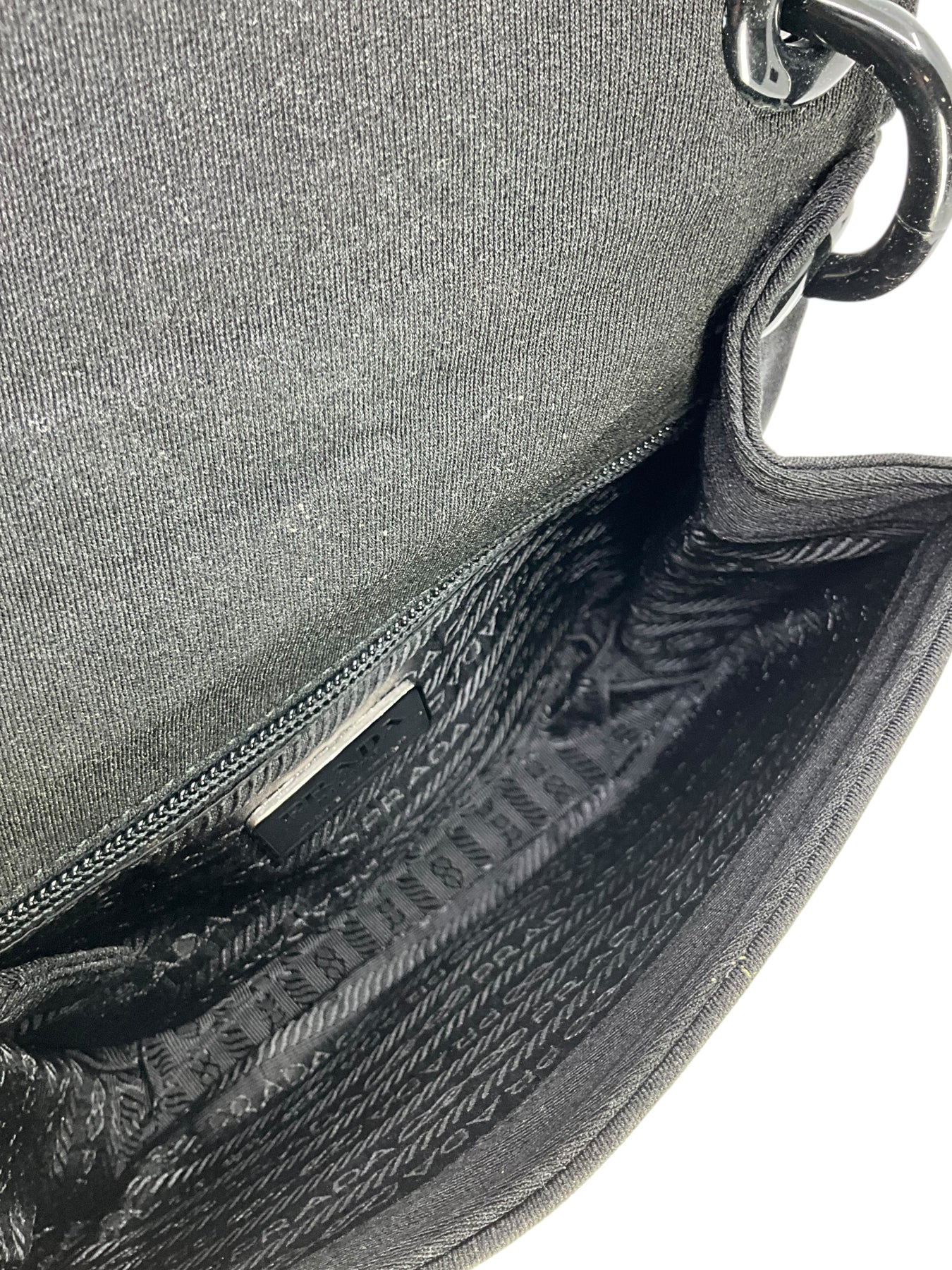 We guarantee the authenticity of this PRADA Tessuto Nylon Beaded Small Bag constructed of black nylon with a signature triangle logo at the back. Featuring a black plastic chain link shoulder strap and a secure front flap with a magnetic snap closure.