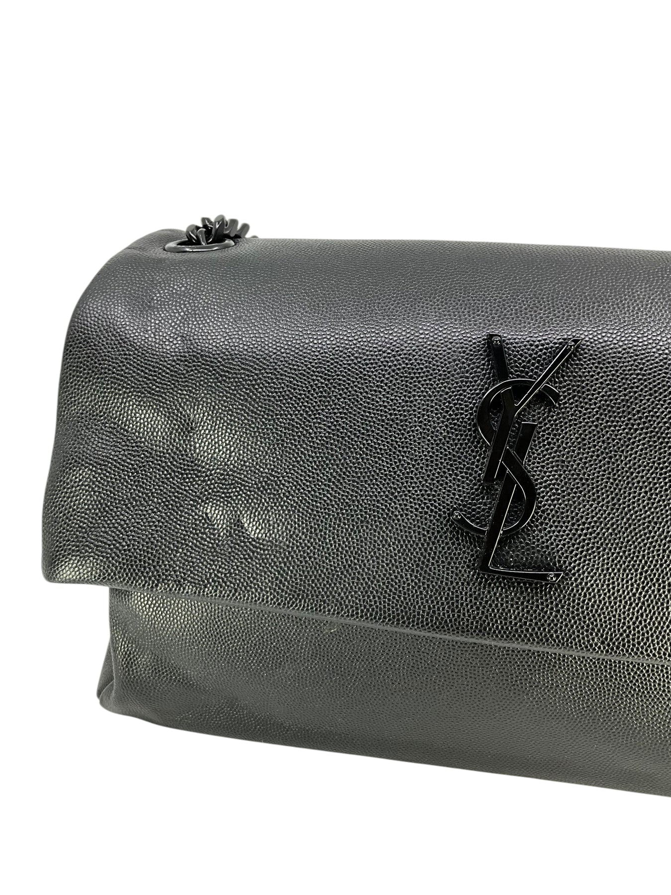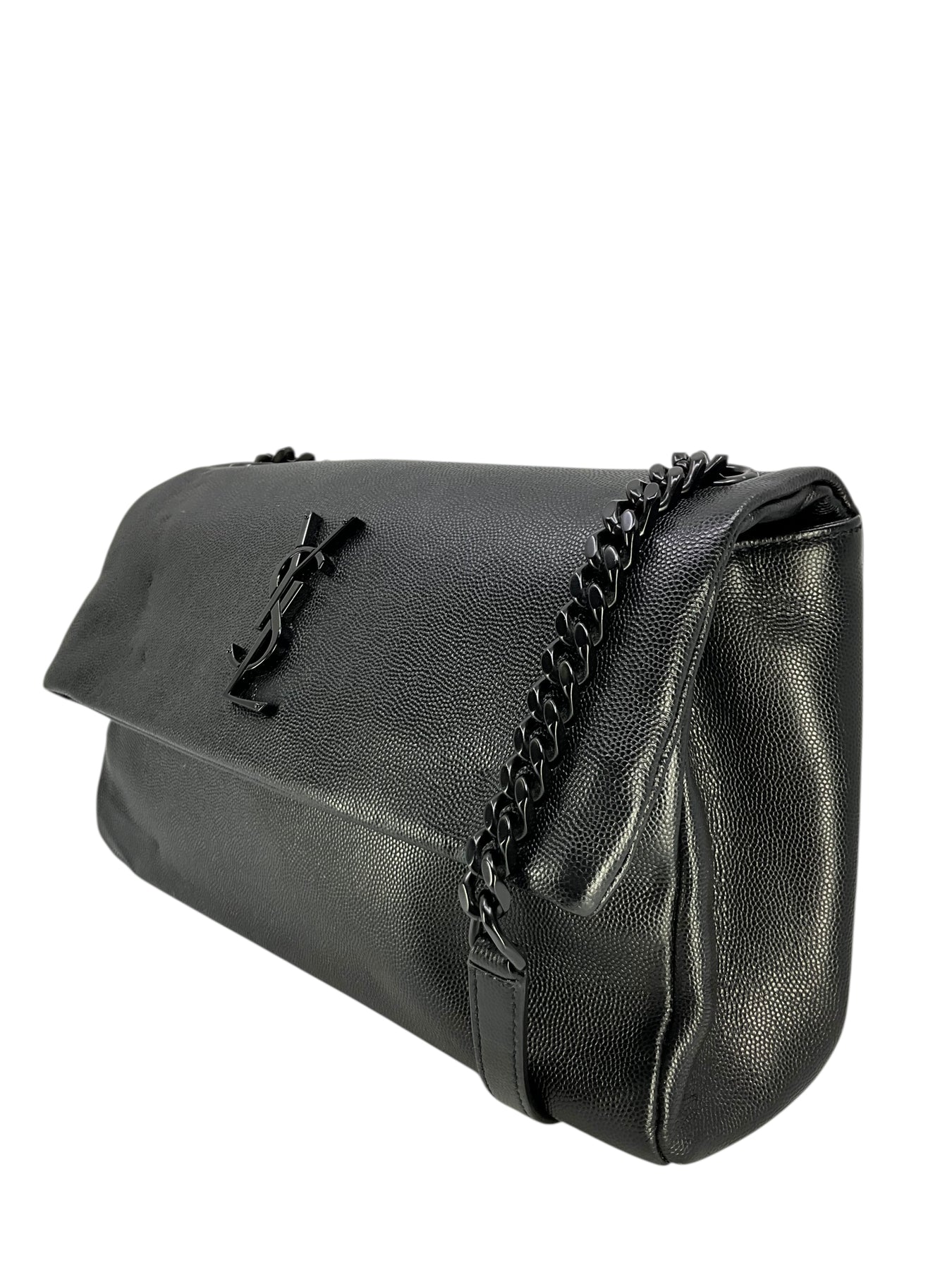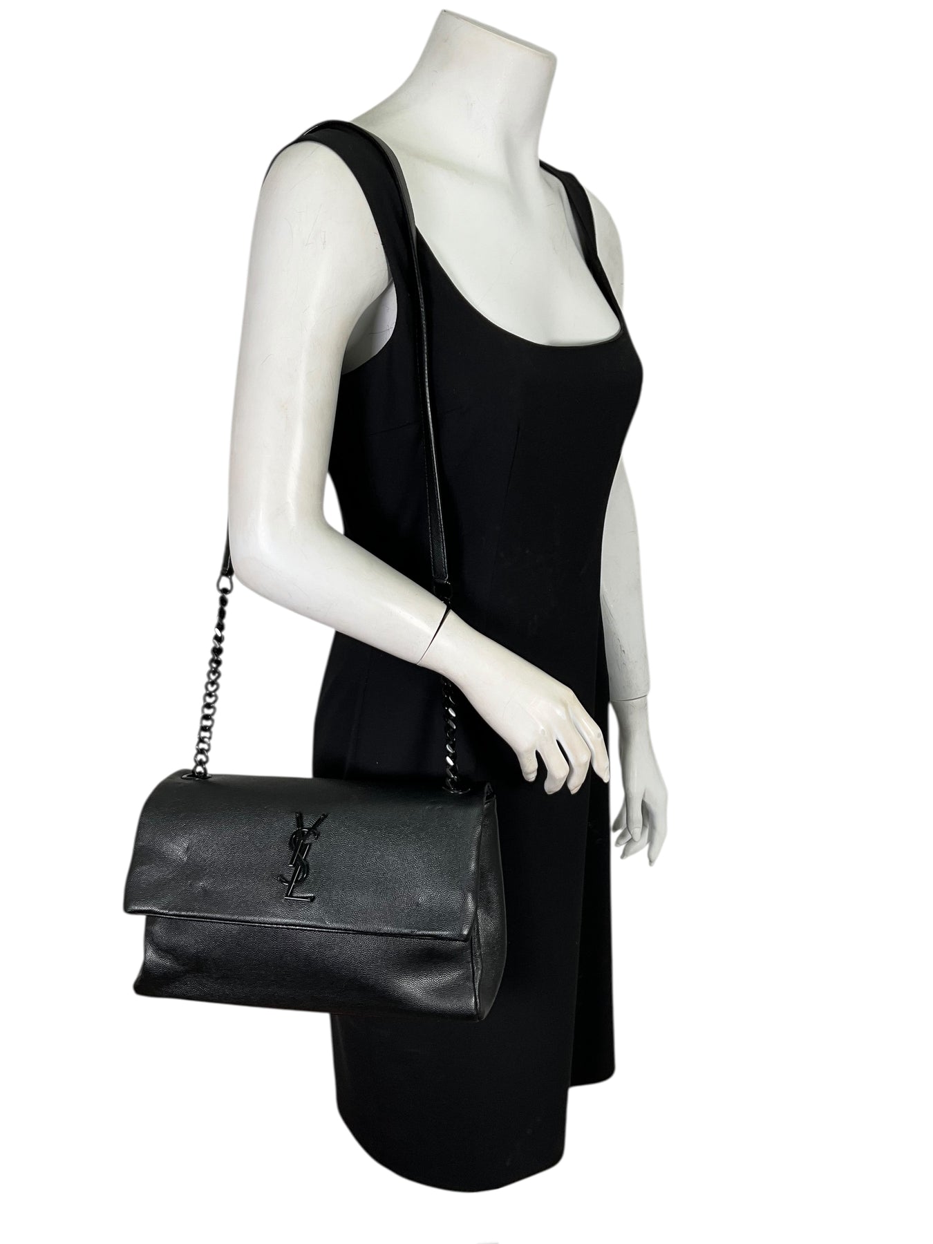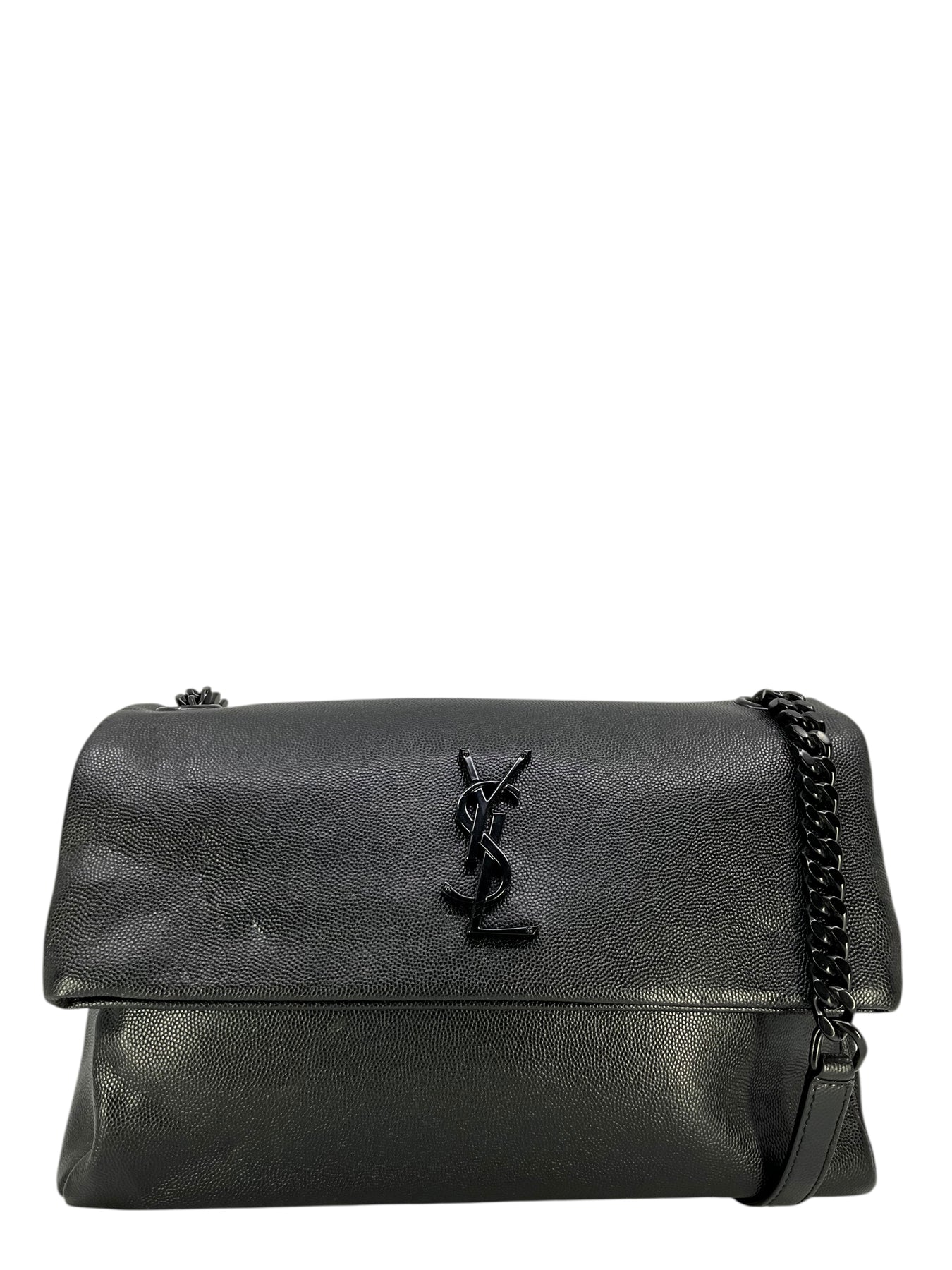 This guaranteed authentic Saint Laurent Medium West Hollywood Monogram Fold-Over Bag makes for the perfect everyday carry-all. Expertly crafted in Italy from black leather and tonal hardware. It features an adjustable chain link and leather shoulder strap and a signature metal monogram logo at front. The large front flap is secured by a magnetic snap closure and opens to a roomy interior finely lined in black textile fabric with a center dividing zip compartment and a patch pocket.