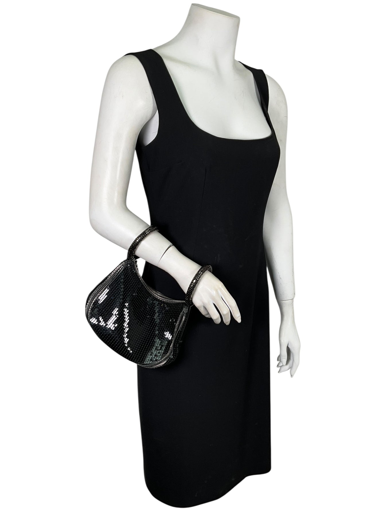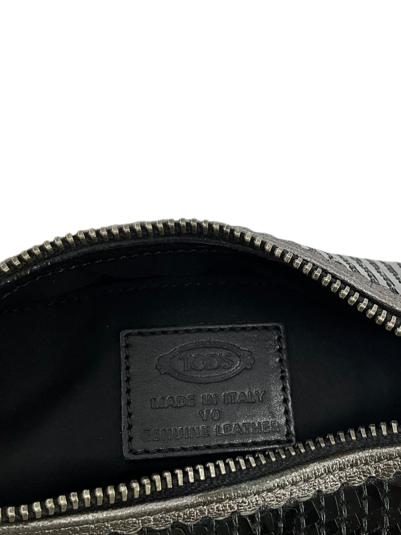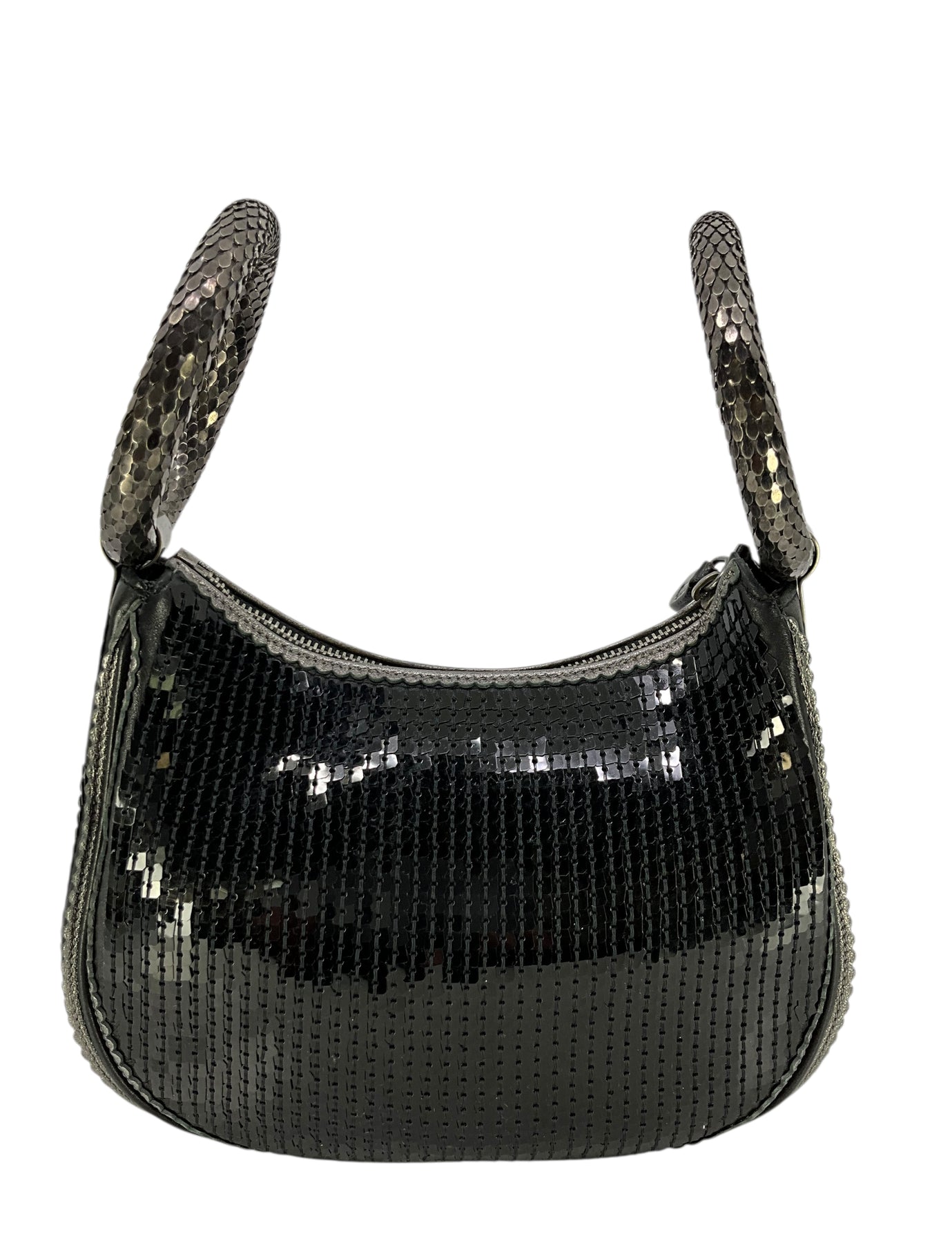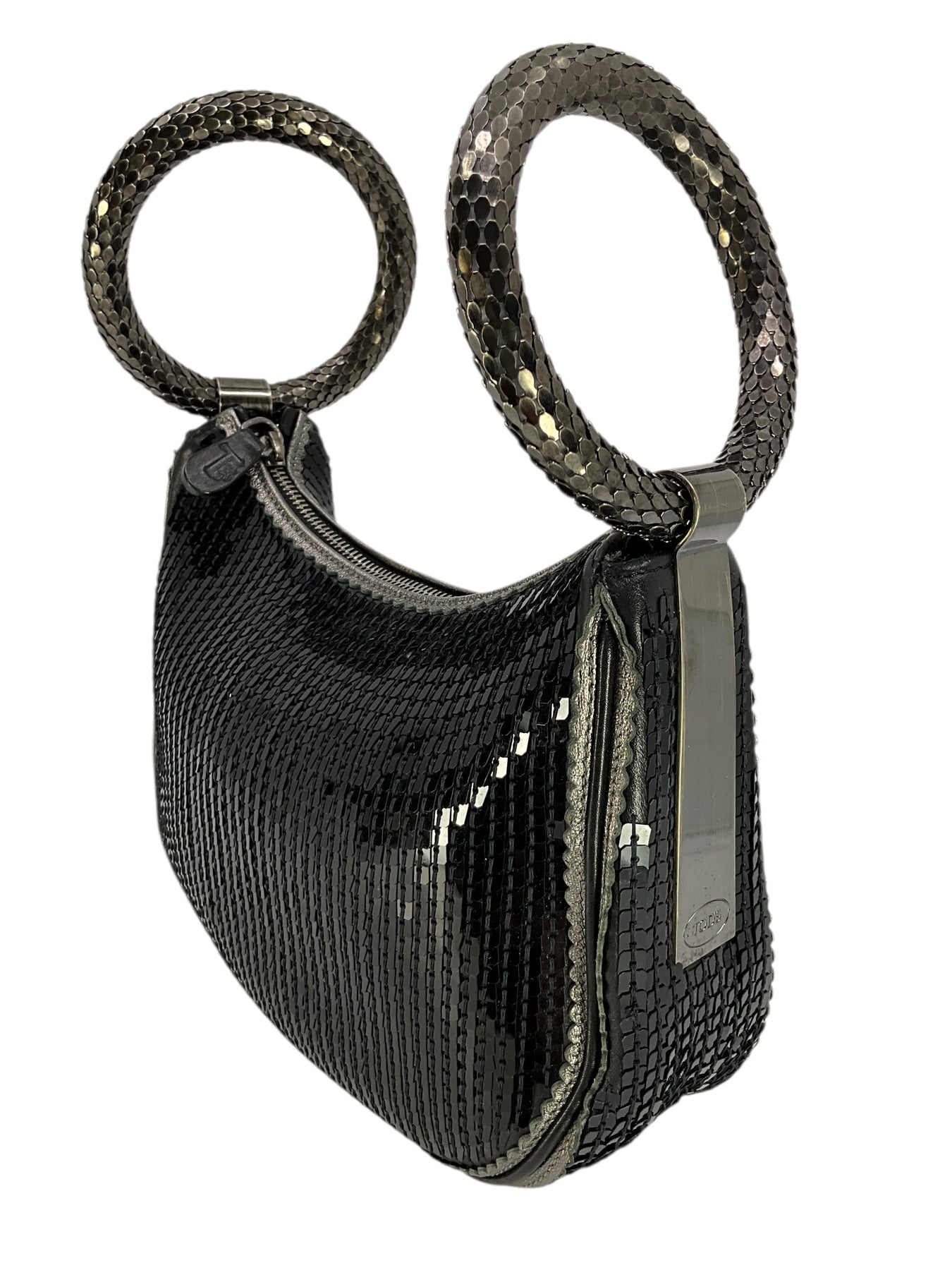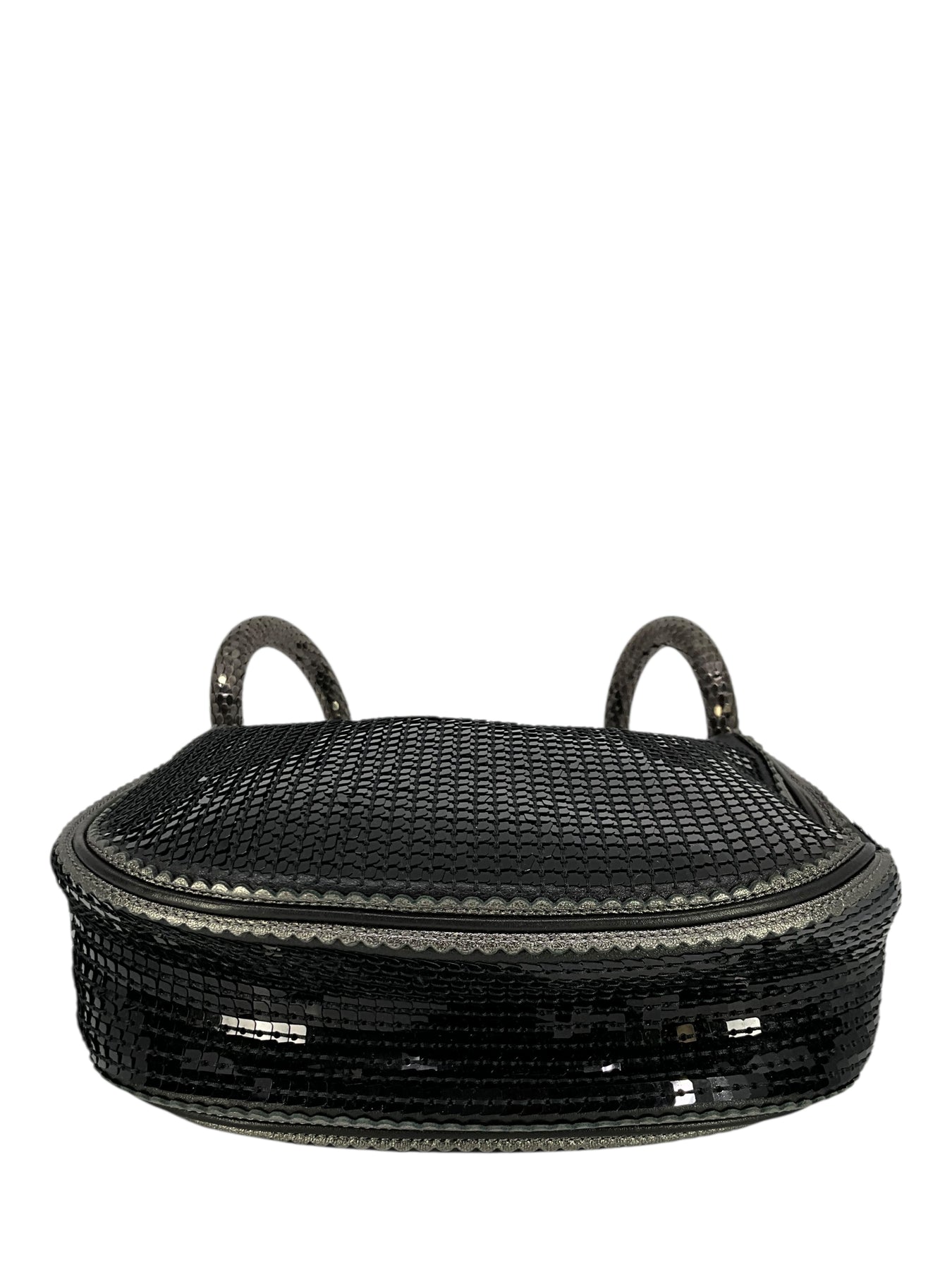 We guarantee the authenticity of this Tod's Sequins Top Handle Bag crafted in black sequins and gunmetal hardware. It features dual ring top handles and a signature metal logo plate at the sides.