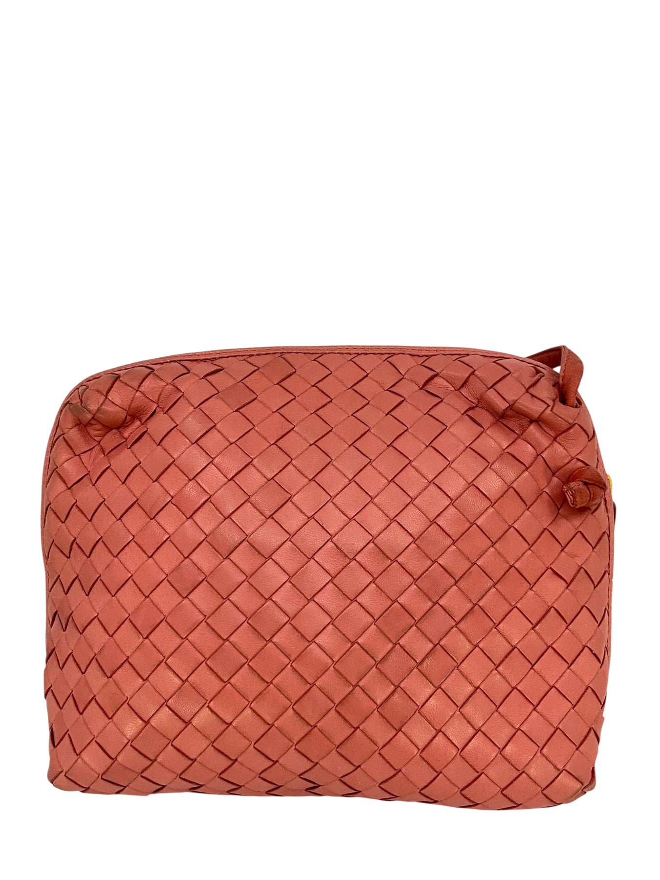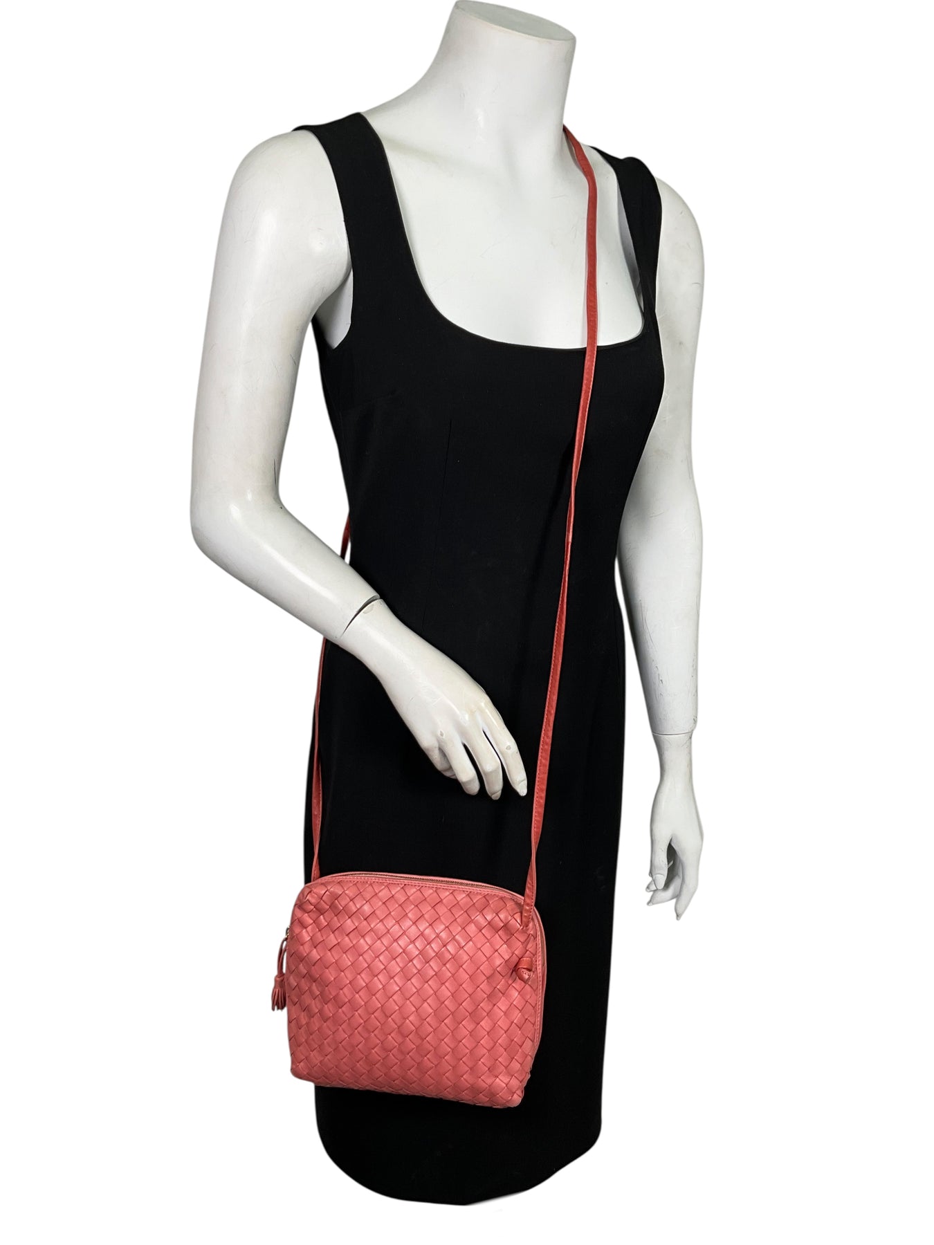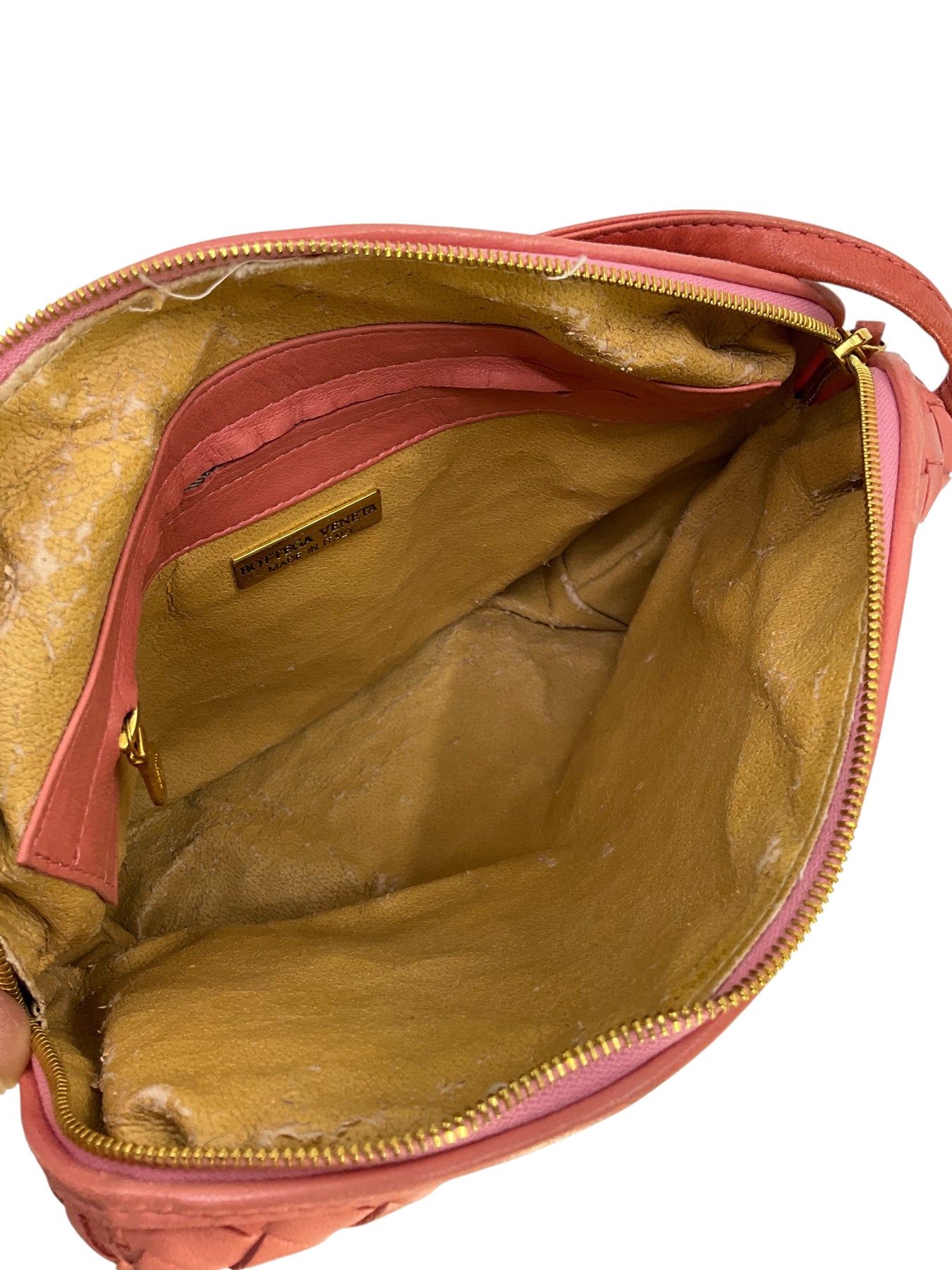 This is an authentic Bottega Veneta Vintage Nodini Intrecciato Crossbody Bag crafted in signature tightly woven salmon pink Intrecciato nappa leather. It features a thin leather crossbody strap and a spacious interior lined in smooth leather with a zipper pocket.